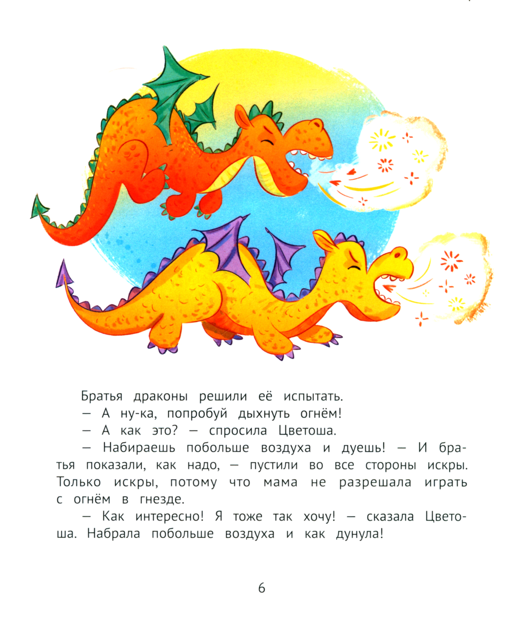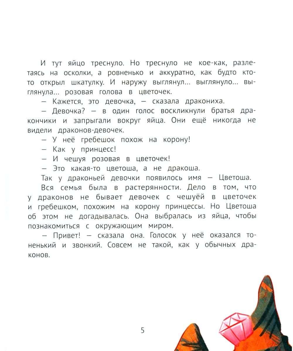 Обычная жизнь семьи драконов изменилась в тот момент, когда в гнезде появилось очень странное яйцо. Оно было розовое и в цветочек! Но настоящий переполох начался, когда на свет вылупилась девочка дракон, ничуть не похожая на своих братьев. «Цветоша какая-то!» - сказали они. Подумать только, вместо огня и дыма она умела выдыхать лишь цветочные лепестки и радугу! Разве выйдет толк из такого дракона? Быть непохожей на остальных очень сложно, но если внимательно присмотреться, то обязательно найдутся сильные стороны, которые помогут Цветоше отыскать свой путь в жизни, встретить друзей и осуществить мечту.