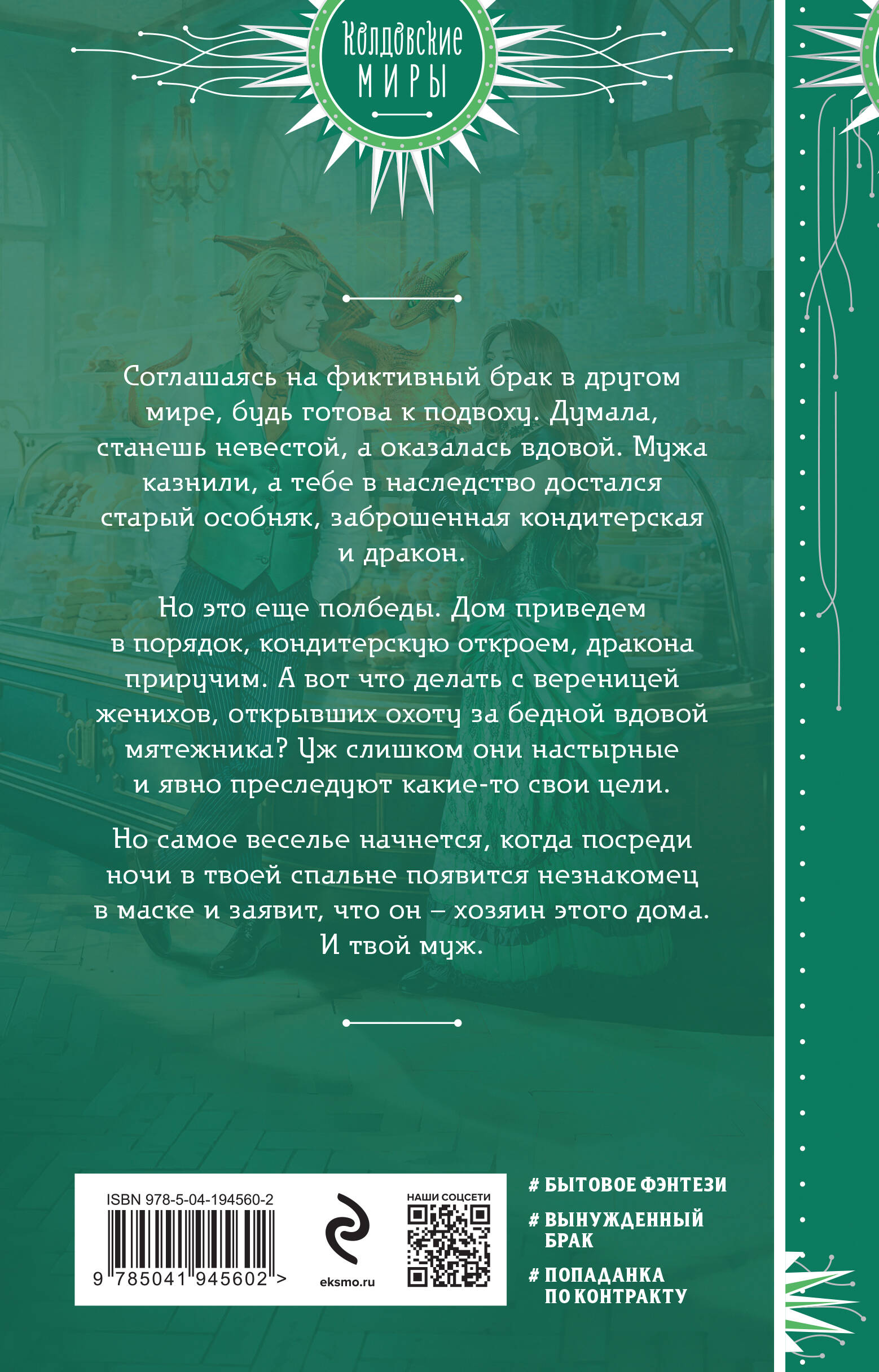 Соглашаясь на фиктивный брак в другом мире, будь готова к подвоху. Думала, станешь невестой, а оказалась вдовой. Мужа казнили, а тебе в наследство достался старый особняк, заброшенная кондитерская и дракон. Но это еще полбеды. Дом приведем в порядок, кондитерскую откроем, дракона приручим. А вот что делать с вереницей женихов, открывших охоту за бедной вдовой мятежника? Уж слишком они настырные и явно преследуют какие-то свои цели. Но самое веселье начнется, когда посреди ночи в твоей спальне появится незнакомец в маске и заявит, что он - хозяин этого дома. И твой муж. Пять причин приобрести книгу: 1. Внезапный муж, кондитерская и дракон! Что может быть лучше? 2. Аромат кофе и выпечки, который будет преследовать вас всю книгу. 3. Очаровательная драконица с непростым характером. 4. Загадочный герой, склонный к авантюрам. 5. Героиня, которая найдет выход из любой ситуации.