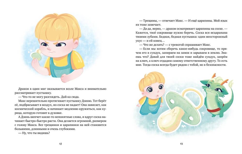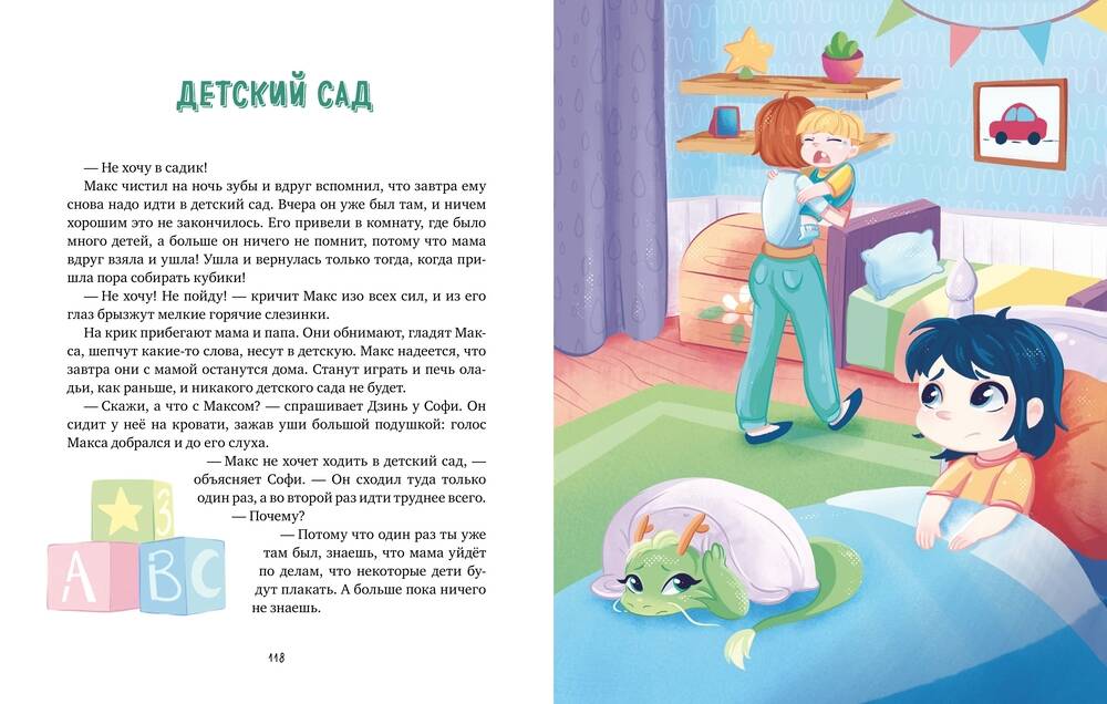 Первая книга новой серии развивающих книг от эксперта в области эмоционального интеллекта Виктории Шиманской. Истории для чтения вслух о самых важных вопросах дошкольников и младших школьников с пояснениями для родителей. Максу скоро два года. У него есть папа, мама, а ещё старшие брат и сестра, Дэн и Софи. Однажды в их доме появился неожиданный гость - волшебный дракончик Дзинь. Он знает, когда пора прощаться с соской, как подружиться с горшком, почему не надо бояться врачей и что делать, если не хочется есть папин суп. Дзинь - мудрый дракон из древней драконьей династии. В конце каждой истории родителей ждут рекомендации для комфортного проживания ярких эмоций ребенка. В первую книгу серии вошли истории о двухлетнем Максе. Затем серию продолжат рассказы о его пятилетней сестре Софи и девятилетнем брате Дэне и о задачках, которые приходится решать им и их родителям каждый день. Фишки книги: - Рассказы для чтения вслух об основных проблемах младшего возраста - Простые пояснения и советы для родителей. В конце каждой истории автор дает рекомендации родителям для комфортного проживания ярких эмоций ребенка - Волшебный герой, который знает ответы на все вопросы - История про семью с тремя детьми разного возраста, в которой читатели узнают себя - Яркие иллюстрации на каждой странице - Рассказы, которые помогут малышу прожить эмоции Для кого эта книга: Для детей от 2 лет От автора: Что самое сложное в жизни с маленьким ребёнком? Может быть, бессонные ночи? Или капризы? Я думаю - эмоции. Жизнь родителей наполнена ими: детский восторг, испуг, гнев, стыд, удивление... Нас, взрослых, привыкших мыслить рационально, такой неуправляемый поток чувств просто сбивает с ног. Первое, что хочется сделать, - бороться с этой стихией. Упорядочивать, выпрямлять, контролировать... Но эмоции сильны и всегда одерживают верх. А может быть, не бороться? Прислушаться. Постараться уловить некий ритм среди хаоса, подстроиться под него, поддаться. Если нам это удаётся, мы начинаем реже грозить пальцем и повышать голос на малыша, легко избегаем открытых конфликтов, где родители требуют повиновения, "потому что так надо", а дети гневаются и капризничают. Это касается любых ситуаций, через которые проходит каждый ребёнок: битвы за соску, приучения к горшку, отхода ко сну, первых попыток уйти от разговора или соврать, сложностей начальной школы. Наша книга помогает улавливать потоки детских эмоций. Читая ребёнку вслух истории о Максе, Софи и Дэне, вы сможете вместе прожить сложные эмоциональные моменты, будете сопереживать героям, узнавать в них себя, примерять ситуации.