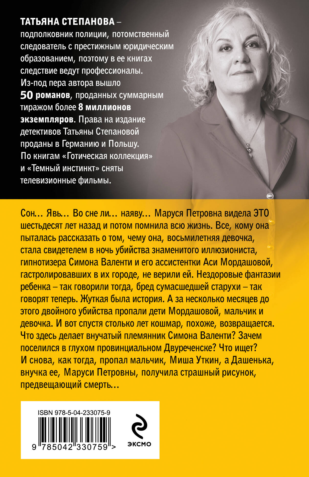 Сон… Явь… Во сне ли… наяву.. Маруся Петровна видела ЭТО шестьдесят лет назад и потом помнила всю жизнь. Все, кому она пыталась рассказать то, чему она, восьмилетняя девочка, стала свидетелем в ночь убийства знаменитого иллюзиониста, гипнотизера Симона Валенти и его асссистентки Аси Мордашовой, гастролировавших в их городе, не верили ей. Нездоровые фантазии ребенка - так говорили тогда, бред сумасшедшей старухи - так говорят теперь. Жуткая была история. А за несколько месяцев до этого двойного убийства пропали дети Мордашовой, мальчик и девочка. И вот спустя столько лет кошмар, похоже, возвращается. Что здесь делает внучатый племянник Симона Валенти? Зачем поселился в глухом провинциальном Двуреченске? Что ищет? И снова, как тогда, пропал мальчик Миша Уткин, а Дашенька, внучка ее, Маруси Петровны, получила страшный рисунок, предвещающий смерть… Романы потомственного следователя Татьяны Степановой позволяют читателю побывать в литературной «комнате страха». Таинственные убийства, почти осязаемая атмосфера преступления, томительное и тревожное ожидание чего-то неведомого, пугающего... Все это Татьяне Степановой удается воспроизвести просто блестяще. Случайные встречи, повседневные дела, незначительные детали изображаются в ее детективах в каком-то особом, драматическом свете, словно безобидный весенний луг перед стремительно надвигающейся грозой.| Издательство | ООО "Издательство "Эксмо" |