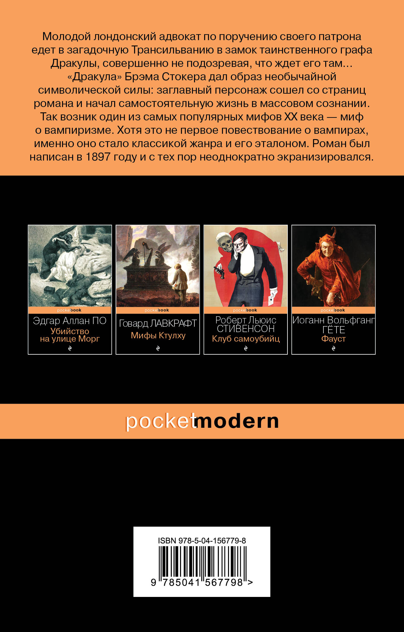 Молодой лондонский адвокат по поручению своего патрона едет в загадочную Трансильванию в замок таинственного графа Дракулы, совершенно не подозревая, что ждет его там... Культовый роман о вампирах, супербестселлер всех времен и народов. В кропотливой исследовательской работе над ним Стокер провел восемь лет, изучал европейский и в особенности ирландский фольклор, мифы, предания и любые упоминания о вампирах и кровососах. «Дракула» был написан еще в 1897 году и с тех пор выдержал множество переизданий. Его неоднократно экранизировали, в том числе такой мэтр кинематографа, как Фрэнсис Форд Коппола.| Издательство | ООО "Издательство "Эксмо" |