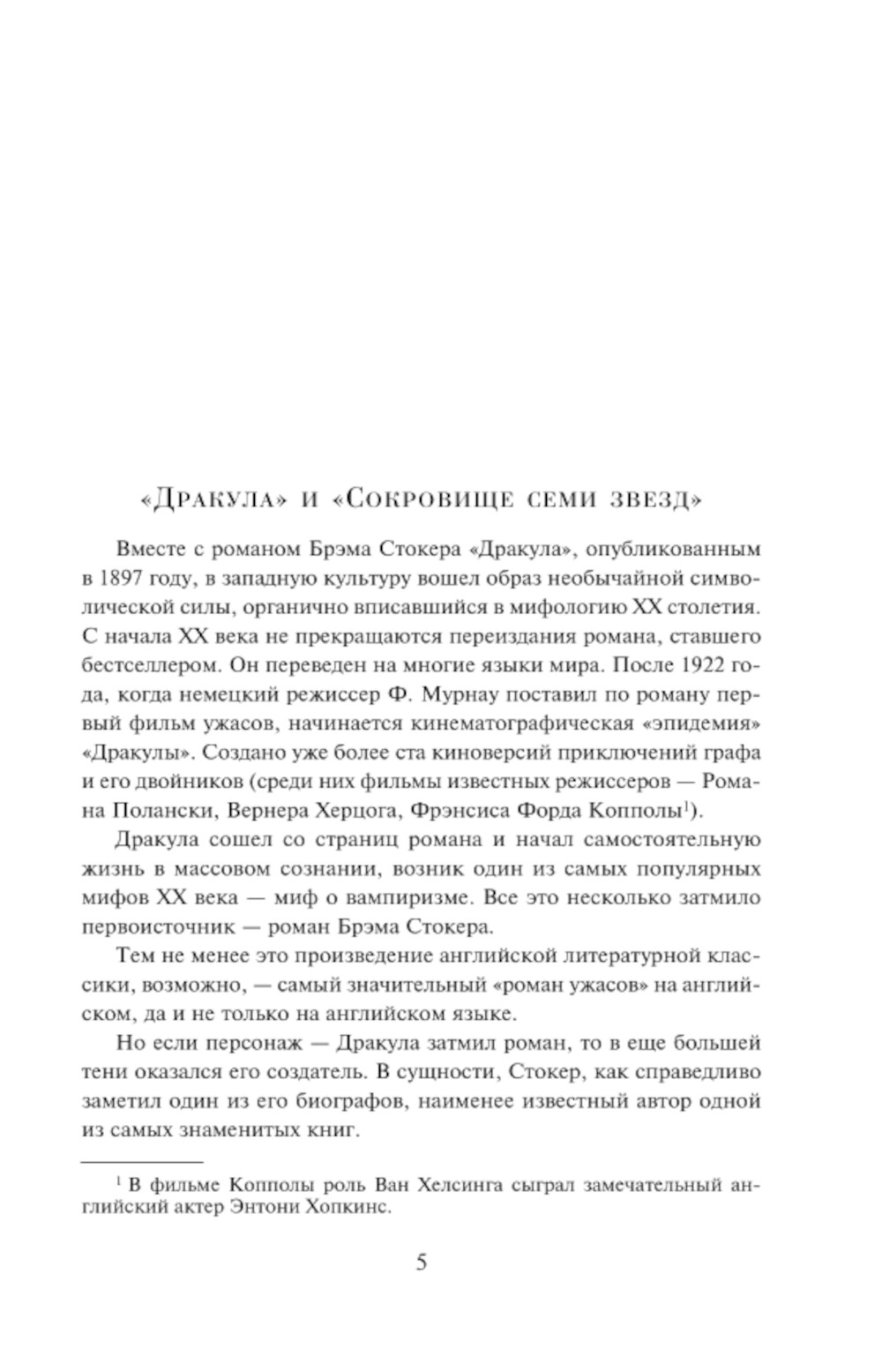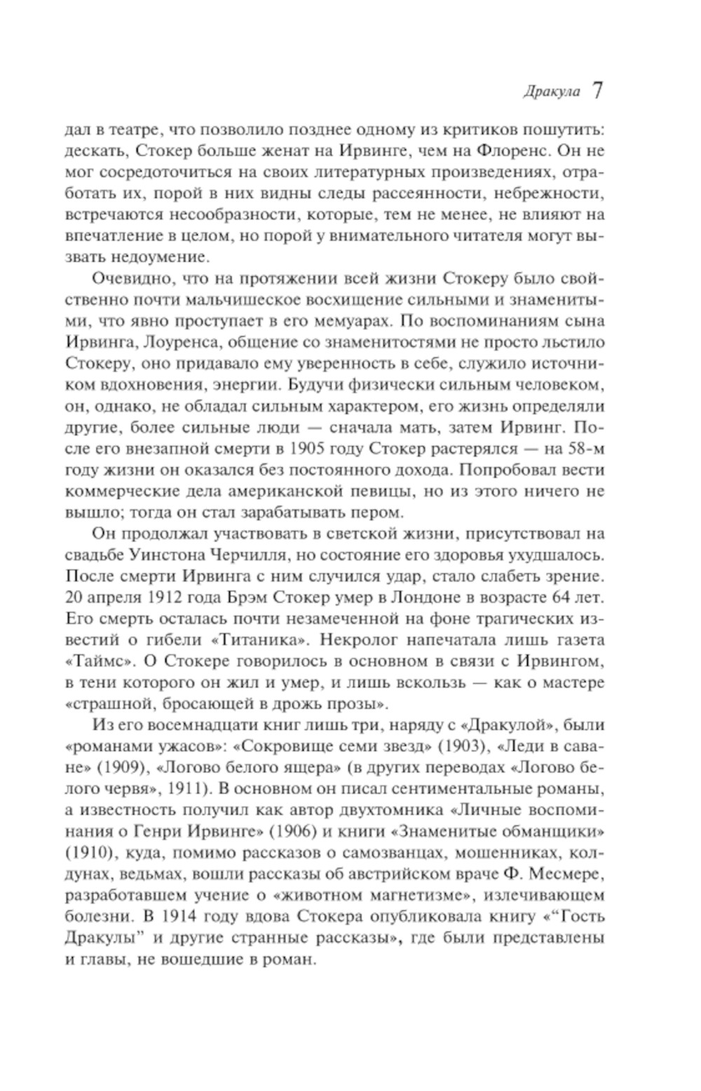 Деловая поездка Джонатана Харкера в далекую Трансильванию превращается в настоящий кошмар. Запертый в замке Дракулы, Харкер уже не верит, что когда-нибудь сможет вернуться домой и воссоединиться со своей невестой Миной Мюррей. Едва избежав смерти, Харкер возвращается, чтобы защитить свою невесту, вместе с доктором Ван Хельсингом и его друзьями он предпринимает отчаянную попытку уничтожить Князя Тьмы и других Детей Ночи... «Дракула» Брэма Стокера дал западной культуре образ необычайной символической силы: виртуозно изображенный заглавный персонаж сошел со страниц романа и начал самостоятельную жизнь в массовом сознании. Так возник один из самых популярных мифов XX века - миф о вампиризме. Хотя «Дракула» - далеко не первое повествование о вампирах, именно оно стало подлинной классикой жанра и его эталоном. Одно из главных произведений английской литературы ужаса впечатляет неожиданными и нетривиальными поворотами сюжета, эротическими подтекстами, изображением кошмаров и чудес, зыбкостью границ между жизнью и смертью, реальным и фантастическим. Издание сопровождается предисловием и комментариями переводчицы Татьяны Красавченко.| Издательство | Эксмо |