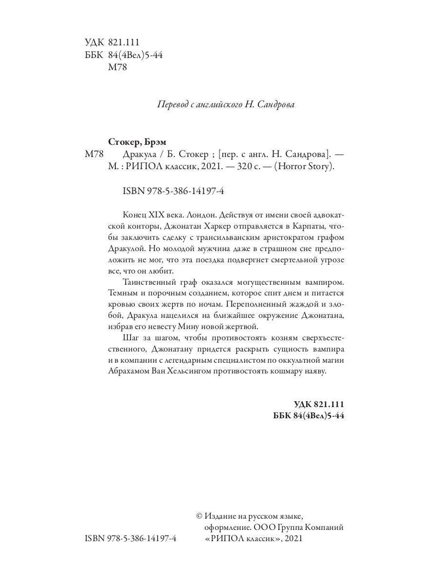 Конец XIX века. Лондон. Действуя от имени своей адвокатской конторы, Джонатан Харкер отправляется в Карпаты, чтобы заключить сделку с трансильванским аристократом графом Дракулой. Но молодой мужчина даже в страшном сне предположить не мог, что эта поездка подвергнет смертельной угрозе все, что он любит. Таинственный граф оказался могущественным вампиром. Темным и порочным созданием, которое спит днем и питается кровью своих жертв по ночам. Переполненный жаждой и злобой, Дракула нацелился на ближайшее окружение Джонатана, избрав его невесту Мину новой жертвой. Шаг за шагом, чтобы противостоять козням сверхъестественного, Джонатану придется раскрыть сущность вампира и в компании с легендарным специалистом по оккультной магии Абрахамом Ван Хельсингом противостоять кошмару наяву.| Издательство | Рипол Классик |