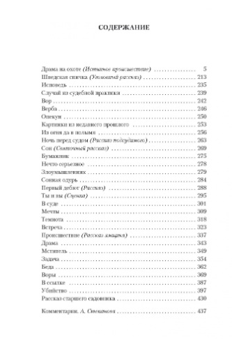 В сборник произведений А.П. Чехова, объединенных темой преступлений, вошли его рассказы и повести разных лет, а также роман «Драма на охоте» (по мотивам которого снят фильм «Мой ласковый и нежный зверь»). Кого-то из чеховских героев толкает на путь преступления бедность, кого-то - любовь. Растрата казенных денег, убийства, грабежи, мошенничество - обвиняемые предстают перед судом за различные преступления. Кто-то из них опустошен и безразличен к собственной участи, кто-то испытывает страх перед будущим, а кто-то не чувствует за собой вины. Чеховская художественная палитра настолько богата, что для каждой истории выбраны свои краски.