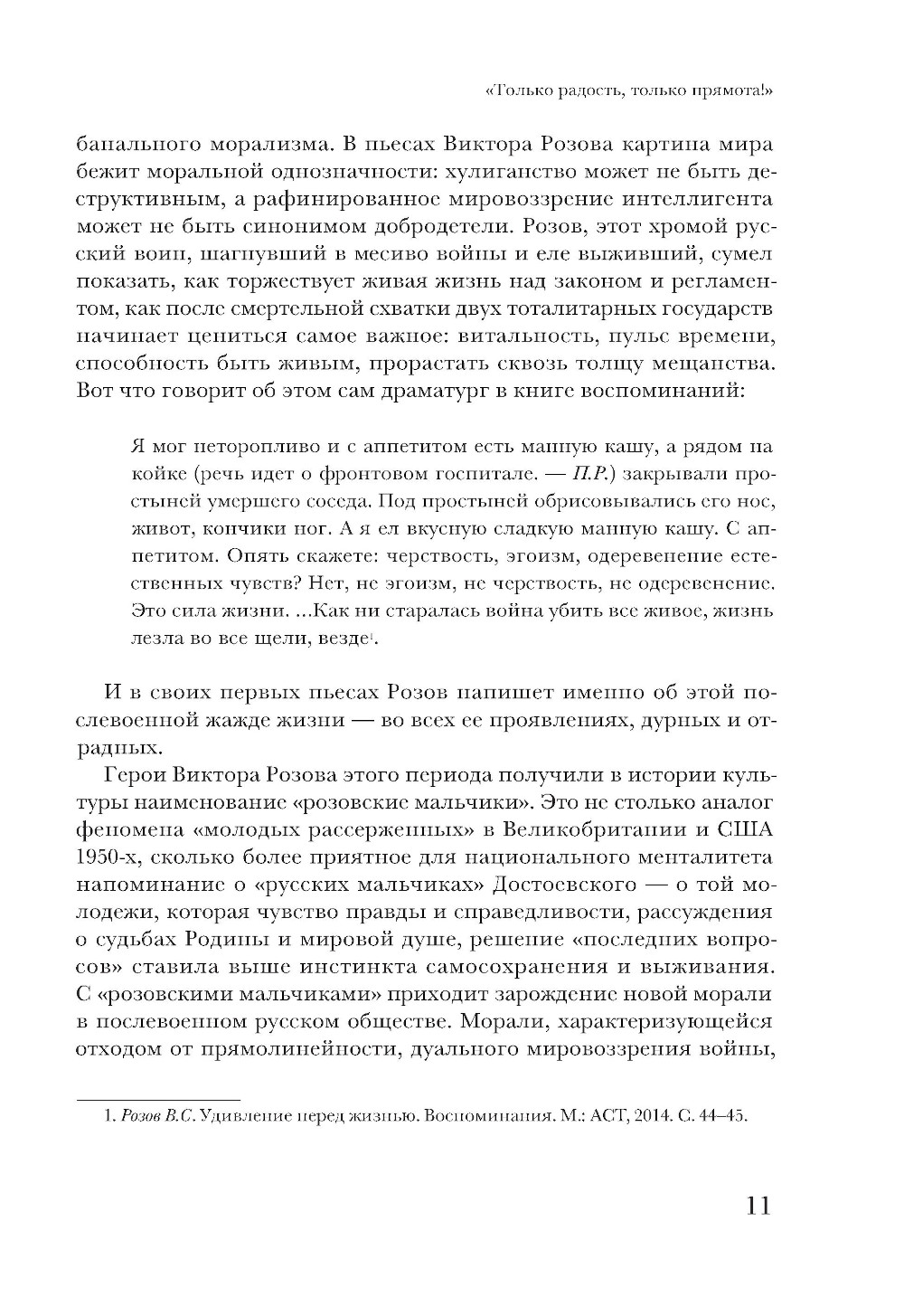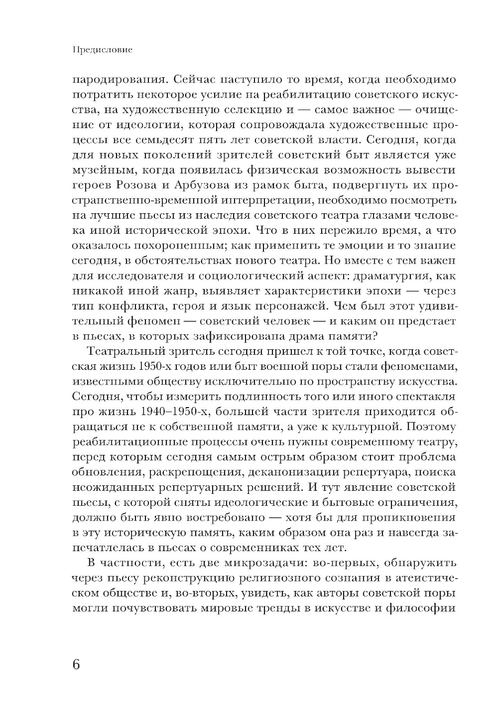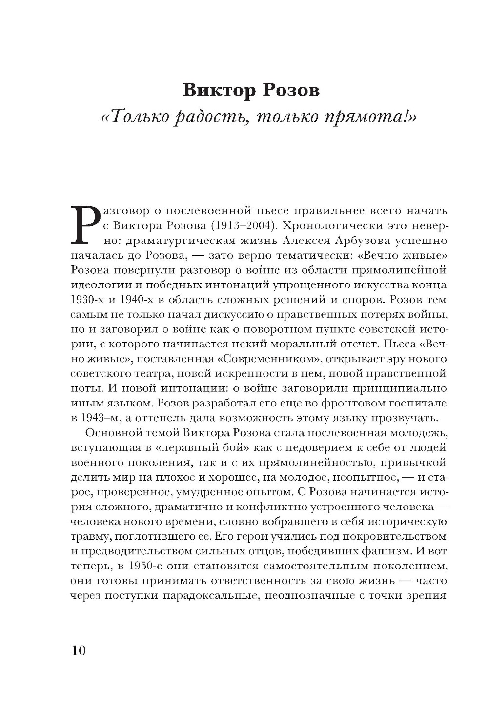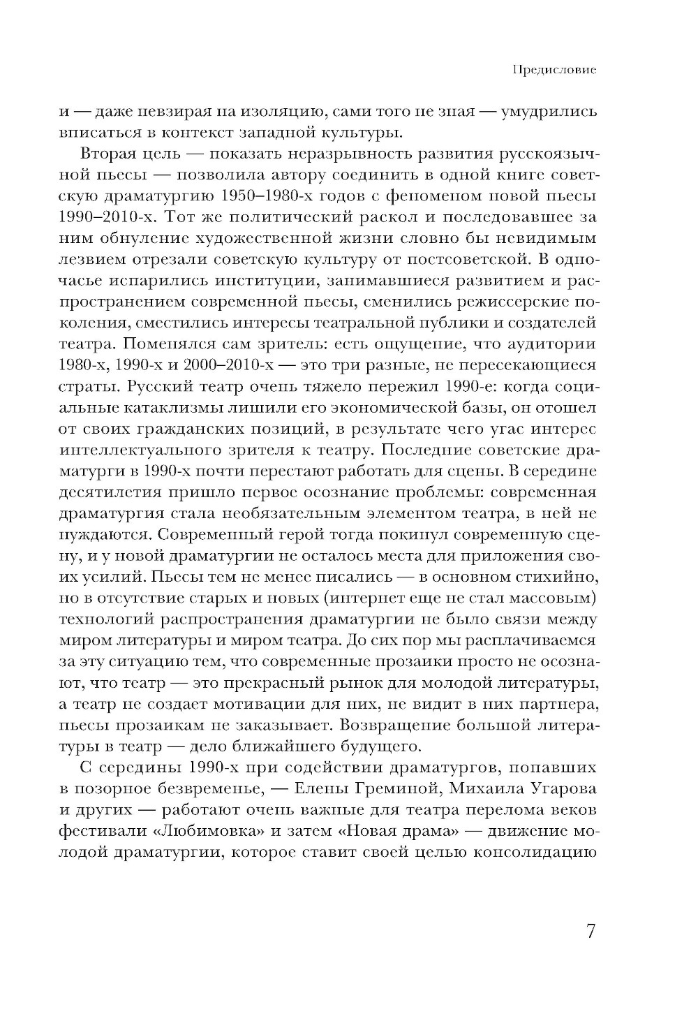 В монографии предпринята попытка представить картину советской послевоенной и постсоветской драматургии с 1950-х годов до наших дней, от В. Розова до И. Васьковской. У автора две задачи: взглянуть на развитие советской драматургии с точки зрения человека начала XXI века, когда канон советского театра более не властен над нынешней театральной реальностью, и поддержать идею непрерывности развития современной пьесы в России. Исследователь опровергает мнение о пропасти между поколениями и подчеркивает, что художественные и нравственные искания авторов советского периода не прерваны, а находят продолжение в драматургии новейшего времени. Книга представляет имена не только известных (А. Арбузов, А. Вампилов, Л. Петрушевская, В. Ерофеев, Н. Коляда, Е. Гришковец, В. Сигарев и другие), но и почти забытых авторов. Некоторые главы посвящены отдельным явлениям - производственной пьесе, «усадебной драматургии», «новой драме», документальному театру и т.д. П. Руднев - театральный критик, кандидат искусствоведения, помощник художественного руководителя МХТ им. А.П. Чехова и ректора Школы-студии МХАТ по спецпроектам. Автор монографии «Театральные взгляды Василия Розанова» (2003).| Издательство | Новое литературное обозрение |