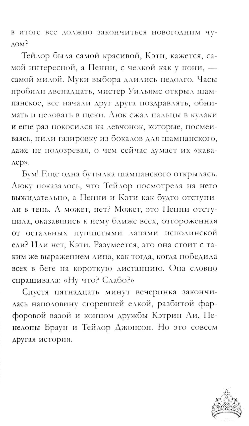 Когда-то Тейлор, Пенни и Кэтрин были подругами. Все изменила сгоревшая в Новый год елка и омела под потолком в доме Люка Уилсона. С тех пор прошло шесть лет. Пенни все так же влюблена в друга детства без надежды на взаимность. Ведь он звезда баскетбола, а она всего лишь заурядная девушка, поющая в хоре. Тейлор готовится стать королевой бала. Но, чтобы получить школьную корону, ей нужно найти спутника на вечер. Кэт занимается организацией школьного бала и воспитанием обаятельного хулигана, который норовит украсть ее сердце и превратить праздник в новогоднее безумие. Когда часы пробьют полночь, кому достанется корона, поцелуй и сердце красавчика?| Издательство | Клевер-Медиа-Групп |