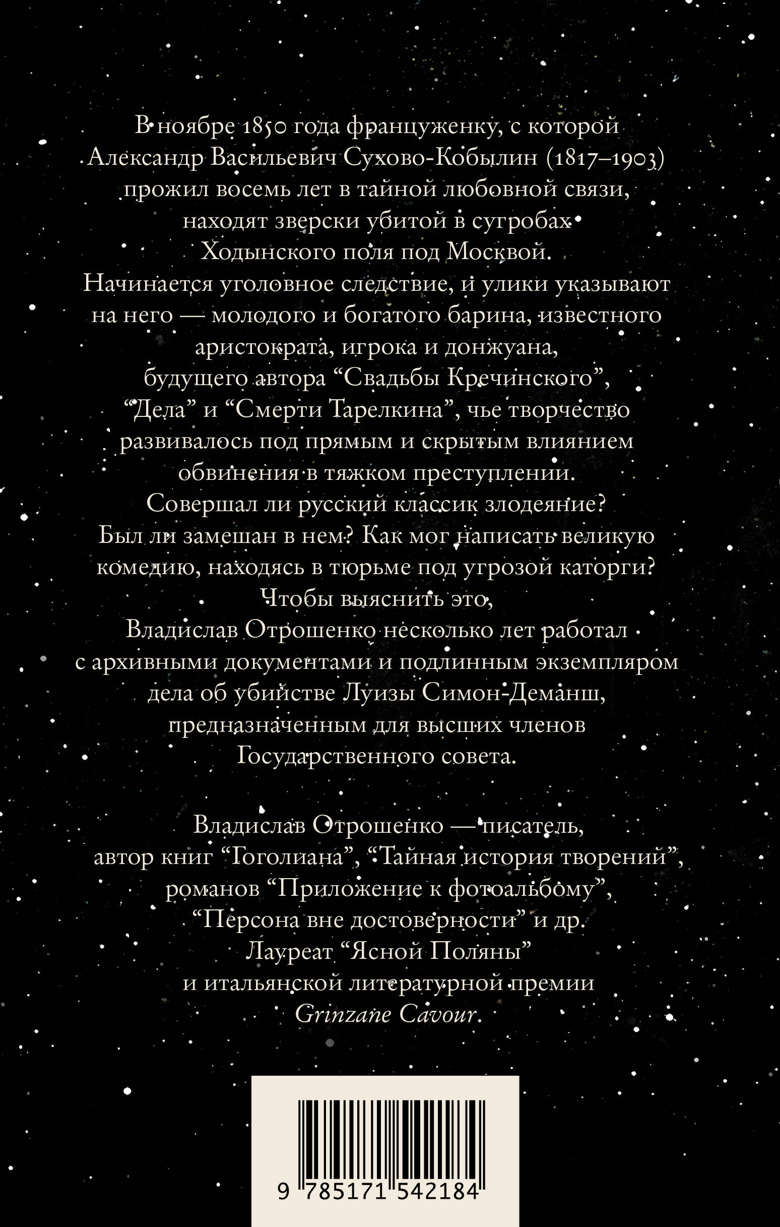 Исторический детектив в литературном салоне. Расследование одного из самых загадочных сюжетов русской литературы XIX века: причастность писателя А.В. Сухово-Кобылина к убийству его возлюбленной. Книга Владислава Отрошенко будет интересна всем, кто любит исторические детективы, историю России XIX века, русскую литературу и русский классический театр. Каждый найдет в ней новый для себя факт, сюжет или имя. Единственное, чего не найдет читатель, - это окончательных ответов. Тому, кто возьмет в руки эту книгу, придется самому ответить на вопрос «Виновен ли Сухово-Кобылин в убийстве Луизы Симон-Деманш?» - автор для этого дает читателю все факты, художественный нерв и объемную картину свершившегося.