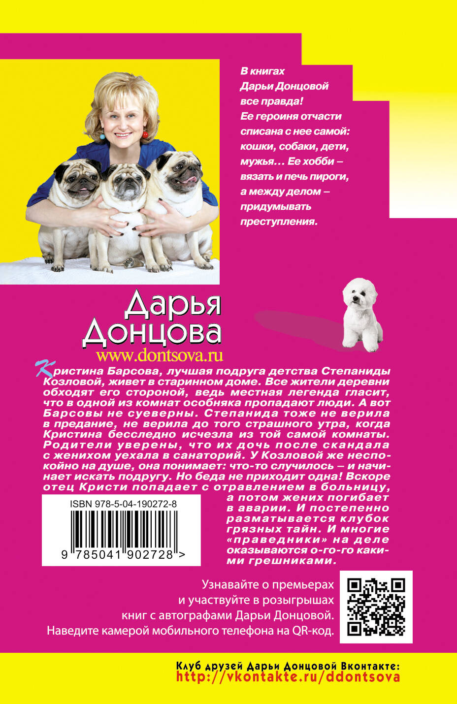 Кристина Барсова, лучшая подруга детства Степаниды Козловой, живет в старинном доме. Все жители деревни обходят его стороной, ведь местная легенда гласит, что в одной из комнат особняка пропадают люди. А вот Барсовы не суеверны. Степанида тоже не верила в предание, не верила до того страшного утра, когда Кристина бесследно исчезла из той самой комнаты. Родители уверены, что их дочь, после скандала с женихом, уехала в санаторий. У Козловой же неспокойно на душе, она понимает: что-то случилось, и начинает искать подругу. Но беда не приходит одна! Вскоре отец Кристи попадает с отравлением в больницу, а потом жених погибает в аварии. И постепенно разматывается клубок грязных тайн. И многие «праведники» на деле оказываются ого-го какими грешниками. Дарья Донцова - самый популярный и востребованный автор в нашей стране, любимица миллионов читателей. В России продано более 200 миллионов экземпляров ее книг. Детективы Дарьи Донцовой написаны в особой манере: помимо интереснейшего сюжета, в них всегда присутствует тонкий юмор, здравый оптимизм и безусловная вера в торжество добра над злом. Это всё, что нужно для отдыха, релаксации и душевного успокоения. Прочтите книги Дарьи, и ваши сердца и души наполнятся светом, оптимизмом, радостью, уверенностью в завтрашнем дне! Они заразят вас желанием жить, радоваться каждому дню и верить в лучшее. -------------------------------------------------- «Донцова невероятная работяга! Я не знаю ни одного другого писателя, который столько работал бы. Я отношусь к ней с уважением, как к образцу писательского трудолюбия. Женщины нуждаются в психологической поддержке и получают ее от Донцовой. Я и сама в свое время прочла несколько романов Донцовой. Ее читают очень разные люди. И очень занятые бизнес-леди, чтобы на время выключить голову, и домохозяйки, у которых есть перерыв 15-20 минут между отвести-забрать детей». - Галина Юзефович, литературный критик «У Дарьи вся детективная закваска всего лишь фон для раскрытия характеров, взаимоотношений между людьми. Всегда есть интрига, и до последнего эпизода непонятно, что, как и почему. В этом смысле условия жанра абсолютно выполняются. Дарья Донцова, конечно, одна из лучших». - Дмитрий Харатьян «Давно начала читать, и так втянулась! И сейчас читаю романы Дарьи. Я отдыхаю за ними. Сама Донцова интеллигентная женщина, у нее мягкий юмор и нестрашный сюжет, все с позитивом и надеждой на хороший конец. Это прекрасно». - Лариса Удовиченко| Издательство | ООО "Издательство "Эксмо" |