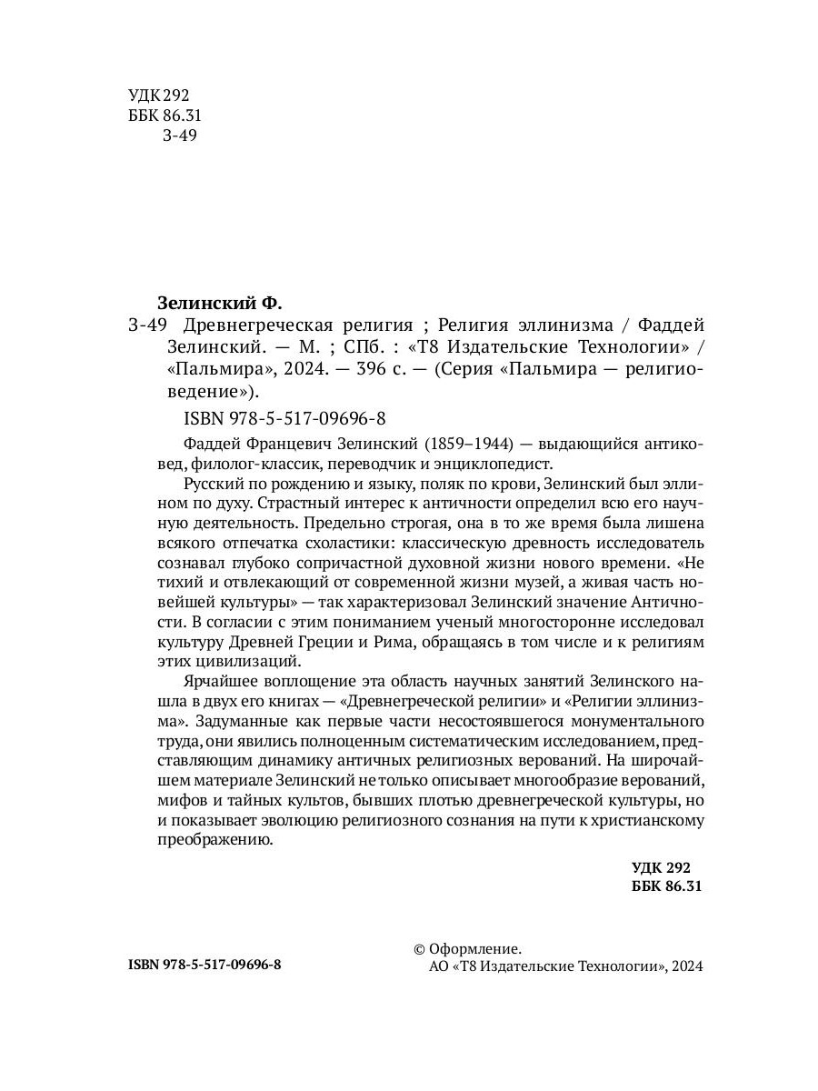 Фаддей Францевич Зелинский (1859-1944) - выдающийся антиковед, филолог-классик, переводчик и энциклопедист. Русский по рождению и языку, поляк по крови, Зелинский был эллином по духу. Страстный интерес к античности определил всю его научную деятельность. Предельно строгая, она в то же время была лишена всякого отпечатка схоластики: классическую древность исследователь сознавал глубоко сопричастной духовной жизни нового времени. «Не тихий и отвлекающий от современной жизни музей, а живая часть новейшей культуры» - так характеризовал Зелинский значение Античности. В согласии с этим пониманием ученый многосторонне исследовал культуру Древней Греции и Рима, обращаясь в том числе и к религиям этих цивилизаций. Ярчайшее воплощение эта область научных занятий Зелинского нашла в двух его книгах - «Древнегреческой религии» и «Религии эллинизма». Задуманные как первые части несостоявшегося монументального труда, они явились полноценным систематическим исследованием, представляющим динамику античных религиозных верований. На широчайшем материале Зелинский не только описывает многообразие верований, мифов и тайных культов, бывших плотью древнегреческой культуры, но и показывает эволюцию религиозного сознания на пути к христианскому преображению.| Издательство | Т8 RUGRAM |