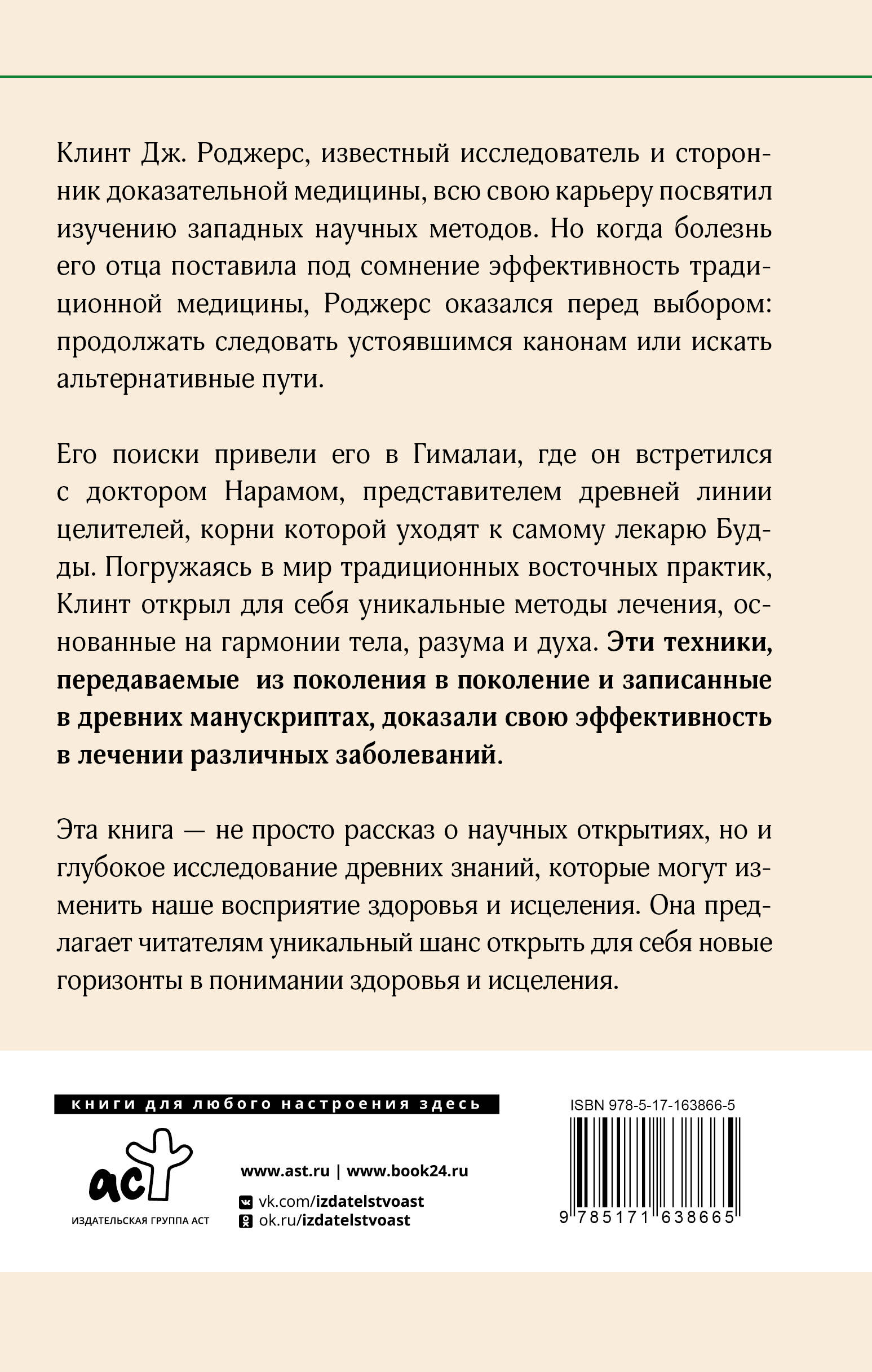 Клинт Дж. Роджерс, известный исследователь и сторонник доказательной медицины, всю свою карьеру посвятил изучению западных научных методов. Но когда болезнь его отца поставила под сомнение эффективность традиционной медицины, Роджерс оказался перед выбором: продолжать следовать устоявшимся канонам или искать альтернативные пути. Его поиски привели его в Гималаи, где он встретился с доктором Нарамом, представителем древней линии целителей, корни которой уходят к самому лекарю Будды. Погружаясь в мир традиционных практик, Клинт открыл для себя уникальные методы лечения, основанные на гармонии тела, разума и духа. Эти техники, передаваемые из поколения в поколение и записанные в древних манускриптах, доказали свою эффективность в лечении различных заболеваний. Эта книга - не просто рассказ о научных открытиях, но и глубокое исследование древних знаний, которые могут изменить наше восприятие здоровья и исцеления. Она предлагает читателям уникальный шанс открыть для себя новые горизонты в понимании здоровья и исцеления.| Издательство | Издательство "АСТ" |