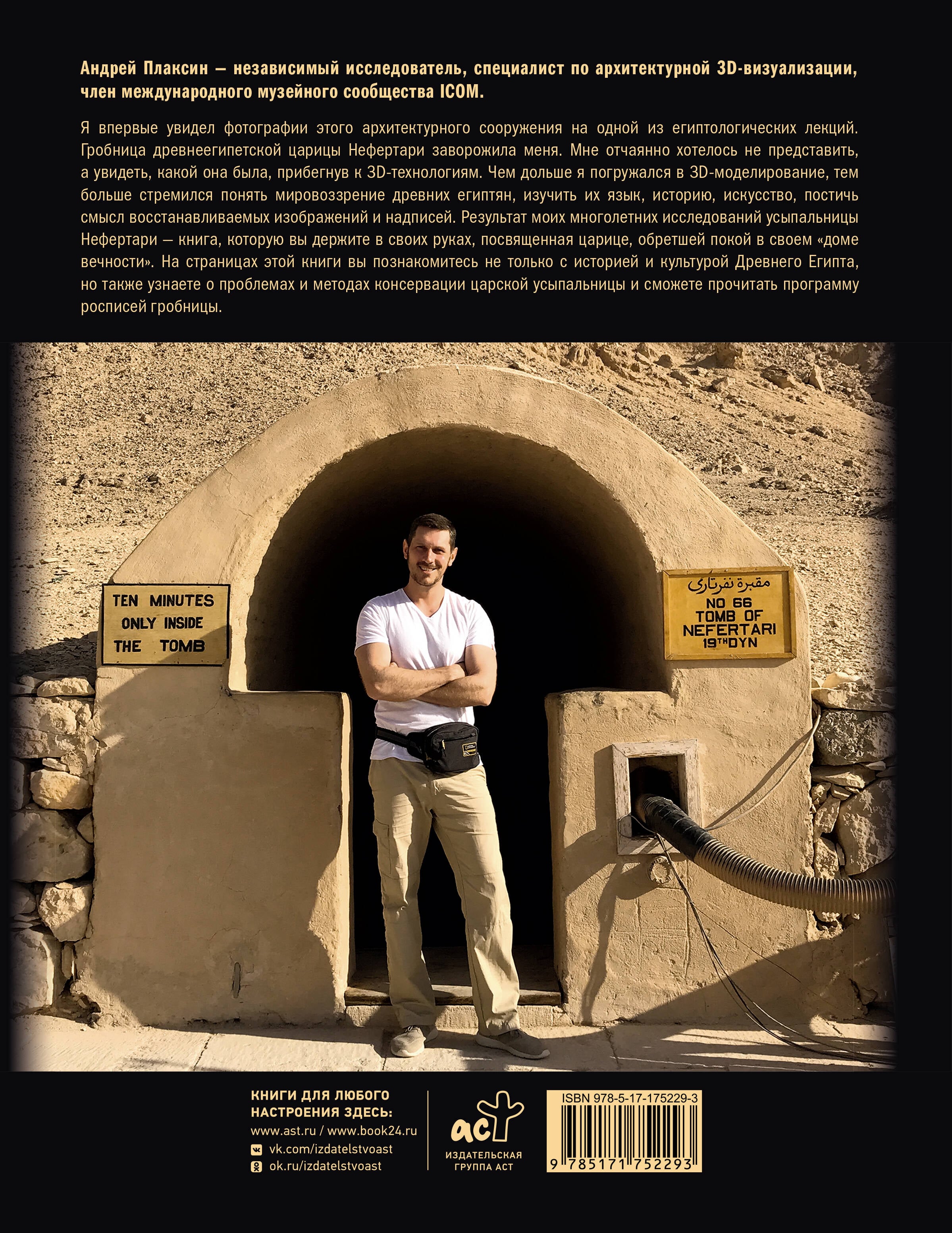 Андрей Плаксин - независимый исследователь, специалист по архитектурной 3D-визуализации, член международного музейного сообщества ICOM. Я впервые увидел фотографии этого архитектурного сооружения на одной из египтологических лекций. Гробница древнеегипетской царицы Нефертари заворожила меня. Мне отчаянно хотелось не представить, а увидеть, какой она была, прибегнув к 3D-технологиям. Чем дольше я погружался в 3D-моделирование, тем больше стремился понять мировоззрение древних египтян, изучить их язык, историю, искусство, постичь смысл восстанавливаемых изображений и надписей. Результат моих многолетних исследований усыпальницы Нефертари - книга, которую вы держите в своих руках, посвященная царице, обретшей покой в своем "доме вечности". На страницах этой книги вы познакомитесь не только с историей и культурой Древнего Египта, но также узнаете о проблемах и методах консервации царской усыпальницы и сможете прочитать программу росписей гробницы.| Издательство | Издательство "АСТ" |
