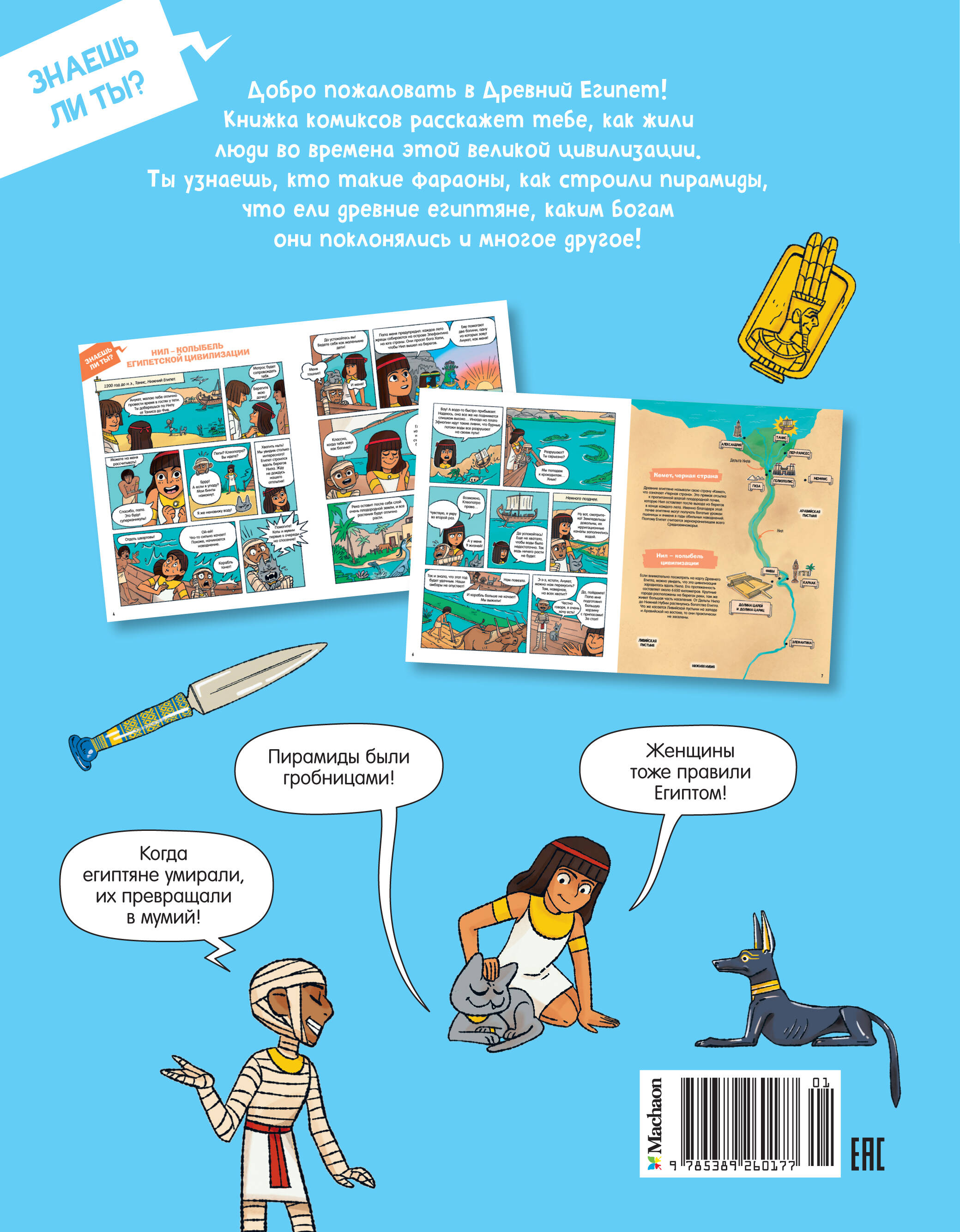 Добро пожаловать в Древний Египет! Книжка комиксов расскажет тебе, как жили люди во времена этой великой цивилизации. Ты узнаешь, кто такие фараоны, как строили пирамиды, что ели древние египтяне, каким богам они поклонялись и многое другое!