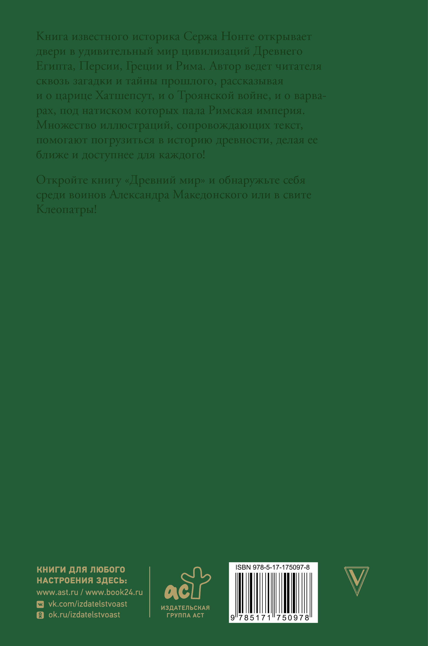 Книга известного историка Сержа Нонте открывает двери в удивительный мир цивилизаций Древнего Египта, Персии, Греции и Рима. Автор ведет читателя сквозь загадки и тайны прошлого, рассказывая и о царице Хатшепсут, и о троянской войне, и о варварах, под натиском которых пала Римская империя. Множество иллюстраций, сопровождающих текст, помогают погрузиться в историю древности, делая ее ближе и доступнее для каждого! Откройте книгу "Древний мир" и обнаружьте себя среди воинов Александра Македонского или в свите Клеопатры!| Издательство | Издательство "АСТ" |