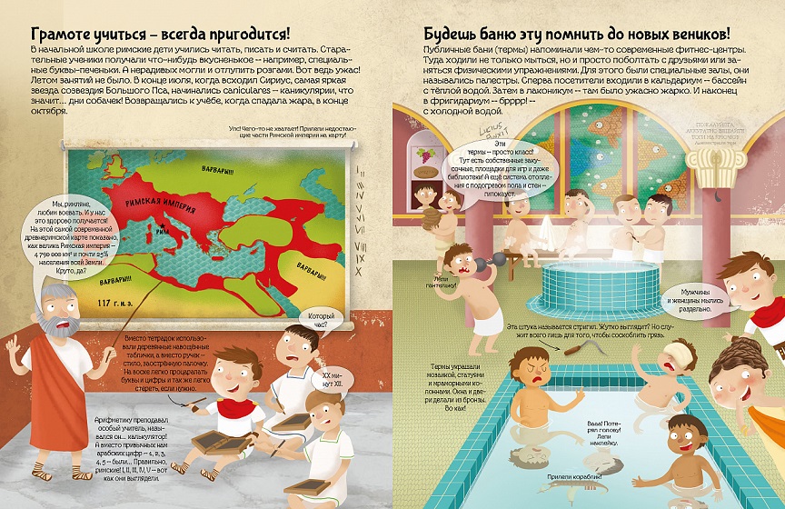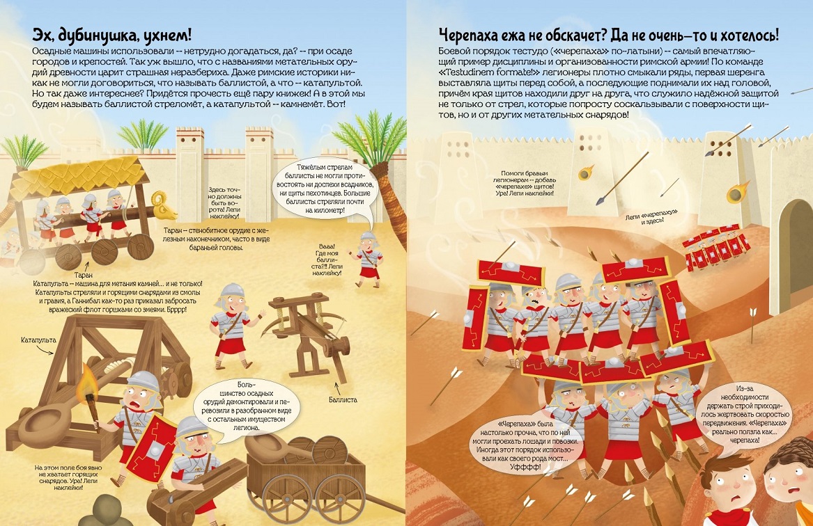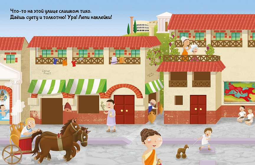 Смешные рисунки и серьёзные факты о Древнем Риме. С наклейками ещё веселее! Итак, надевай лорику, калиги, бери скатум -и в путь! Да, и не забудь свой верный гладий!