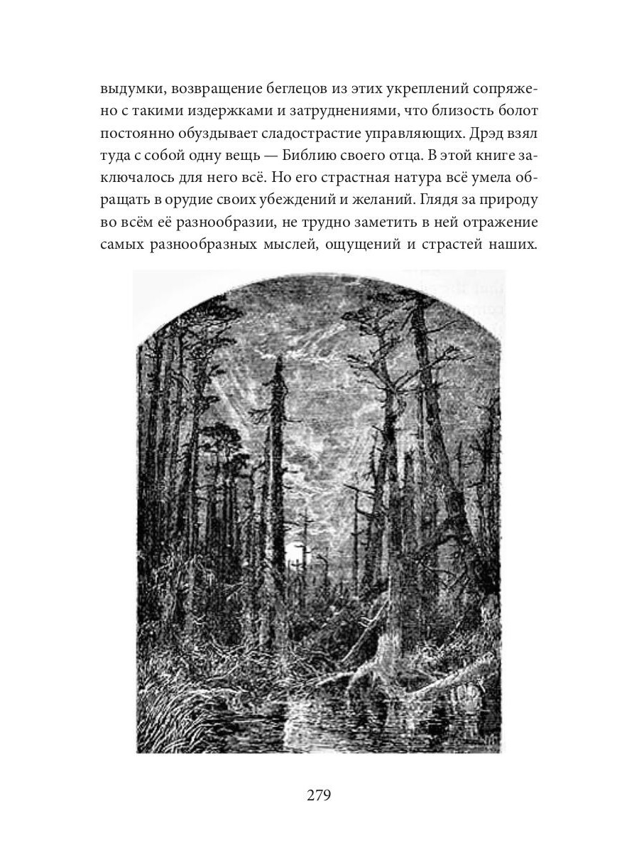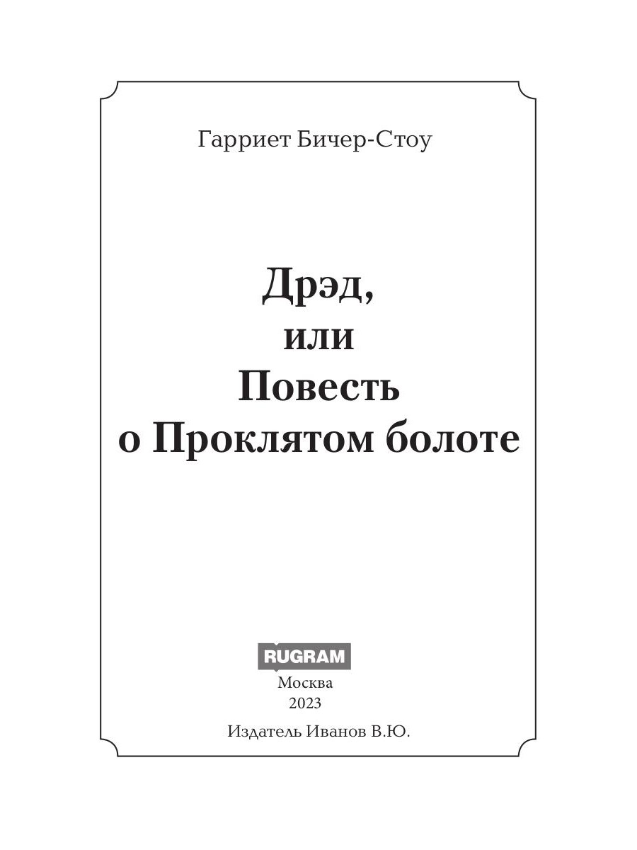 В романе описан идеальный плантатор Эдвард Клейтон, который обучает рабов грамоте, хочет провести реформы в своем имении и в имении невесты, но под давлением соседей он вынужден отказаться от своих преобразований. Однако не только мирный путь предлагает писательница: негр Дрэд бежит от хозяина, скрывается на болоте, собирает вокруг себя единомышленников и возглавляет восстание беглых рабов. Писательница ищет третий путь.| Издательство | Т8 RUGRAM |