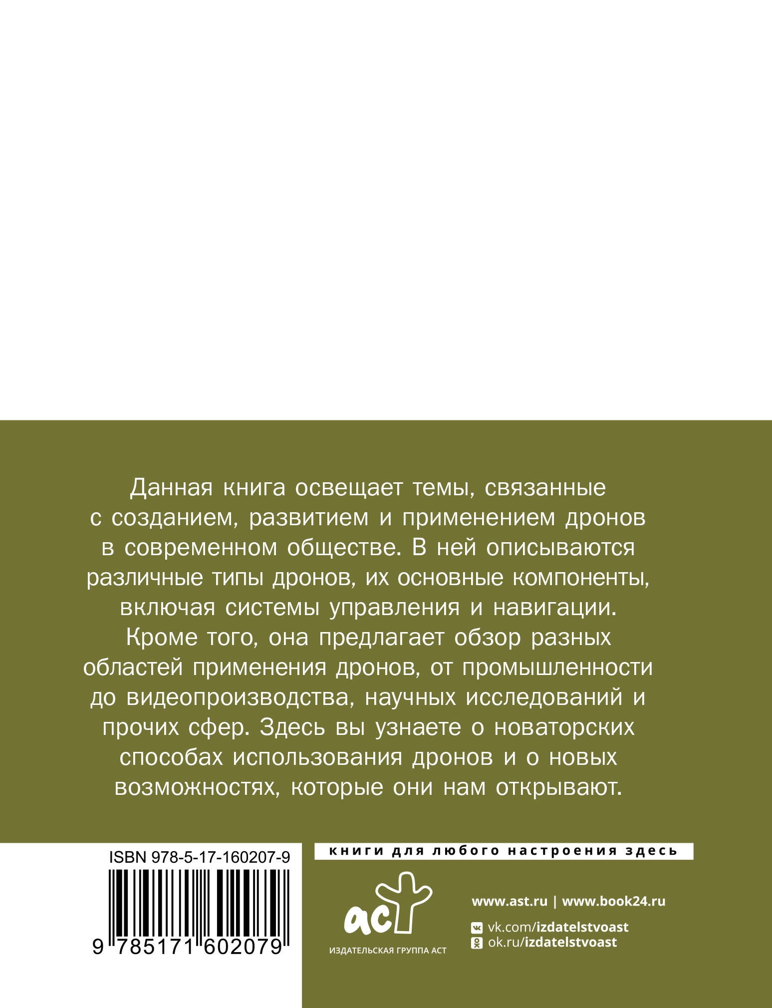 Данная книга освещает темы, связанные с созданием, развитием и применением дронов в современном обществе. В ней описываются различные типы дронов, их основные компоненты, включая системы управления и навигации. Кроме того, она предлагает обзор разных областей применения дронов, от промышленности до видеопроизводства, научных исследований и прочих сфер. Здесь вы узнаете о новаторских способах использования дронов и о новых возможностях, которые они нам открывают.| Издательство | Издательство "АСТ" |