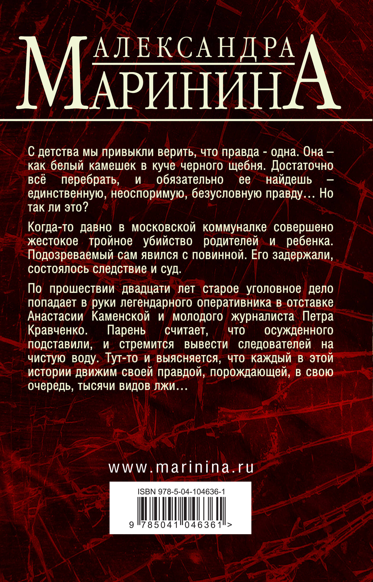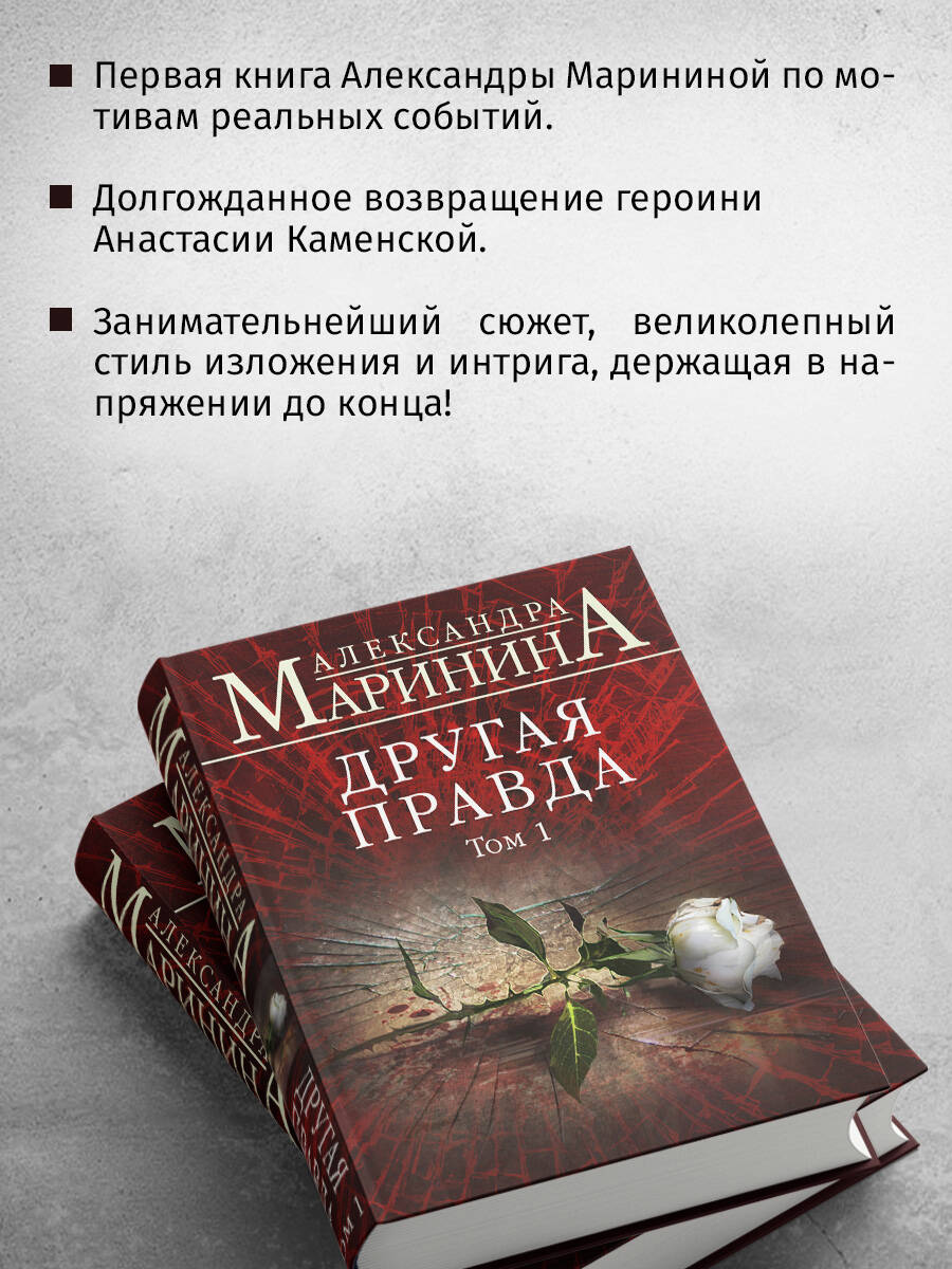 Анастасия Каменская снова в деле! Вот уже почти тридцать лет любимый персонаж миллионов читателей служит благородному делу - поиску правды! Впервые прославленный следователь изучает старое уголовное дело по реальному преступлению. Осужденный по нему до сих пор отбывает наказание в исправительном учреждении. Никогда и никто еще не описывал так подробно и захватывающе внутреннюю кухню следственных действий. Вместе с героями детектива вы сможете глубоко погрузиться в расследование и раскрыть преступление, которому более двадцати лет! Будьте готовы к открывающейся на глазах истине о том страшном дне преступления. С детства мы привыкли верить, что правда - одна. Она - как белый камешек в куче черного щебня. Достаточно всё перебрать, и обязательно ее найдешь - единственную, неоспоримую, безусловную правду… Но так ли это? Когда-то давно в московской коммуналке было совершено жестокое тройное убийство родителей и ребенка. Подозреваемый сам явился с повинной. Его задержали, состоялось следствие и суд. По прошествии двадцати лет старое уголовное дело попадает в руки легендарного оперативника в отставке Анастасии Каменской и молодого журналиста Петра Кравченко. Парень считает, что осужденного подставили, и стремится вывести следователей на чистую воду. Тут-то и выясняется, что каждый в этой истории движим своей правдой, порождающей, в свою очередь, тысячи видов лжи… «Маринина не только пишет детективные романы, но и отвечает на вечные вопросы. Автор относится к своим читателям как добрый и опытный учитель к ученикам, которые нуждаются в поддержке, подсказке и направлении на верный путь. Оптимистичная и практичная в своей дидактике, Маринина ставит перед собой вопрос "как жить" и старается помочь читателю найти свой путь к лучшей жизни в сегодняшнем мире. Своими детективами Маринина пишет современный роман "воспитания чувств": основная цель автора - воспитание посредством развлечения». - Анатолий Вишевский, Гринелльский колледж, США «Многие романы Александры Марининой в России экранизированы, а в Германии переработаны в радиопьесы. Исходя из того, что цель этих обработок - захватывать зрителей и слушателей таким же образом, как захвачены читатели, то фильм и радиопьеса являются не только дополнительными художественными произведениями, но и интересными интерпретациями, которые проникли в тайну успеха Александры Марининой». - Сара Хэги, Кельнский университет, Германия «В диалогах художественной и тривиальной литературы можно обнаружить разные способы стилизации "устности", чтобы достичь впечатления спонтанного разговора. Обиходная речь в романах А. Марининой отличается необыкновенно высокой степенью оживленности, что выражается, между прочим, в разных формах обращения собеседников, в различных оттенках вежливости и в эмоциональности используемой лексики». - Вольфганг Штадлер, Университет имени Леопольда Францена, Инсбрук, Австрия| Издательство | ООО "Издательство "Эксмо" |