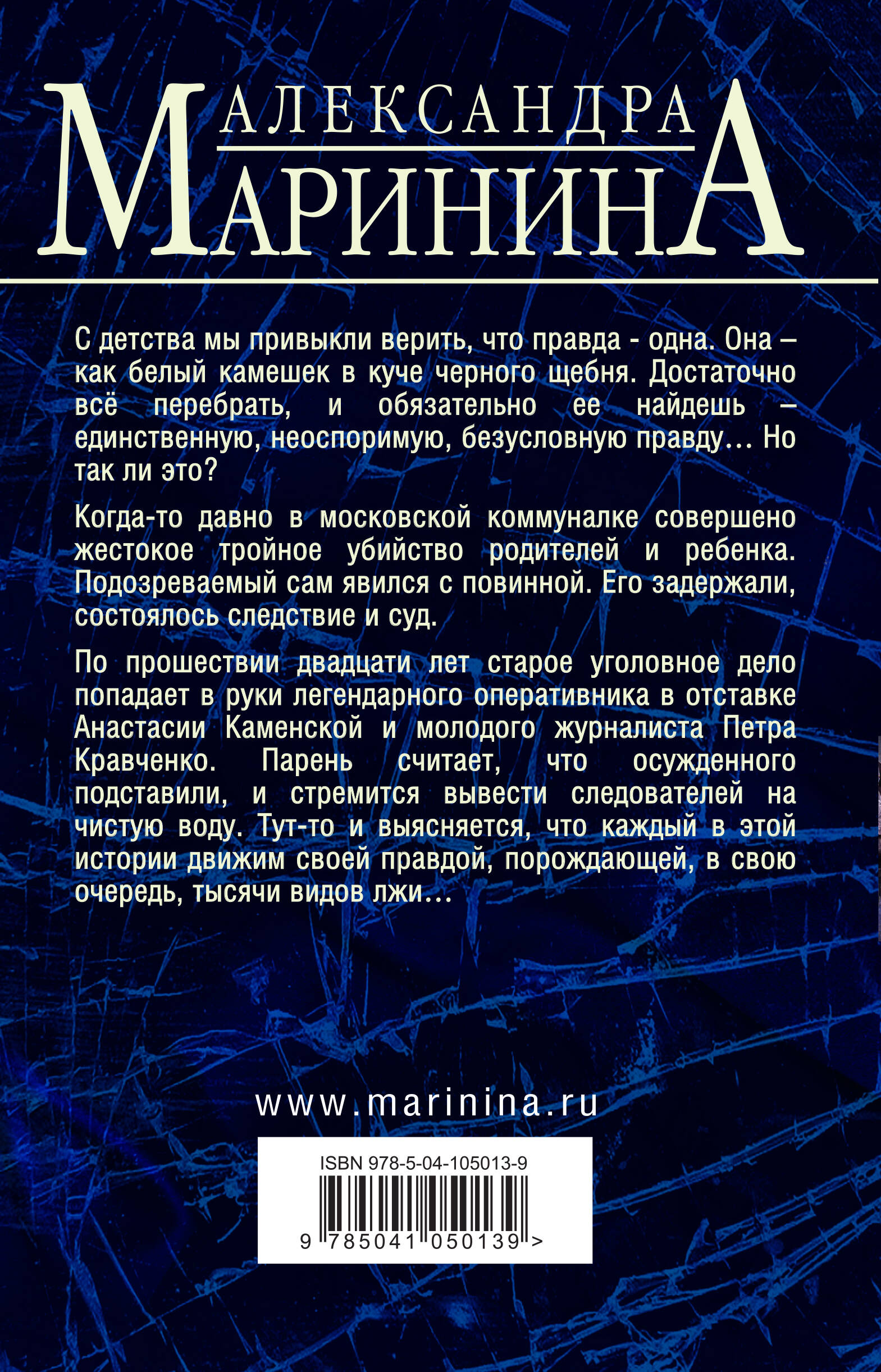 Анастасия Каменская снова в деле! Вот уже почти тридцать лет любимый персонаж миллионов читателей служит благородному делу - поиску правды! Впервые прославленный следователь изучает старое уголовное дело по реальному преступлению. Осужденный по нему до сих пор отбывает наказание в исправительном учреждении. Никогда и никто еще не описывал так подробно и захватывающе внутреннюю кухню следственный действий. Вместе с героями детектива вы сможете глубоко погрузиться в расследование и раскрыть преступление, которому более 20-ти лет! Будьте готовы к открывающейся на глазах истине о том страшном дне преступления. С детства мы привыкли верить, что правда - одна. Она - как белый камешек в куче черного щебня. Достаточно всё перебрать, и обязательно её найдешь - единственную, неоспоримую, безусловную правду… Но так ли это? Когда-то давно в московской коммуналке было совершено жестокое тройное убийство родителей и ребенка. Подозреваемый сам явился с повинной. Его задержали, состоялось следствие и суд. По прошествии двадцати лет старое уголовное дело попадает в руки легендарного оперативника в отставке Анастасии Каменской и молодого журналиста Петра Кравченко. Парень считает, что осужденного подставили, и стремится вывести следователей на чистую воду. Тут-то и выясняется, что каждый в этой истории движим своей правдой, порождающей, в свою очередь, тысячи видов лжи… «Маринина не только пишет детективные романы, но и отвечает на вечные вопросы. Автор относится к своим читателям как добрый и опытный учитель к ученикам, которые нуждаются в поддержке, подсказке и направлении на верный путь. Оптимистичная и практичная в своей дидактике, Маринина ставит перед собой вопрос "как жить" и старается помочь читателю найти свой путь к лучшей жизни в сегодняшнем мире. Своими детективами Маринина пишет современный роман "воспитания чувств": основная цель автора - воспитание посредством развлечения». - Анатолий Вишевский, Гринелльский колледж, США «Многие романы Александры Марининой в России экранизированы, а в Германии переработаны в радиопьесы. Исходя из того, что цель этих обработок - захватывать зрителей и слушателей таким же образом, как захвачены читатели, то фильм и радиопьеса являются не только дополнительными художественными произведениями, но и интересными интерпретациями, которые проникли в тайну успеха Александры Марининой». - Сара Хэги, Кельнский университет, Германия «В диалогах художественной и тривиальной литературы можно обнаружить разные способы стилизации "устности", чтобы достичь впечатления спонтанного разговора. Обиходная речь в романах А. Марининой отличается необыкновенно высокой степенью оживленности, что выражается, между прочим, в разных формах обращения собеседников, в различных оттенках вежливости и в эмоциональности используемой лексики». - Вольфганг Штадлер, Университет имени Леопольда Францена, Инсбрук, Австрия| Издательство | ООО "Издательство "Эксмо" |