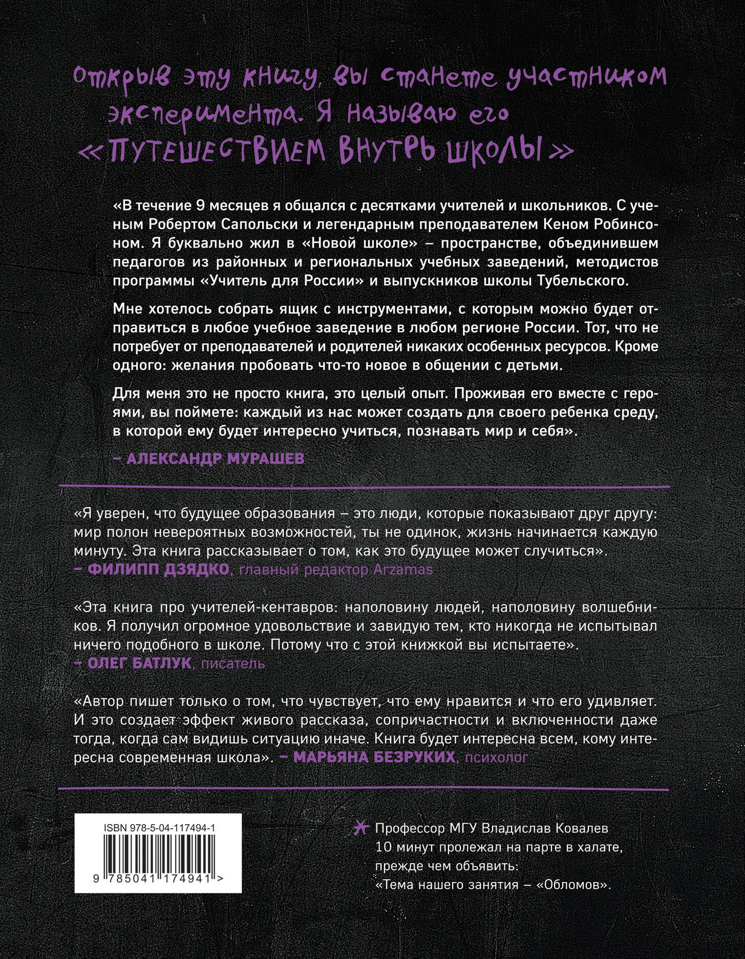 ОТ ИЗДАТЕЛЯ Два года назад вышла первая книга Александра Мурашева, в которой он рассказал о методиках обучения и воспитания, собранных им за год в самых незаурядных школах мира. Книга откликнулась в сердцах тысяч преподавателей и родителей. В ваших руках продолжение путешествия внутрь школы. На этот раз автор провел 9 месяцев в «Новой школе» - пространстве, объединившем педагогов из районных и региональных учебных заведений, методистов программы «Учитель для России» и выпускников школы Тубельского. Эта книга получилась набором с инструментами, в котором вы найдете: • способы обучения, позволяющие заинтересовать ребенка в учебе, познании мира и себя; • советы родителям, которые ищут баланс между счастьем и знаниями своего ребенка; • ответы на самые острые вопросы о современном образовании. ЦИТАТЫ • Преподаватели в Скандинавии говорят, что прежде всего школа должна научить одному - умению быстро адаптироваться к окружающему миру. • В нескольких тысячах интервью на школьную тему мои собеседники из раза в раз подтверждали простую мысль: мы всегда запоминаем не знания, а людей. • Большая часть проблем с дисциплиной в классе - сигнал внутренних сложностей учителя. • Мне кажется, что урок не должен быть «другой реальностью», где люди сорок минут говорят специальными голосами не о том, о чем они разговаривают обычно. Урок - это продолжение жизни. • Нужно разорвать шаблон, совершить то, что преподаватель «не должен делать». После такого начала дети в классе всегда будут «твоими». ОТЗЫВЫ «Я уверен, что будущее образования - это люди, которые показывают друг другу: мир полон невероятных возможностей, ты не одинок, жизнь начинается каждую минуту. Эта книга рассказывает о том, как это будущее может случиться». - Филипп Дзядко, главный редактор Arzamas «Эта книга про учителей-кентавров: наполовину людей, наполовину волшебников. Я получил огромное удовольствие и завидую тем, кто никогда не испытывал ничего подобного в школе. Потому что с этой книжкой вы испытаете». - Олег Батлук, писатель «Автор пишет только о том, что чувствует, что ему нравится и что его удивляет. И это создаёт эффект живого рассказа, сопричастности и включённости даже тогда, когда сам видишь ситуацию иначе. Книга будет интересна всем, кому интересна современная школа». - Марьяна Безруких, психолог| Издательство | ООО "Издательство "Эксмо" |
