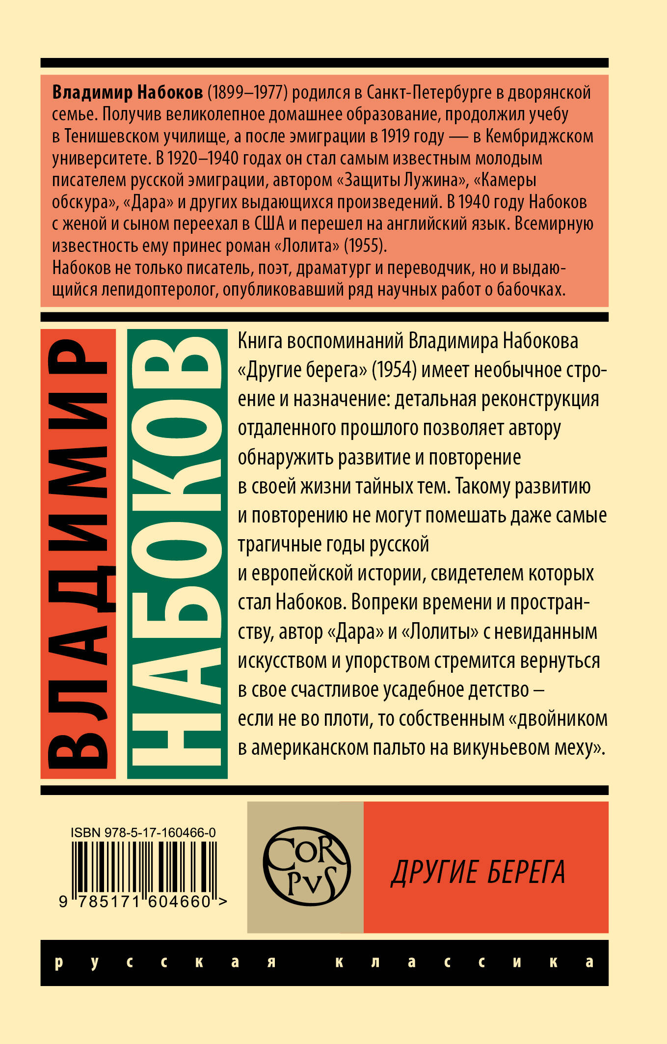 Книга воспоминаний Владимира Набокова "Другие берега" (1954) имеет необычное строение и назначение: реконструируя отдаленное прошлое - с первых годов XX века по май 1940 года, - он старается обнаружить в нем развитие и повторение тайных тем в явной судьбе. Такому развитию и повторению не могут помешать даже самые трагичные годы русской и европейской истории, свидетелем которых стал Набоков. Вопреки времени и пространству автор "Дара" и "Лолиты" с невиданным искусством и упорством стремится вернуться в свое счастливое усадебное детство - если не во плоти, то собственным "двойником в американском пальто на викуньевом меху".| Издательство | Издательство "АСТ" |
