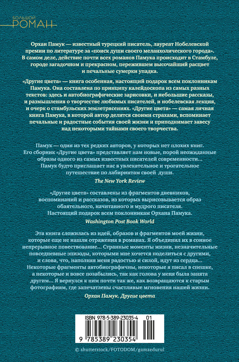 "Другие цвета" - настоящий подарок всем поклонникам известного турецкого писателя Орхана Памука. Эта книга составлена по принципу калейдоскопа из самых разных текстов: здесь и автобиографические зарисовки, и небольшие рассказы, и размышления о творчестве любимых писателей, и нобелевская лекция, и очерк о стамбульских землетрясениях. "Другие цвета" - самая личная книга Памука, в которой автор делится своими страхами, вспоминает печальные и радостные события своей жизни и приподнимает завесу над некоторыми тайнами своего творчества.| Издательство | Азбука-Аттикус Издат.группа ООО |