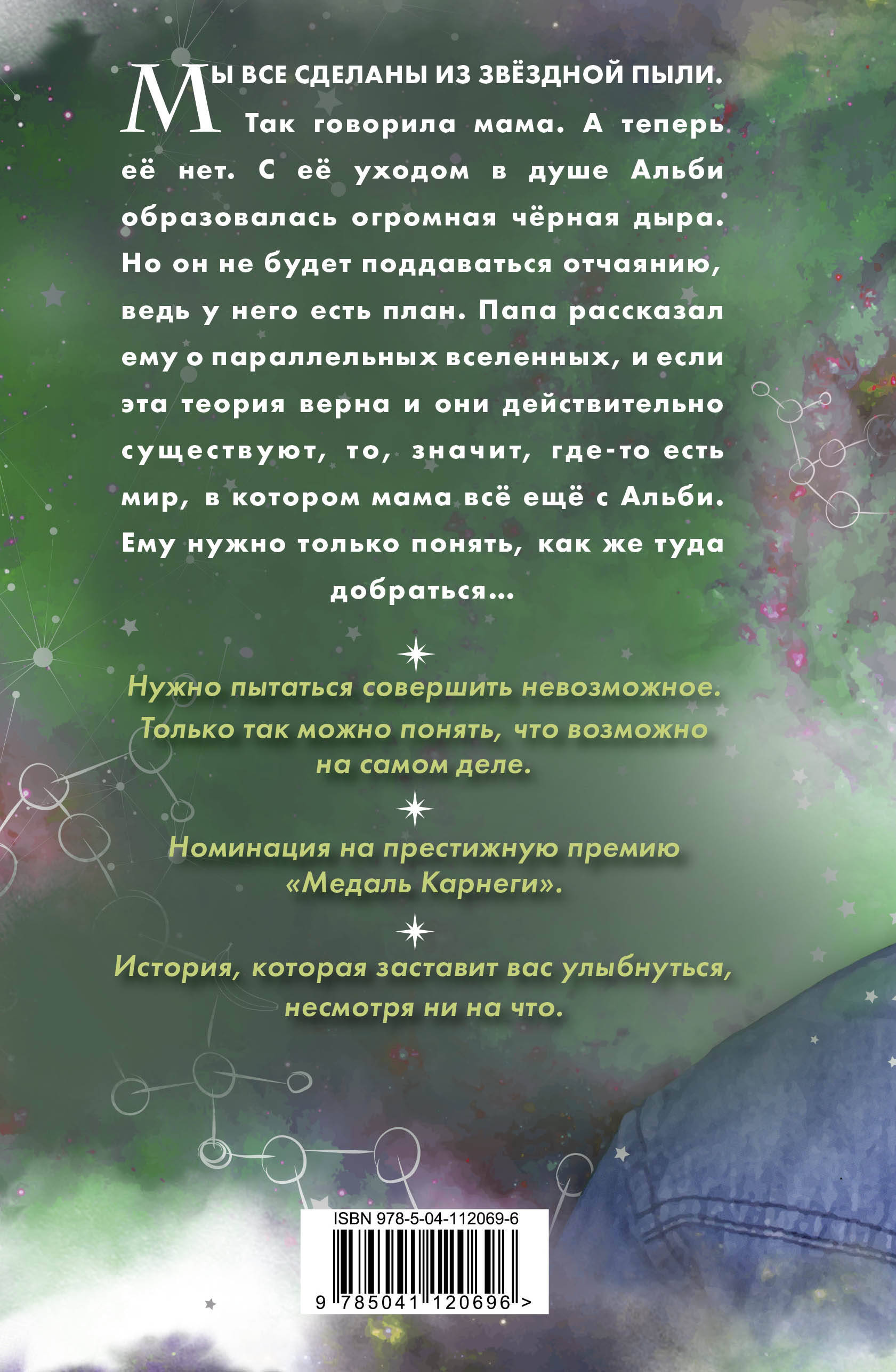 Мы все сделаны из звёздной пыли - так говорила мама. А теперь её нет. С её уходом в душе Альби образовалась огромная чёрная дыра. Но он не будет поддаваться отчаянию, ведь у него есть план. Папа рассказал ему о параллельных вселенных, и если эта теория верна и они действительно существуют, то, значит, где-то есть мир, в котором мама не умерла. Альби нужно только понять, как же туда добраться. Но если любишь кого-то всем сердцем, то ради него можно совершить чудо! Альби настроен решительно: он найдёт маму, обязательно! И всё снова станет хорошо. Не так ли? Номинация на престижную премию «Медаль Карнеги». История, которая заставит вас улыбнуться, несмотря ни на что. «Выдающаяся книга с прекрасным чувством юмора и очень, очень большим сердцем». - Фрэнк Коттрел Бойс| Издательство | Эксмо |