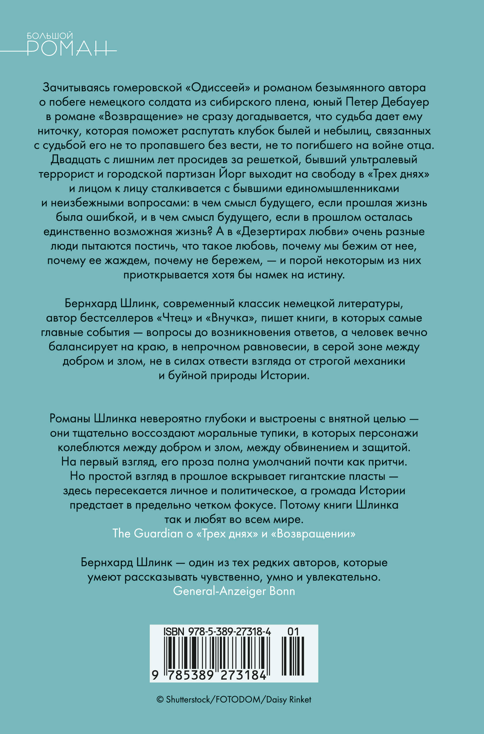Зачитываясь гомеровской "Одиссеей" и романом безымянного автора о побеге немецкого солдата из сибирского плена, юный Петер Дебауер в романе "Возвращение" не сразу догадывается, что судьба дает ему ниточку, которая поможет распутать клубок былей и небылиц, связанных с судьбой его не то пропавшего без вести, не то погибшего на войне отца. Двадцать с лишним лет просидев за решеткой, бывший ультралевый террорист и городской партизан Йорг выходит на свободу в "Трех днях" и лицом к лицу сталкивается с бывшими единомышленниками и неизбежными вопросами: в чем смысл будущего, если прошлая жизнь была ошибкой, и в чем смысл будущего, если в прошлом осталась единственно возможная жизнь? А в "Дезертирах любви" очень разные люди пытаются постичь, что такое любовь, почему мы бежим от нее, почему ее жаждем, почему не бережем - и порой некоторым из них приоткрывается хотя бы намек на истину. Бернхард Шлинк, современный классик немецкой литературы, автор бестселлеров "Чтец" и "Внучка", пишет книги, в которых самые главные события - вопросы до возникновения ответов, а человек вечно балансирует на краю, в непрочном равновесии, в серой зоне между добром и злом, не в силах отвести взгляда от строгой механики и буйной природы Истории.| Издательство | Азбука-Аттикус Издат.группа ООО |