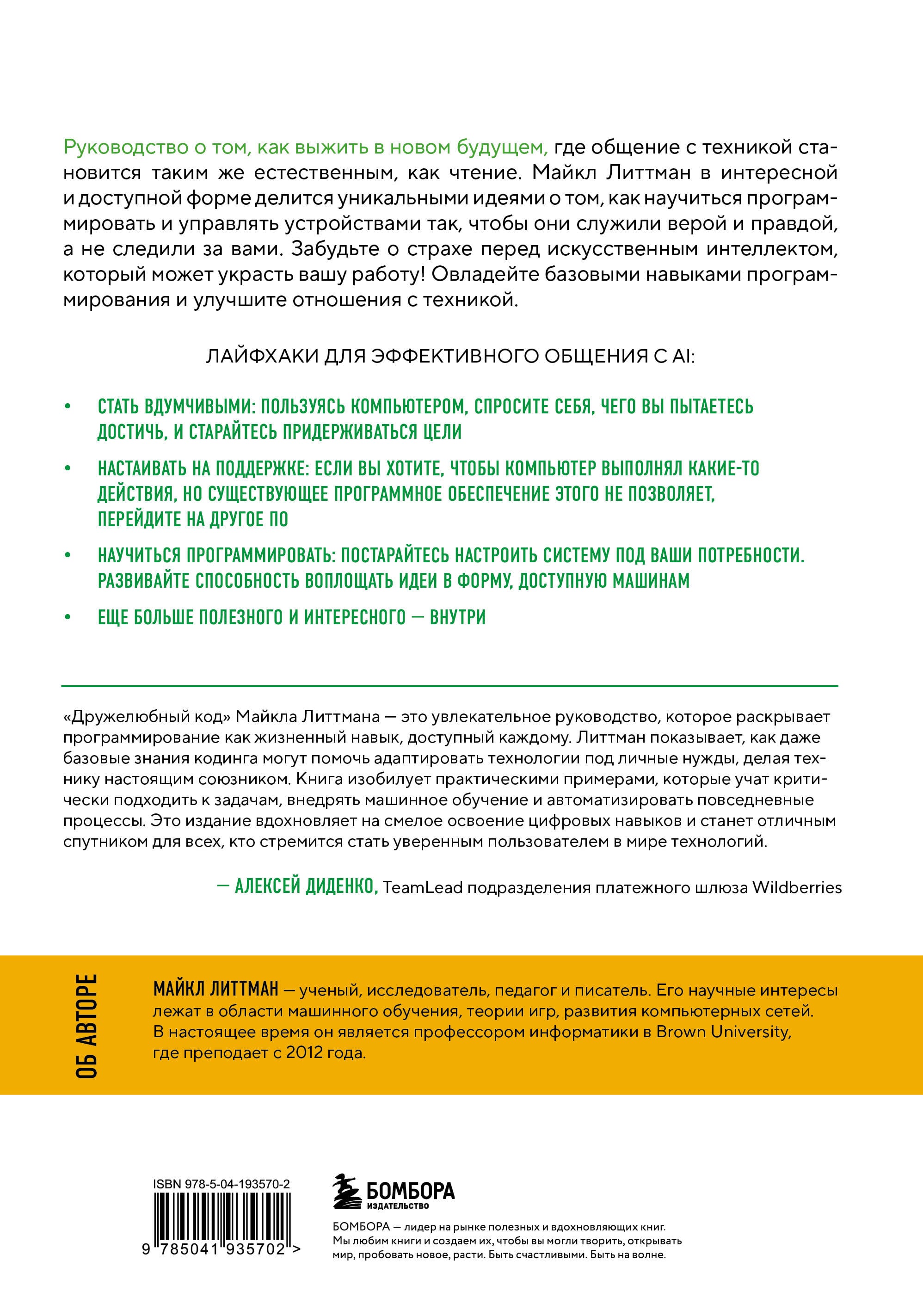 Руководство о том, как выжить в новом будущем, где общение с техникой становится таким же естественным, как чтение. Майкл Литтман в интересной и доступной форме делится уникальными идеями о том, как научиться программировать и управлять устройствами так, чтобы они служили верой и правдой, а не следили за вами. Забудьте о страхе перед искусственным интеллектом, который может украсть вашу работу! Овладейте базовыми навыками программирования и улучшите отношения с техникой. Литтман предлагает простые и понятные примеры того, как можно использовать программирование в повседневной жизни, дает практические советы по экспериментированию с этими идеями. Вы узнаете, как машинное обучение может ускорить и упростить процесс кодинга, делая его доступным для каждого. Лайфхаки для эффективного общения с AI: • Стать вдумчивыми: пользуясь компьютером, спросите себя, чего вы пытаетесь достичь, и старайтесь придерживаться цели. • Настаивать на поддержке: если вы хотите, чтобы компьютер выполнял какие-то действия, но существующее программное обеспечение этого не позволяет, перейдите на другое ПО. • Научиться программировать: постарайтесь настроить систему под ваши потребности. Развивайте способность воплощать идеи в форму, доступную машинам. • Еще больше полезного и интересного - внутри. «"Дружелюбный код" Майкла Литтмана - это увлекательное руководство, которое раскрывает программирование как жизненный навык, доступный каждому. Литтман показывает, как даже базовые знания кодинга помогают адаптировать технологии под личные нужды, делая технику настоящим союзником. Книга изобилует практическими примерами, которые учат критически подходить к задачам, внедрять машинное обучение и автоматизировать повседневные процессы. Это издание вдохновляет на смелое освоение цифровых навыков и станет отличным спутником для всех, кто стремится стать уверенным пользователем в мире технологий». - Алексей ДИДЕНКО, TeamLead подразделения платежного шлюза Wildberries Майкл ЛИТТМАН - ученый, исследователь, педагог и писатель. Его научные интересы лежат в области машинного обучения, теории игр, развития компьютерных сетей. В настоящее время он является профессором информатики в Brown University, где преподает с 2012 года.| Издательство | ООО "Издательство "Эксмо" |