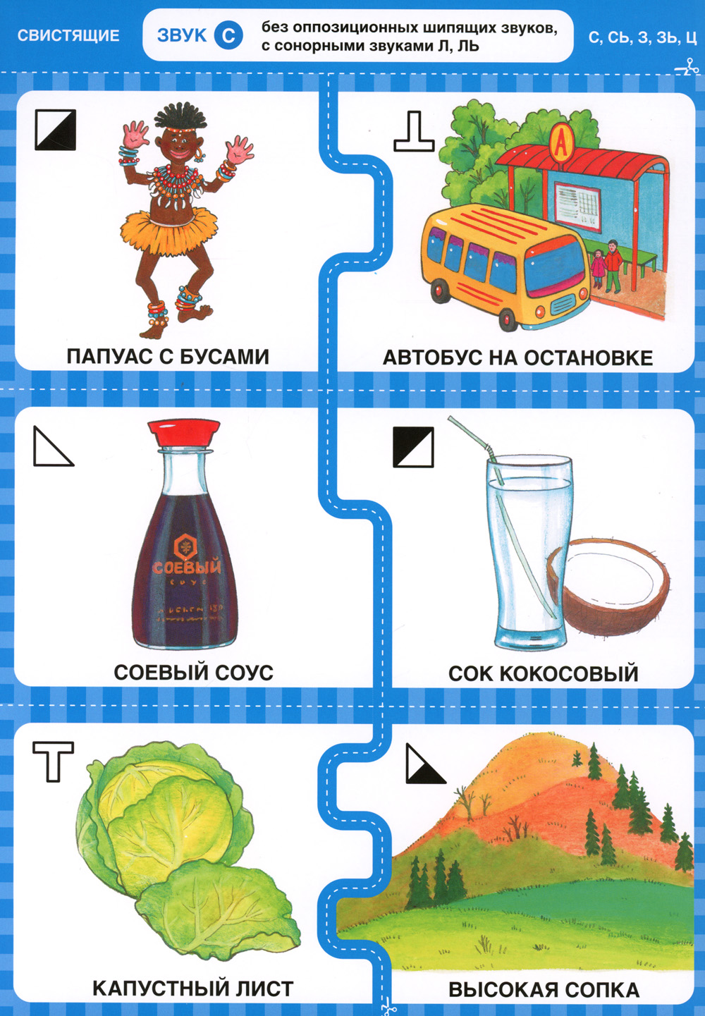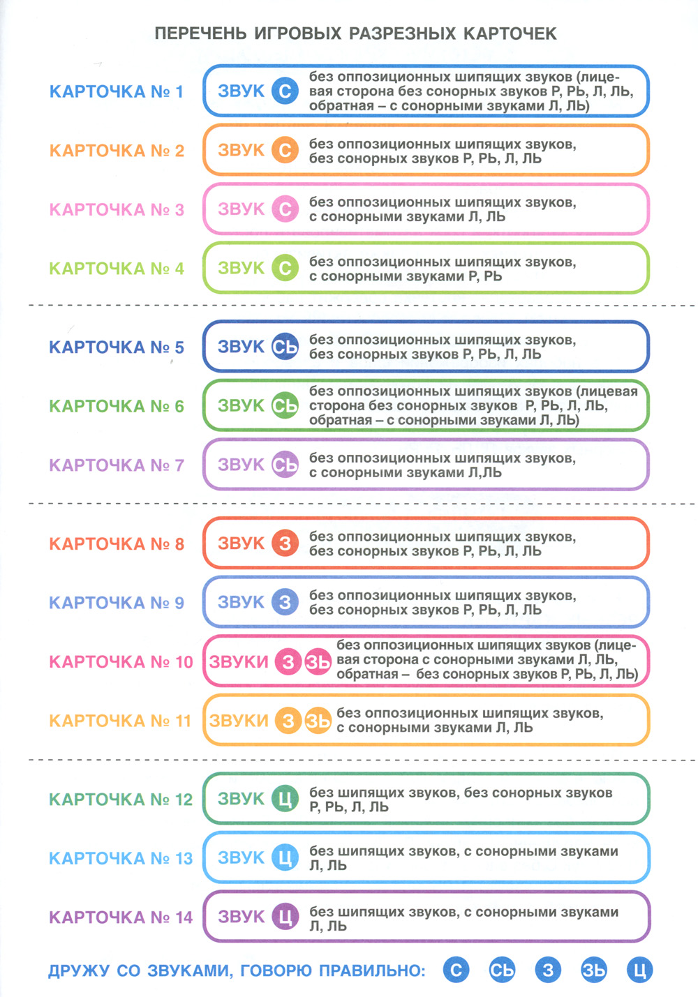 Каждый комплект - это папка, в которую удобно складывать и хранить 14 двусторонних листов с игровыми разрезными карточками. В каждой папке - гид для взрослого с методическими рекомендациями и правилами игр для автоматизации чистого произношения звуков С, Сь, З, Зь, Ц в сочетаниях слов. 168 уникальных картинок и словосочетаний с кодовыми символами на каждой разрезной карточке помогут привлечь внимание ребенка к изучаемому звуку, активируют память, звуковое, зрительное восприятие и способствуют самостоятельному произнесению фраз. Такие игровые задания легко побуждают самого ребёнка участвовать в процессе исправления звукопроизношения.