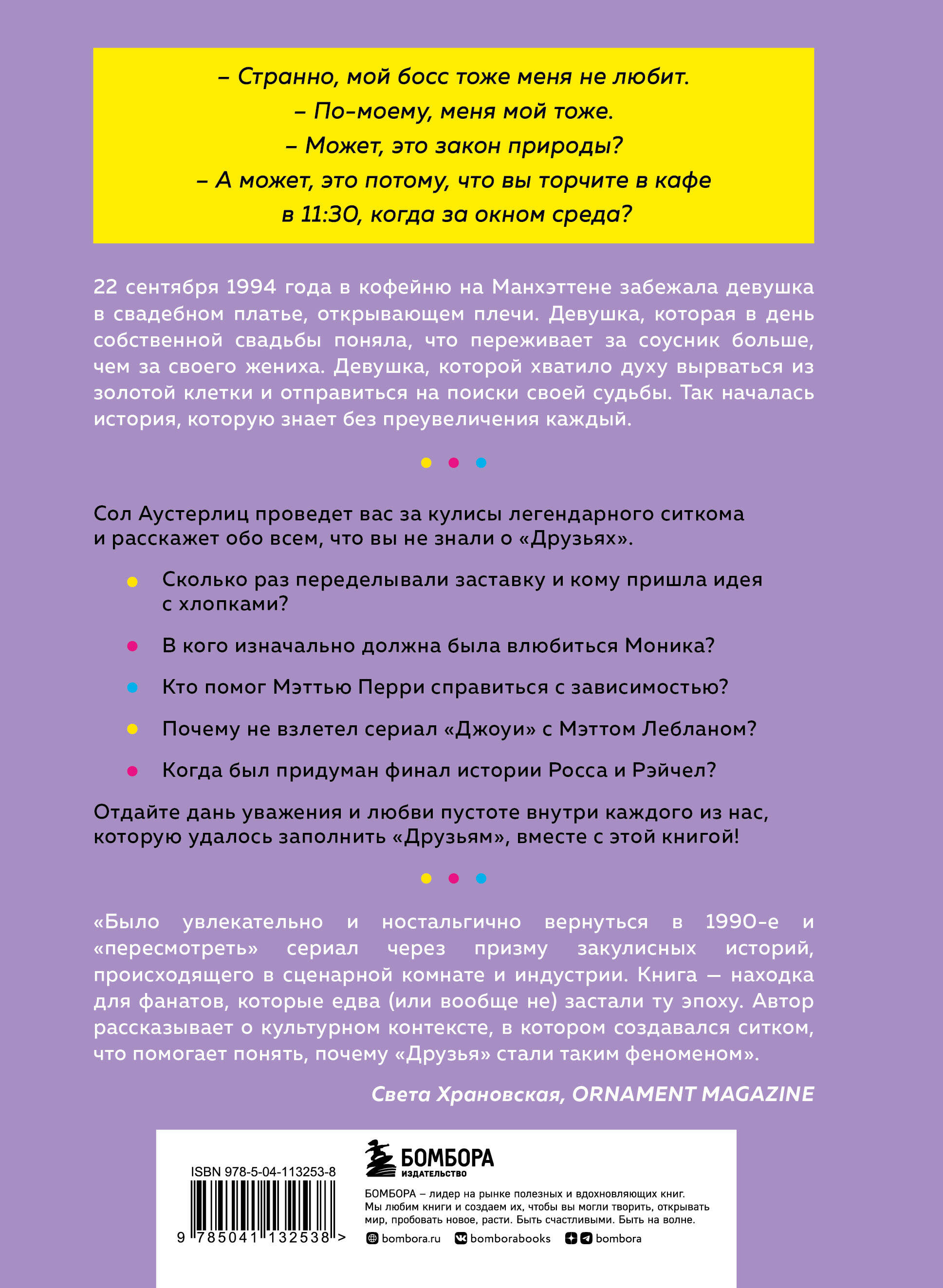 - Странно, мой босс тоже меня не любит. - По-моему, меня мой тоже. - Может, это закон природы? - А может, это потому, что вы торчите в кафе в 11:30, когда за окном среда? Вам, скорее всего, не нужно рассказывать, о чем сериал «Друзья» и почему он так популярен почти тридцать лет. Вы, скорее всего, помните наизусть большую часть песен Фиби и все шутки Чендлера. Вас, скорее всего, не нужно уговаривать отправиться в путешествие по миру шестерых друзей, покоривших весь мир. Эта книга, полюбившаяся читателям по всему миру, расскажет о том, как три человека пытались не остаться без работы, а в итоге придумали преданных друзей для нескольких поколений людей. «Друзья» - это и фантазия, и реальность. Сериал дает поклонникам возможность насладиться свободным временем без рабочих, финансовых или семейных проблем. Сериал позволяет молодым людям мечтать о жизни, в которой главное - их друзья и отношения. Каждая из серий - это мир, в котором молодые люди живут между выпуском из университета и свадьбой (или, как сказал бы Росс, свадьбами). «Друзья» показывают на своем примере, что любые трудности можно пережить, если рядом с тобой настоящие друзья. Автор освежит в вашей памяти то, что вы когда-то знали и где-то слышали, а также поделится тем, что сам узнал только во время написания книги. - С кем изначально должна была остаться Моника? - Сколько раз переделывали заставку и кому пришла идея с хлопками? - Кто помог Мэттью Перри пережить трудный период в жизни? Найдите ответы на эти и многие другие вопросы внутри - отдайте дань уважения и любви той пустоте внутри каждого из нас, которую удалось заполнить «Друзьям»!| Издательство | ООО "Издательство "Эксмо" |