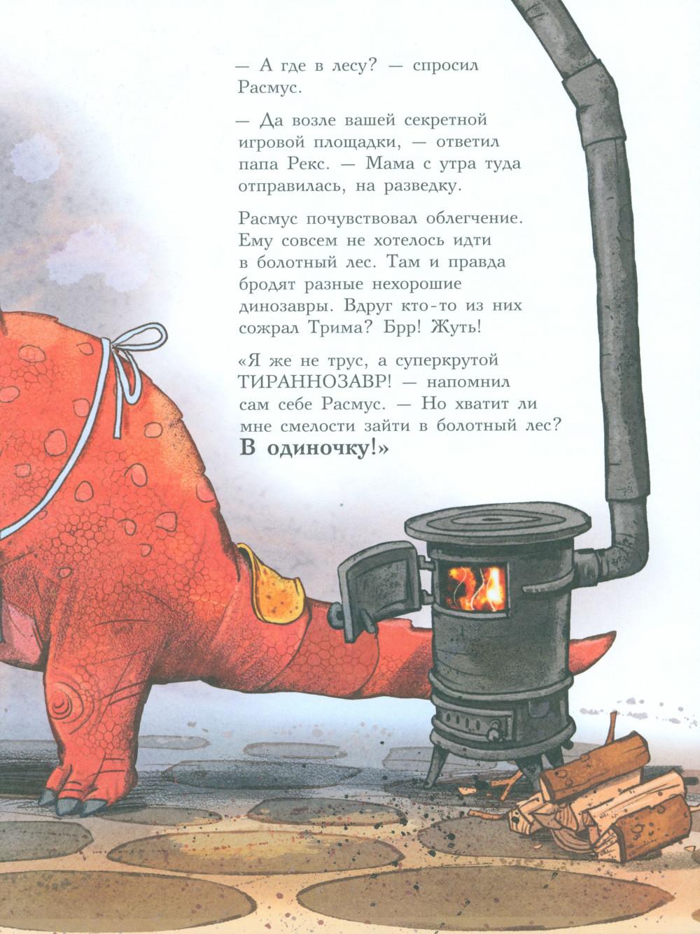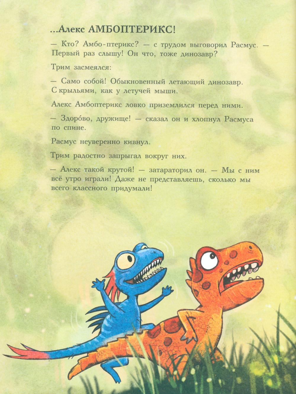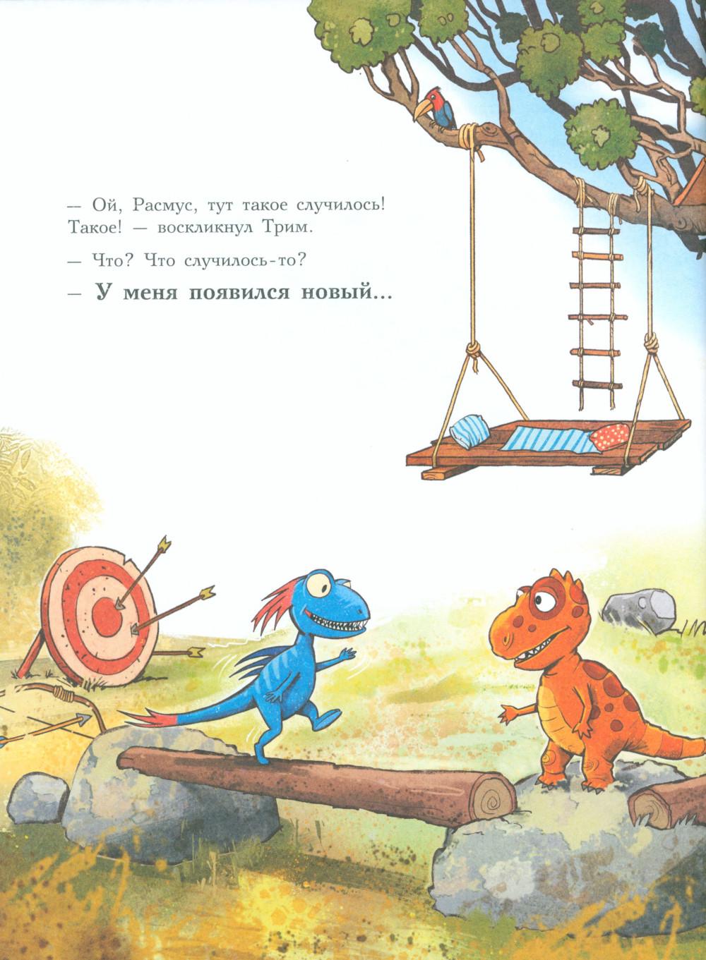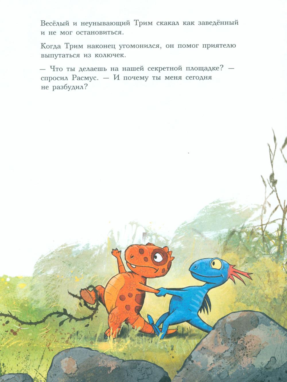 Каждая книга серии «Друзья-динозаврики» рассказывает об одном дне из жизни тираннозаврика Расмуса Рекса и его лучшего друга Трима Троодона. В то утро Расмус открыл глаза и понял, что проспал. В сердце закралась тревога: обычно его будил Трим, а сегодня Трим не пришел. Не случилось ли какой-то беды? Расмус отправился искать друга в болотный лес, хотя идти туда в одиночку было ужасно страшно. На секретной площадке он наконец увидел Трима, но тот был не один, а с незнакомым летающим динозавром. Трим и его новый приятель качались на качелях и хохотали, а на Расмуса не обращали никакого внимания. Расмус постоял-постоял и побрел домой. Таким потерянным и ненужным он себя еще никогда не чувствовал. Разве настоящие друзья так поступают?.. Вскоре Трим догнал Расмуса, извинился перед ним и недоразумение тут же забылось. Так дружба динозавриков прошла испытание на прочность. Серию книг о приключениях друзей-динозавриков сочинили и нарисовали писатель Ларс Мэле и художник Ларс Рудебьер. Они создали целую страну Динозаврию, где на каждой странице ребенка ждет что-то смешное и неожиданное. В книге много диалогов, поэтому она отлично подойдет для чтения вслух и разыгрывания по ролям с детьми от 4-х лет. Кроме увлекательного сюжета и симпатичных героев в книге есть небольшая познавательная часть, где рассказывается о том, кто такие динозавры, когда они жили на Земле и почему исчезли. А еще приводятся интересные факты о настоящих динозаврах - прототипах героев этой книги.| Издательство | Мелик-Пашаев |
