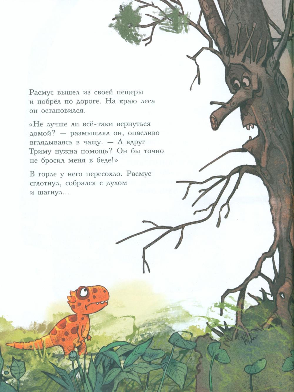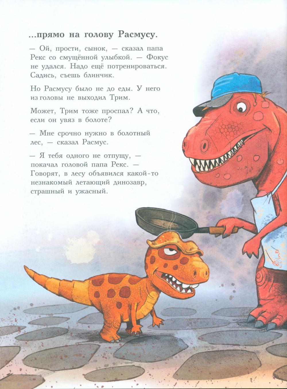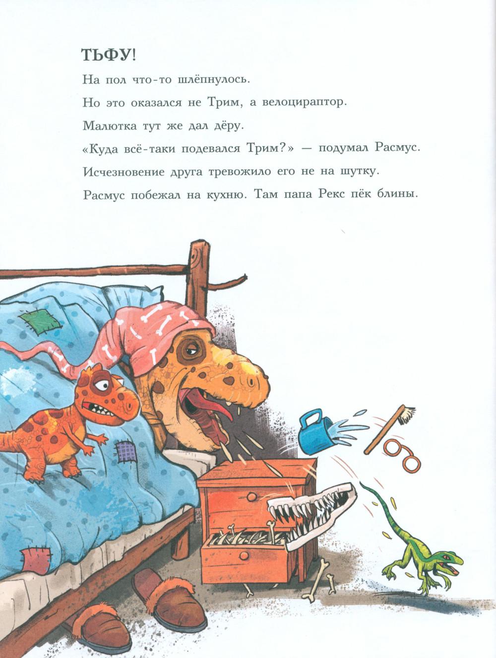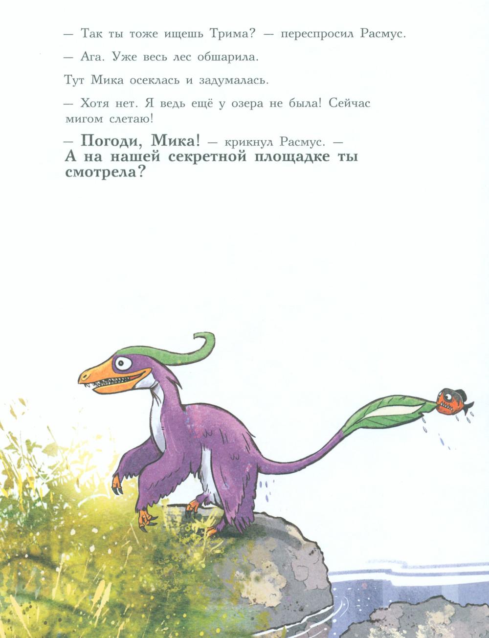 Каждая книга серии «Друзья-динозаврики» рассказывает об одном дне из жизни тираннозаврика Расмуса Рекса и его лучшего друга Трима Троодона. В то утро Расмус открыл глаза и понял, что проспал. В сердце закралась тревога: обычно его будил Трим, а сегодня Трим не пришел. Не случилось ли какой-то беды? Расмус отправился искать друга в болотный лес, хотя идти туда в одиночку было ужасно страшно. На секретной площадке он наконец увидел Трима, но тот был не один, а с незнакомым летающим динозавром. Трим и его новый приятель качались на качелях и хохотали, а на Расмуса не обращали никакого внимания. Расмус постоял-постоял и побрел домой. Таким потерянным и ненужным он себя еще никогда не чувствовал. Разве настоящие друзья так поступают?.. Вскоре Трим догнал Расмуса, извинился перед ним и недоразумение тут же забылось. Так дружба динозавриков прошла испытание на прочность. Серию книг о приключениях друзей-динозавриков сочинили и нарисовали писатель Ларс Мэле и художник Ларс Рудебьер. Они создали целую страну Динозаврию, где на каждой странице ребенка ждет что-то смешное и неожиданное. В книге много диалогов, поэтому она отлично подойдет для чтения вслух и разыгрывания по ролям с детьми от 4-х лет. Кроме увлекательного сюжета и симпатичных героев в книге есть небольшая познавательная часть, где рассказывается о том, кто такие динозавры, когда они жили на Земле и почему исчезли. А еще приводятся интересные факты о настоящих динозаврах - прототипах героев этой книги.| Издательство | Мелик-Пашаев |