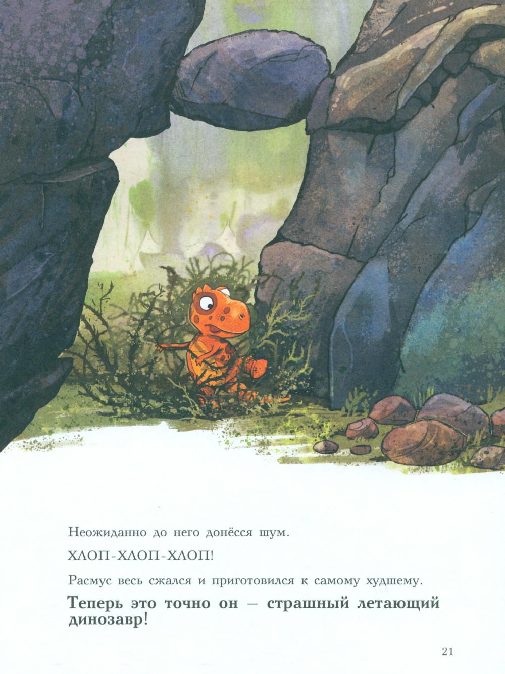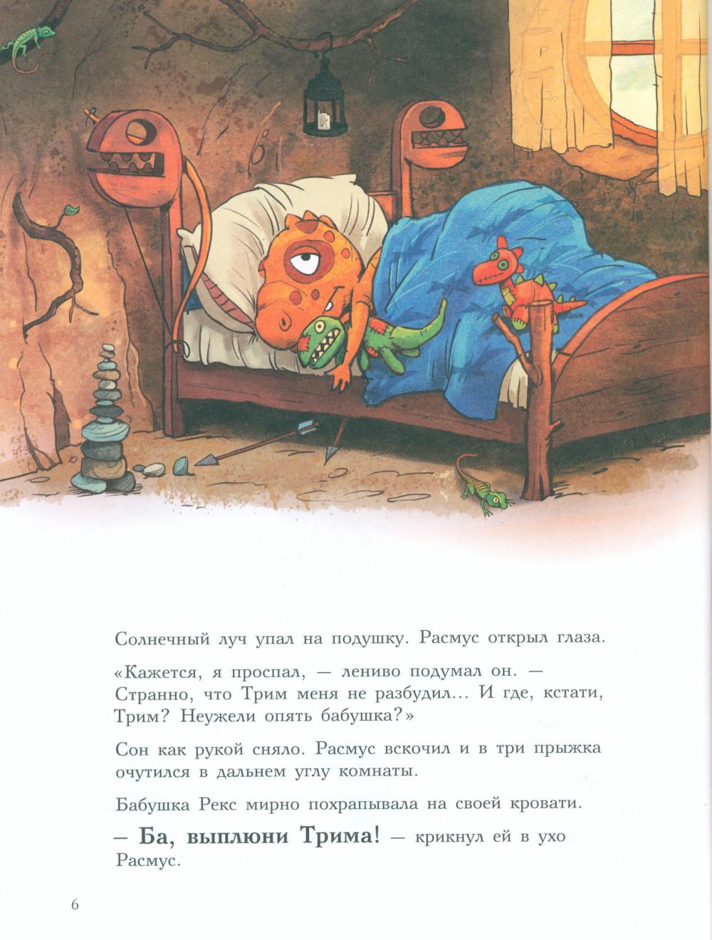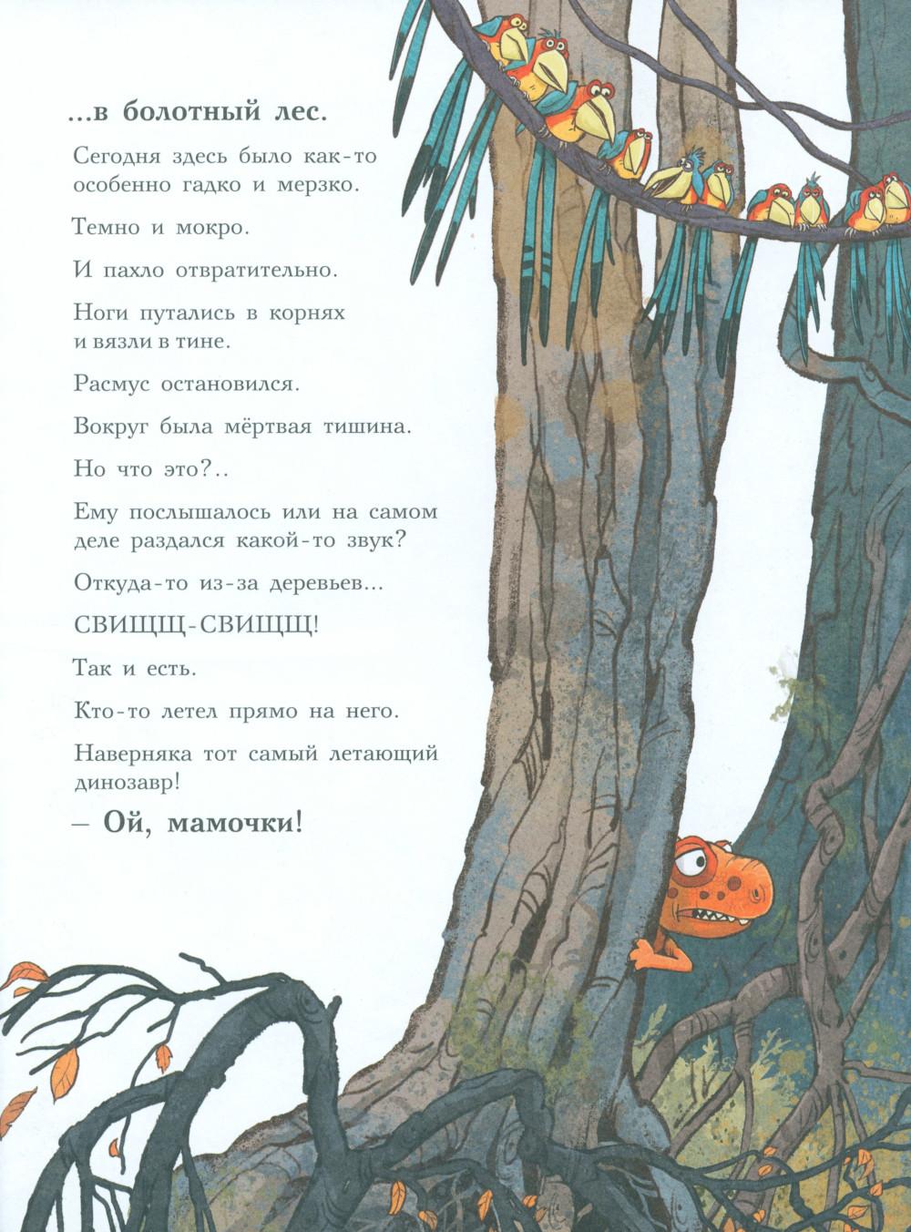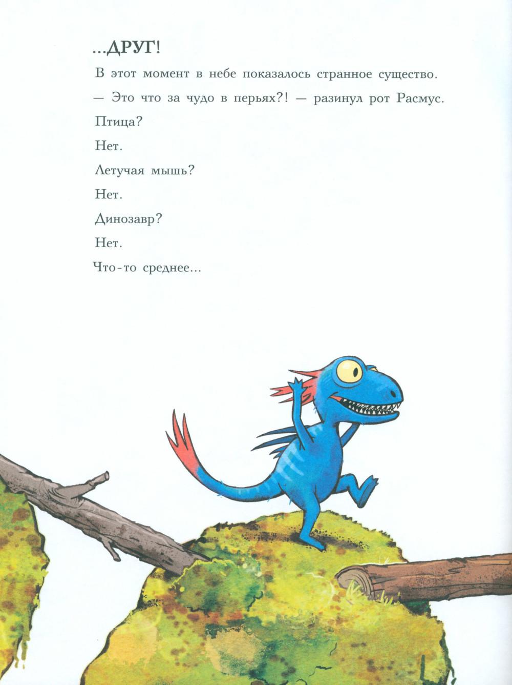 Каждая книга серии «Друзья-динозаврики» рассказывает об одном дне из жизни тираннозаврика Расмуса Рекса и его лучшего друга Трима Троодона. В то утро Расмус открыл глаза и понял, что проспал. В сердце закралась тревога: обычно его будил Трим, а сегодня Трим не пришел. Не случилось ли какой-то беды? Расмус отправился искать друга в болотный лес, хотя идти туда в одиночку было ужасно страшно. На секретной площадке он наконец увидел Трима, но тот был не один, а с незнакомым летающим динозавром. Трим и его новый приятель качались на качелях и хохотали, а на Расмуса не обращали никакого внимания. Расмус постоял-постоял и побрел домой. Таким потерянным и ненужным он себя еще никогда не чувствовал. Разве настоящие друзья так поступают?.. Вскоре Трим догнал Расмуса, извинился перед ним и недоразумение тут же забылось. Так дружба динозавриков прошла испытание на прочность. Серию книг о приключениях друзей-динозавриков сочинили и нарисовали писатель Ларс Мэле и художник Ларс Рудебьер. Они создали целую страну Динозаврию, где на каждой странице ребенка ждет что-то смешное и неожиданное. В книге много диалогов, поэтому она отлично подойдет для чтения вслух и разыгрывания по ролям с детьми от 4-х лет. Кроме увлекательного сюжета и симпатичных героев в книге есть небольшая познавательная часть, где рассказывается о том, кто такие динозавры, когда они жили на Земле и почему исчезли. А еще приводятся интересные факты о настоящих динозаврах - прототипах героев этой книги.| Издательство | Мелик-Пашаев |