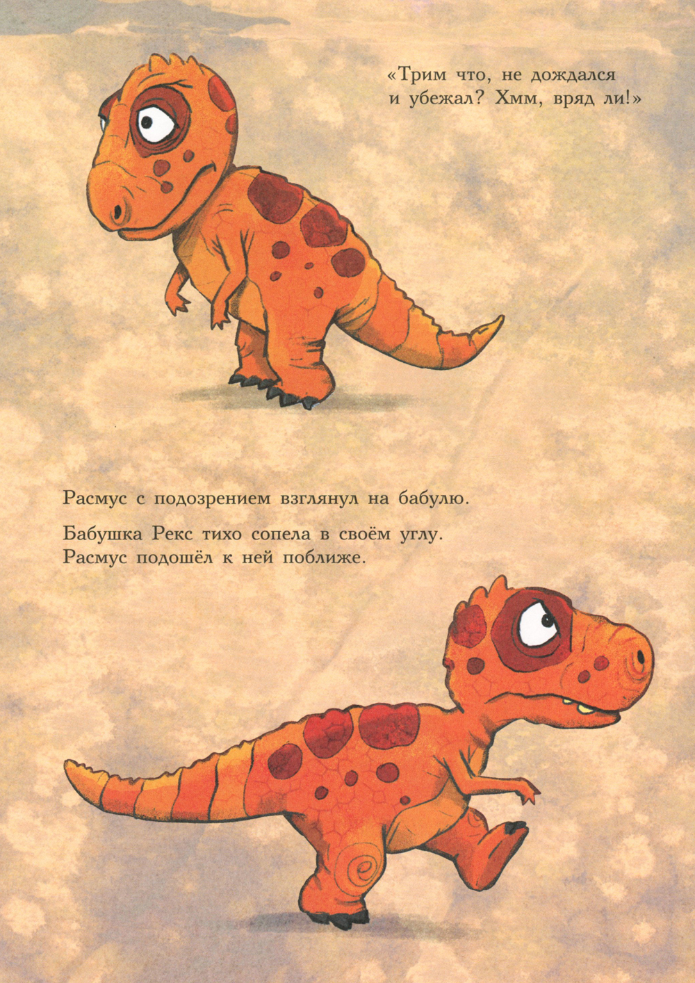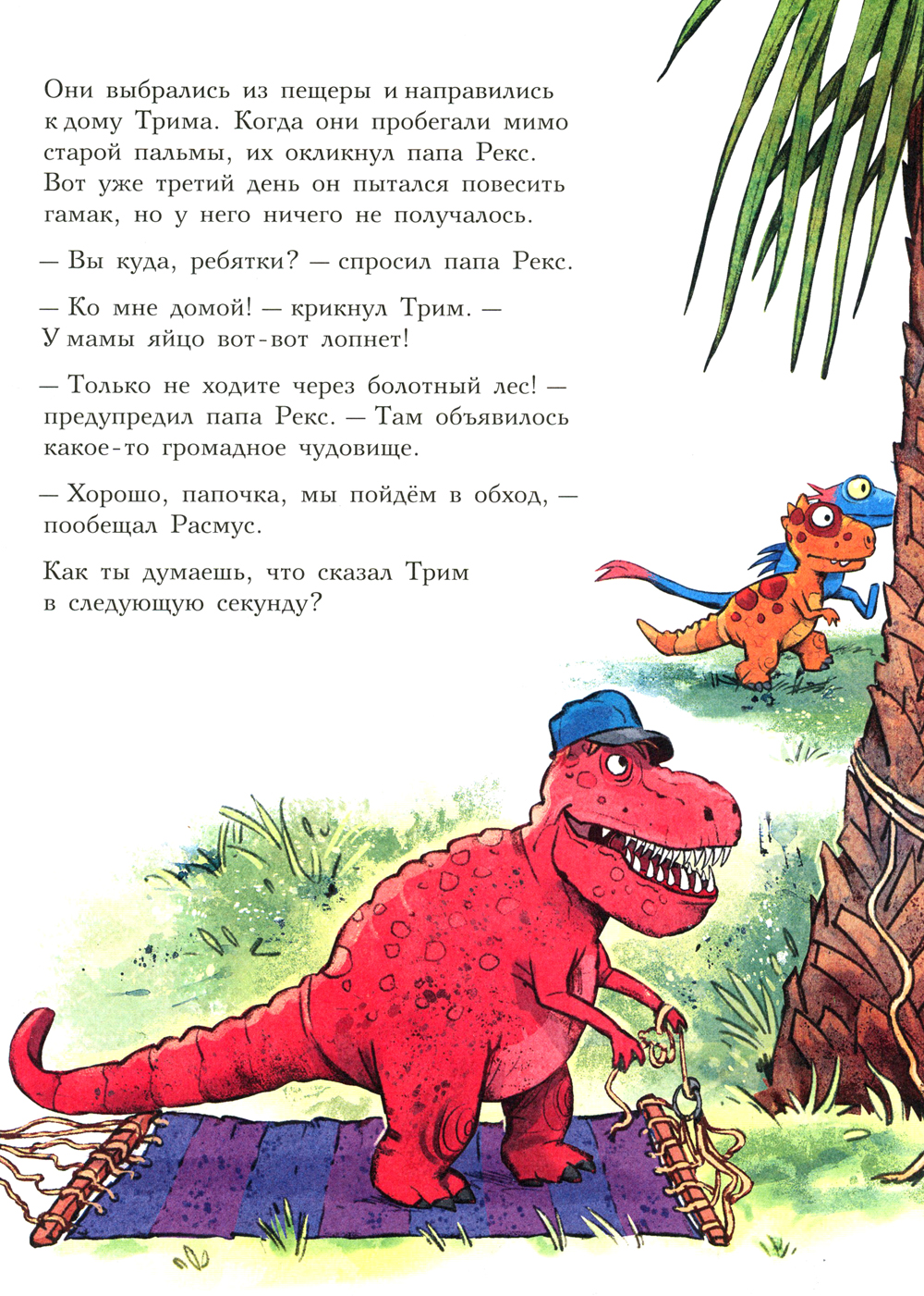Каждая книга серии «Друзья-динозаврики» рассказывает об одном дне из жизни тираннозаврика Расмуса Рекса и его лучшего друга Трима Троодона. В первой книге друзья идут через густой и опасный болотный лес, чтобы не пропустить радостное событие: у мамы Трима вот-вот проклюнется яйцо. Родители строго-настрого запрещают им ходить через лес, тем более недавно там объявилось какое-то громадное чудовище. Трусоватый и послушный Расмус предлагает идти в обход, но бесстрашный искатель приключений Трим тащит его короткой дорогой через трясину. На каждом шагу друзей подстерегает опасность, и душа у Расмуса поминутно уходит в пятки от страха. Правда, всякий раз тревога оказывается ложной: в лесу они натыкаются на своих друзей, каждый из которых занят каким-то очень важным делом. А потом они встречают строгую маму Расмуса - сейчас им влетит за то, что они нарушили запрет! Однако мама Рекс, узнав, что у Трима должен появиться братишка, смягчается и провожает их до пещеры Трима. А там всех их ждет сюрприз. Из яйца вылупляется не братишка и даже не сестренка Трима, а совсем другой детеныш...