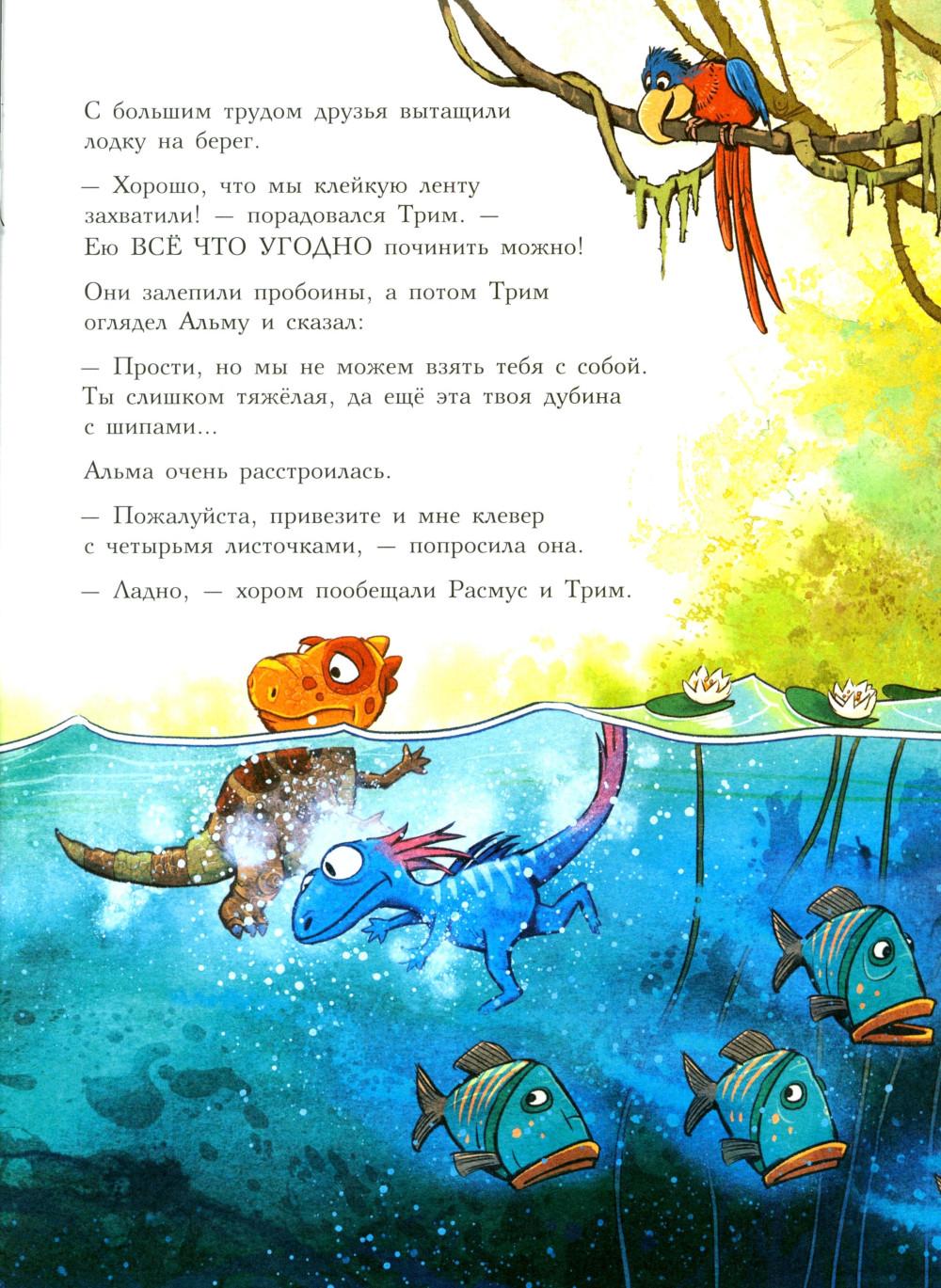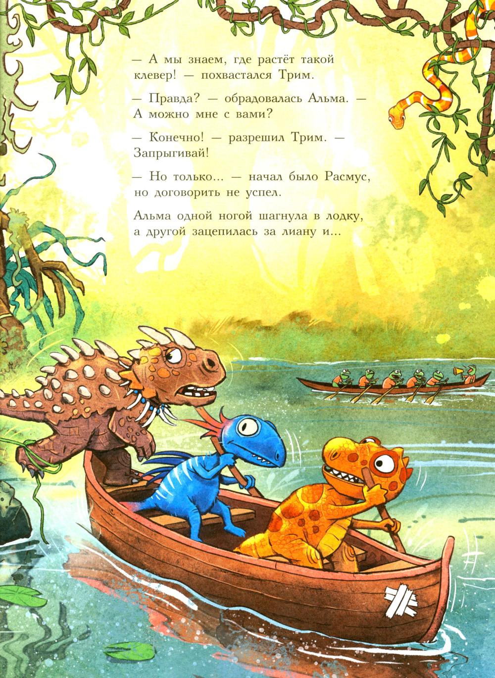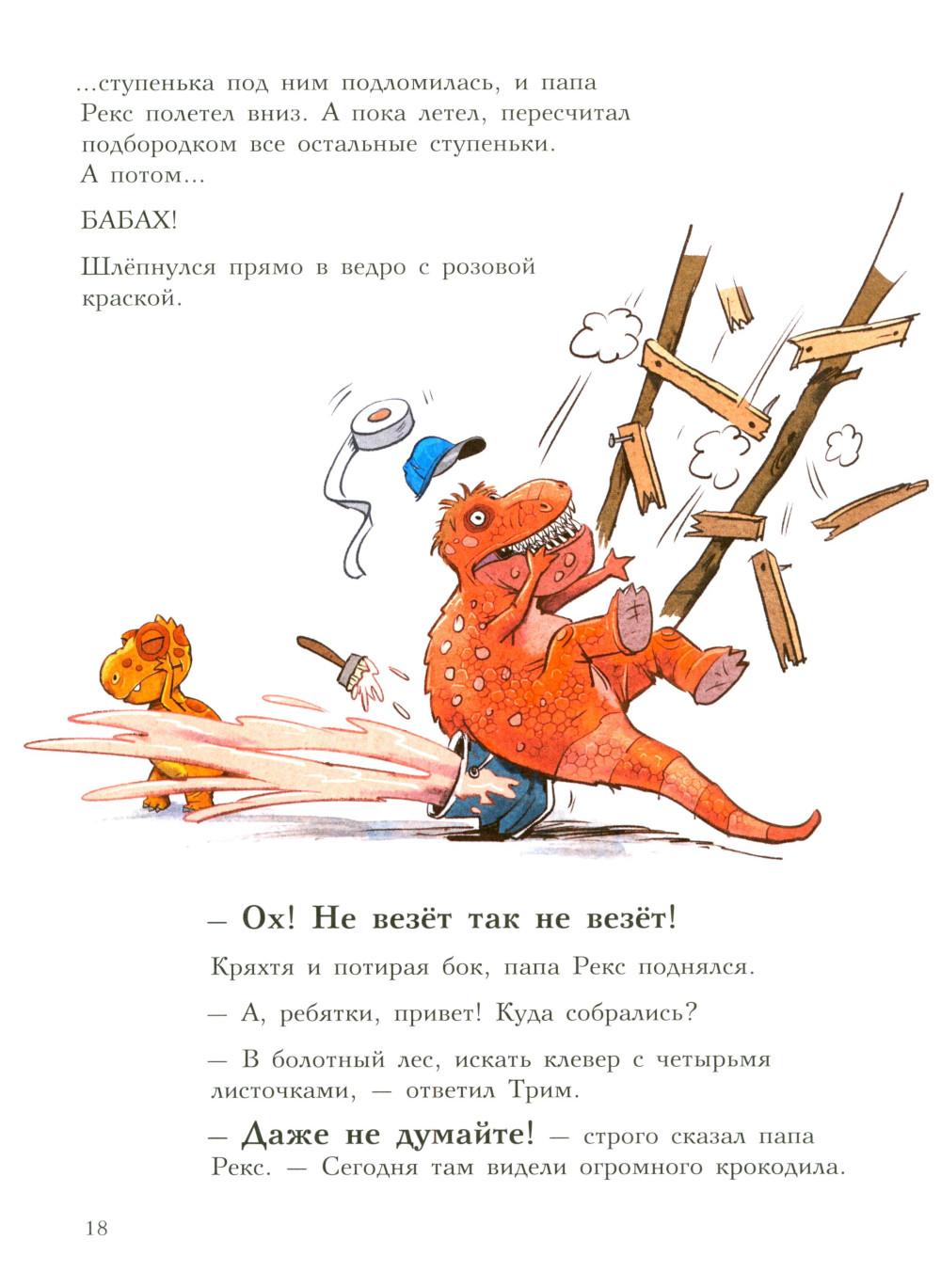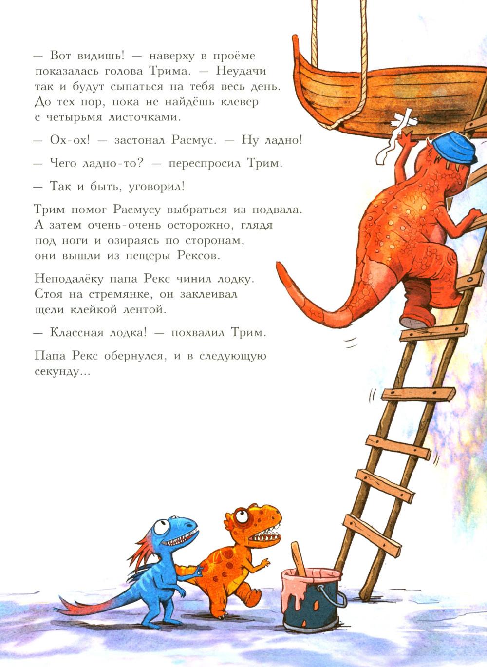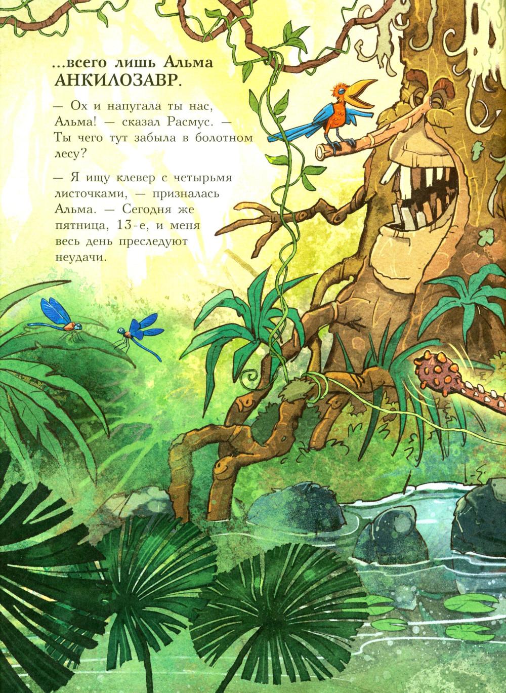 Каждая книга серии «Друзья-динозаврики» рассказывает об одном дне из жизни тираннозаврика Расмуса Рекса и его лучшего друга Трима Троодона. И вот как раз этот день у Расмуса не задался с утра. Только он встал с кровати, как поскользнулся, упал и врезался носом в комод. А всего через пару минут под ним проломилась половица, и он рухнул в подвал. Почему? Да потому, что сегодня была пятница, 13-е - день невезения! Хорошо, что Трим знал способ, как избавиться от всех несчастий. Надо найти клевер-четырехлистник, закрыть глаза, загадать желание, бросить клевер через левое плечо, и - опля! - желание сбудется! Правда, растет этот ключик к удаче в самой чаще болотного леса, на лугу под Голубой горой. Друзья берут у папы Рекса лодку и отправляются за клевером по реке, даже не представляя, сколько опасностей их ждет впереди… Серию книг о приключениях друзей-динозавриков сочинили и нарисовали писатель Ларс Мэле и художник Ларс Рудебьер. Вместе они создали целую страну Динозаврию, где на каждой странице ребенка ждет что-то смешное и неожиданное. В книге много диалогов, поэтому она отлично подойдет для чтения вслух и разыгрывания по ролям с детьми от 4-х лет. Кроме увлекательного сюжета и симпатичных героев в книге есть небольшая познавательная часть, где рассказывается о том, кто такие динозавры, когда они жили на Земле и почему исчезли. А еще приводятся интересные факты о крокодилах, которые обитали на Земле в одно время с динозаврами.| Издательство | Мелик-Пашаев |