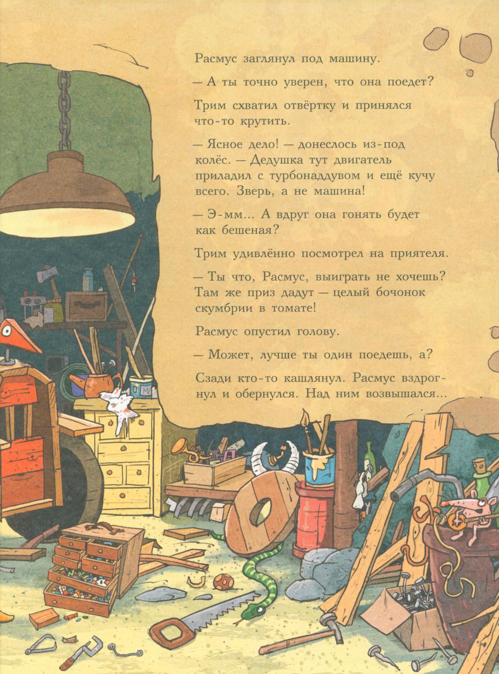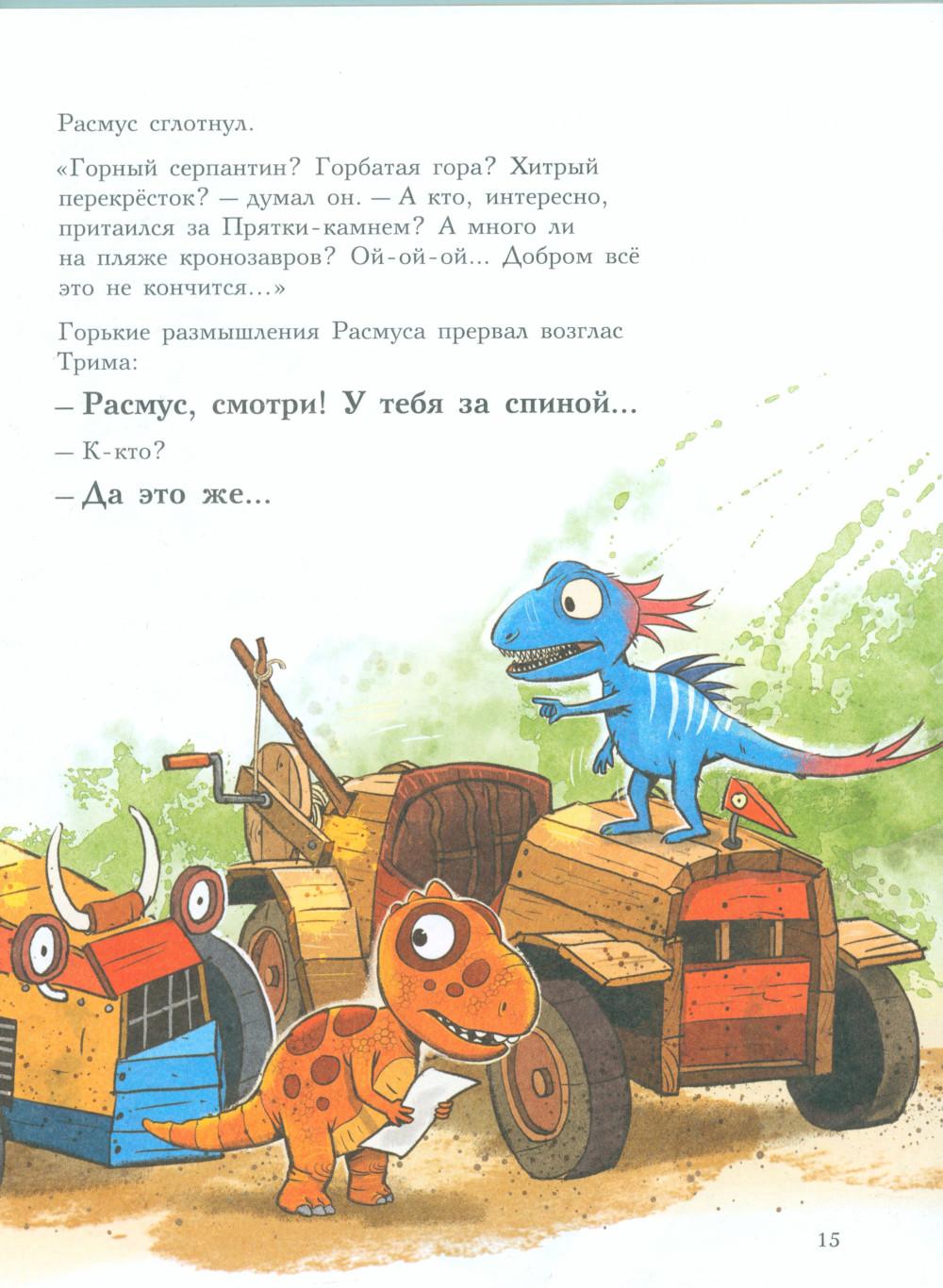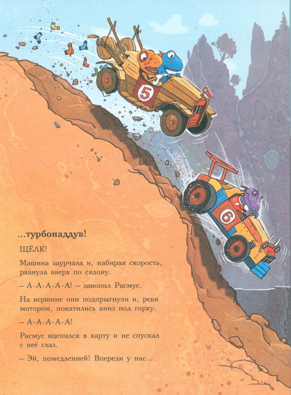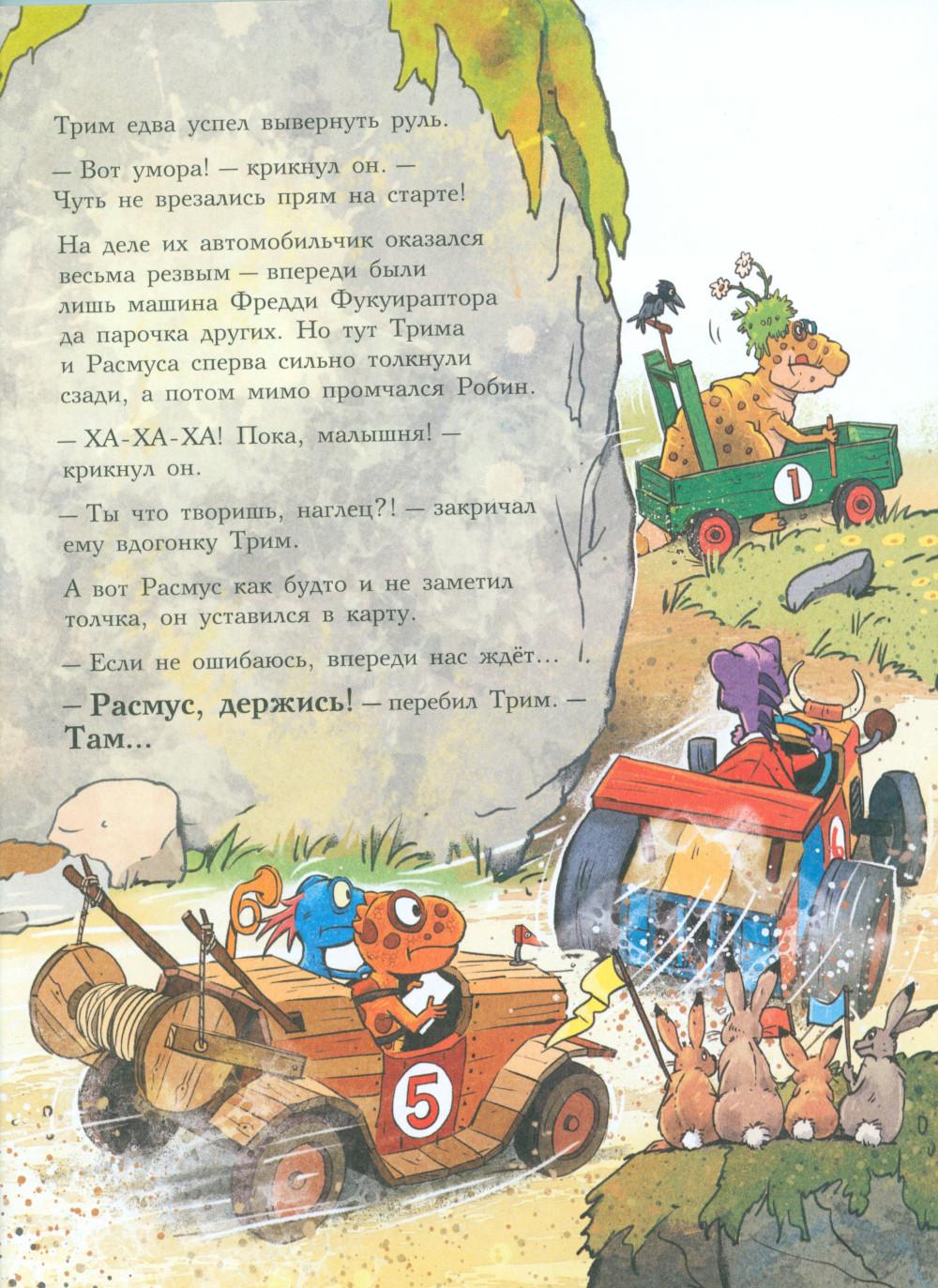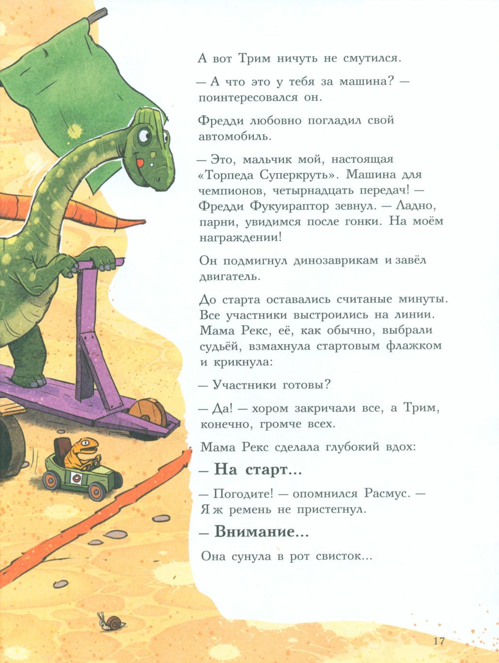 Каждая книга серии «Друзья-динозаврики» рассказывает об одном дне из жизни тираннозаврика Расмуса Рекса и его лучшего друга Трима Троодона. В тот день в Динозаврии стартовала Супергонка Болотного леса. Её устраивали в Динозаврии каждый год, но раньше Расмус и Трим в ней не участвовали - не на чем было. А в этом году у них появился автомобиль. Трим случайно наткнулся на него в тайной комнате механизмов и изобретений своего дедушки и уговорил деда подготовить автомобиль к Супергонке. Дедушка Троодон напридумывал кучу полезных приспособлений, и старая машина преобразилась - она стала быстрой, маневренной и безопасной. Впервые в жизни водителю Триму и штурману Расмусу предстояло пройти сложнейшую трассу. Несмотря на это, Трим был уверен, что они победят. Расмус, напротив, сильно сомневался, что они смогут преодолеть все препятствия и выиграть у Фредди Фукуираптора - супергонщика, который последние пять лет выходил победителем. Гонку друзья не выиграли, зато вывели обманщика и горе-чемпиона Фредди Фукуираптора на чистую воду. Серию о приключениях друзей-динозавриков сочинили и нарисовали писатель Ларс Мэле и художник Ларс Рудебьер. Вместе они создали целую страну Динозаврию, где на каждой странице ребёнка ждёт что-то смешное и неожиданное. В книге много диалогов, поэтому она отлично подойдёт для чтения вслух и разыгрывания по ролям с детьми от 4-х лет. Кроме увлекательного сюжета и симпатичных героев в книге есть небольшая познавательная часть. В ней рассказывается о том, какие динозавры были самыми быстрыми (без всякого автомобиля) и откуда учёные узнают, с какой скоростью бегали динозавры - ведь все они давным-давно вымерли!| Издательство | Мелик-Пашаев |