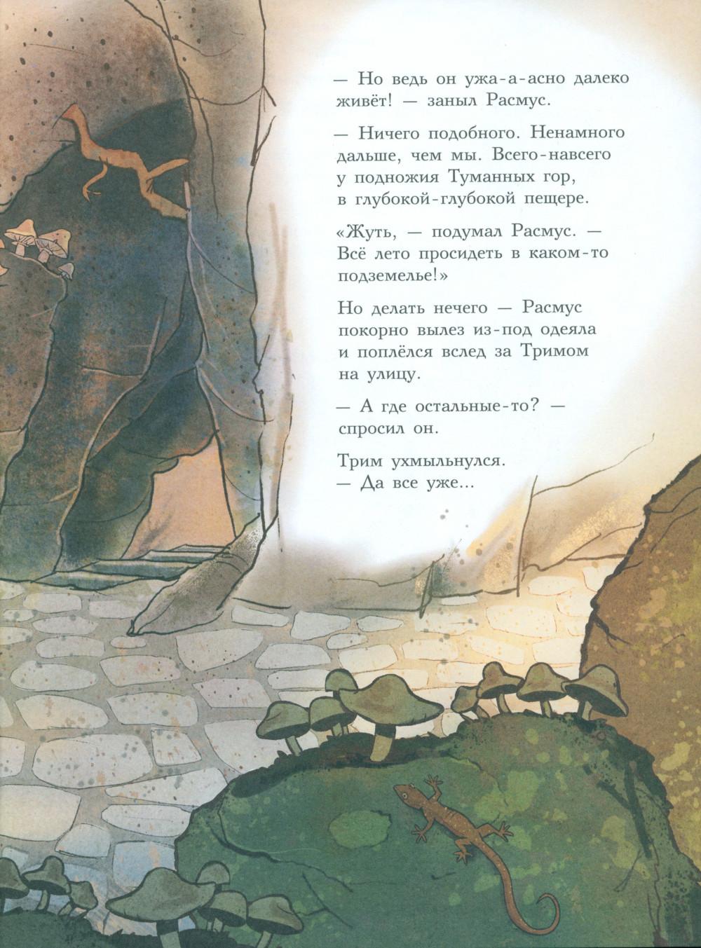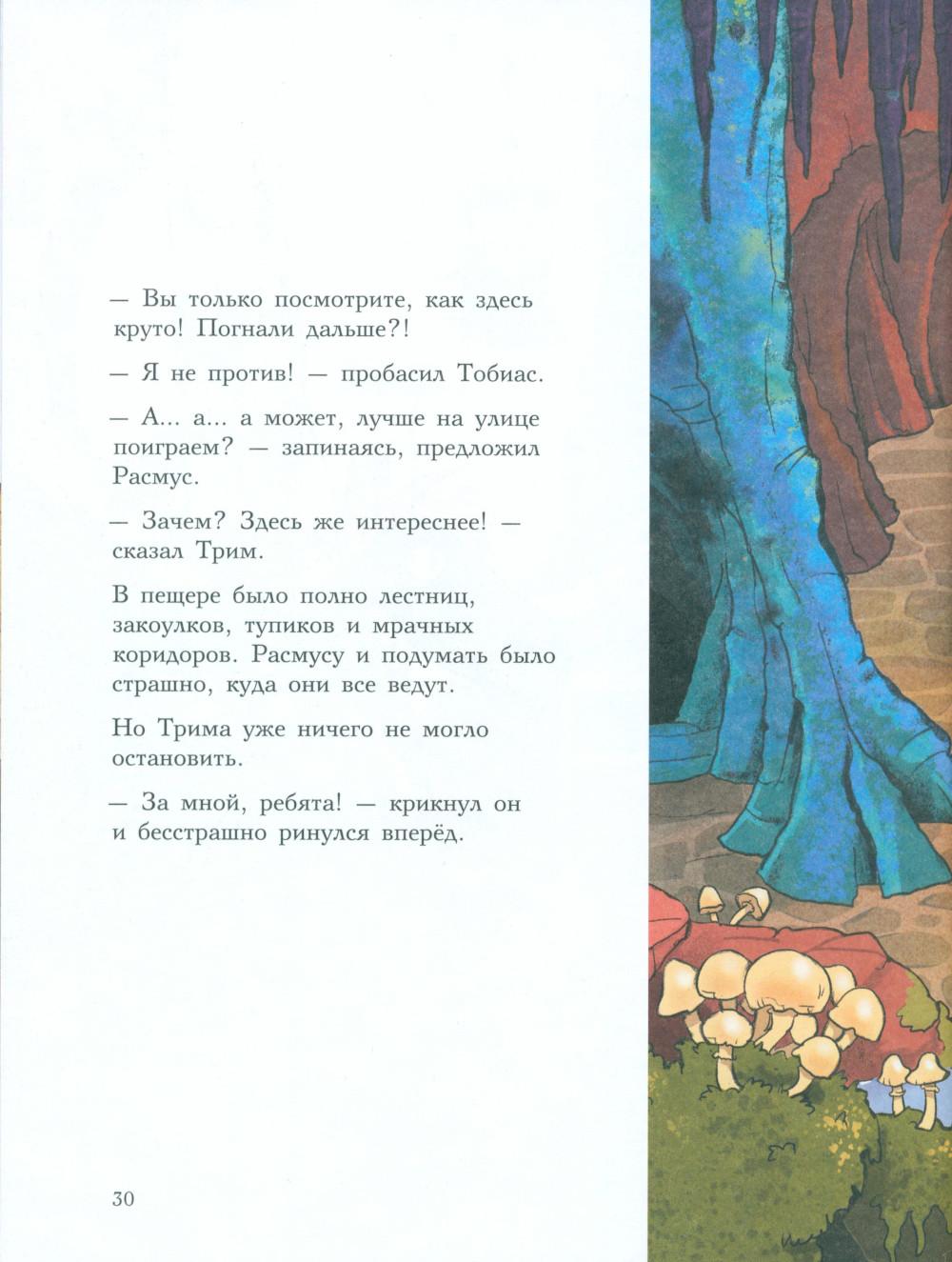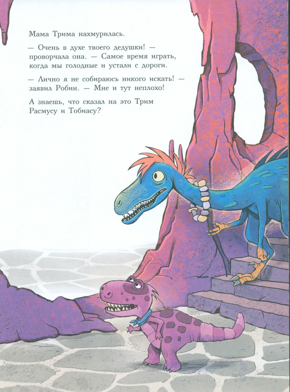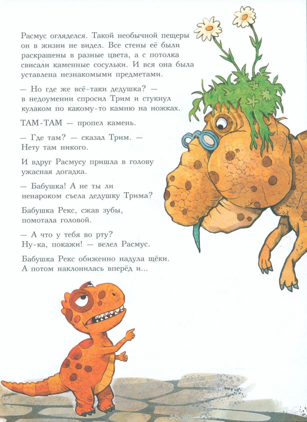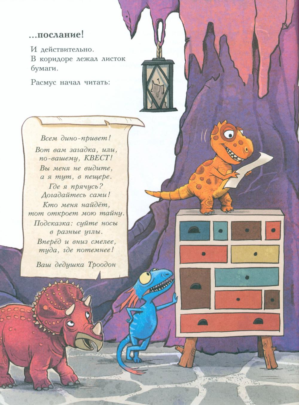 Каждая книга серии «Друзья-динозаврики» рассказывает об одном дне из жизни тираннозаврика Расмуса Рекса и его лучшего друга Трима Троодона. В то утро Трим разбудил Расмуса ни свет ни заря. Оказывается, семейство Рексов и семейство Троодонов давно договорились отправиться сегодня к дедушке Трима! А Расмус совершенно об этом забыл. Ему страшно не хотелось тащиться в такую даль, к подножию Туманных гор. И для чего? Чтобы все лето просидеть в какой-то темной пещере! Но уговор есть уговор, и, конечно, Расмус тоже пошел со всеми. Когда же путешественники добрались наконец до места, дедушки они там не увидели, зато обнаружили письмо. В послании говорилось, что найти деда Трима, а заодно узнать его тайну можно, только пройдя квест по лабиринту коридоров, темных закоулков, спусков и подъемов огромной пещеры хозяина - самого большого выдумщика на свете! Серию книг о приключениях друзей-динозавриков сочинили и нарисовали писатель Ларс Мэле и художник Ларс Рудебьер. Вместе они создали целую страну Динозаврию, где на каждой странице ребенка ждет что-то смешное и неожиданное. В книге много диалогов, поэтому она отлично подойдет для чтения вслух и разыгрывания по ролям с детьми от 4-х лет. Кроме увлекательного сюжета и симпатичных героев в книге есть небольшая познавательная часть, где рассказывается о том, кто такие динозавры, когда они жили на Земле и почему исчезли. А еще приводятся интересные факты о некоторых настоящих динозаврах, которые упоминаются в этой книге.| Издательство | Мелик-Пашаев |