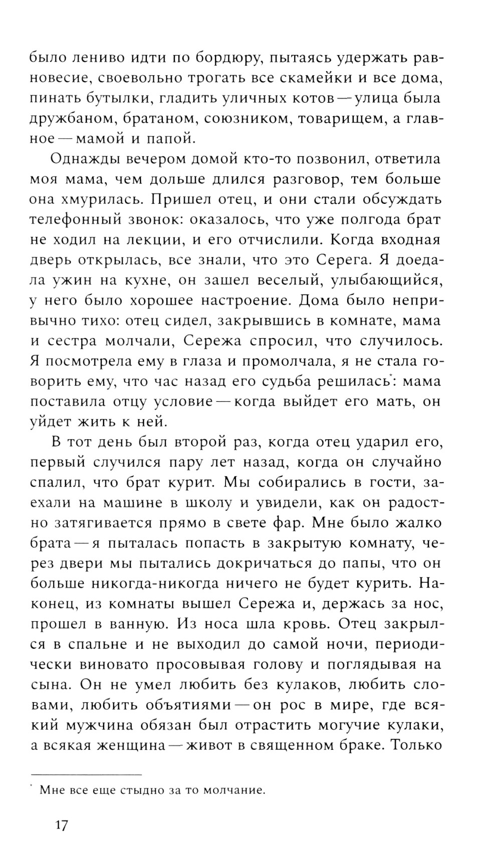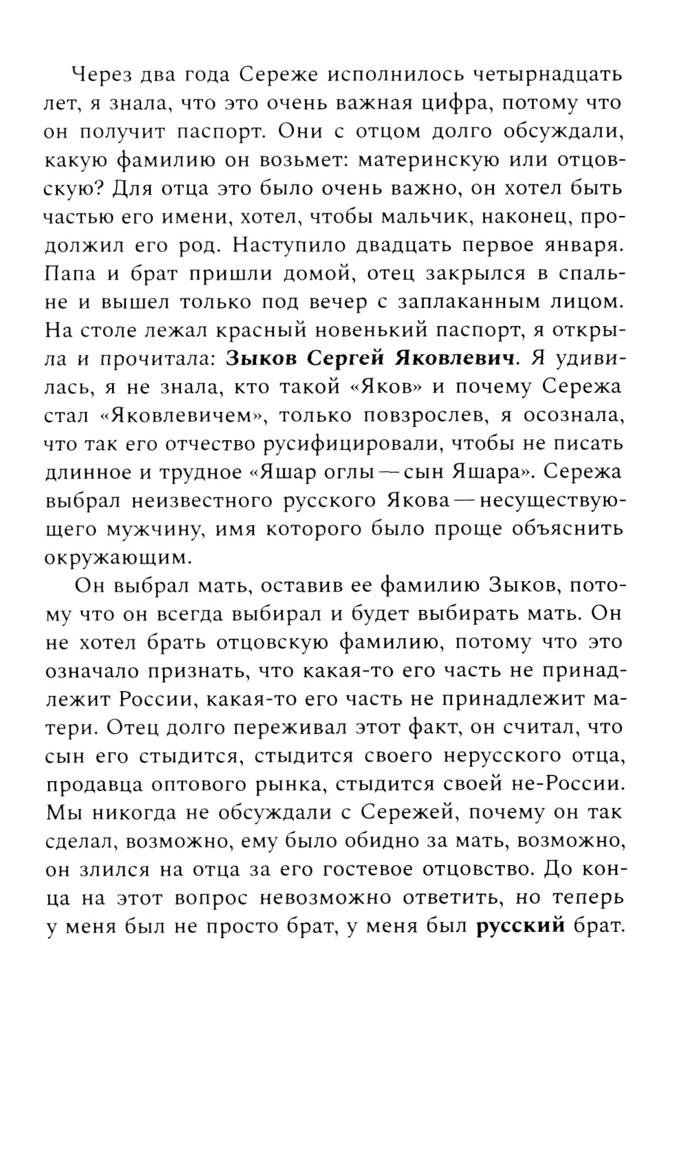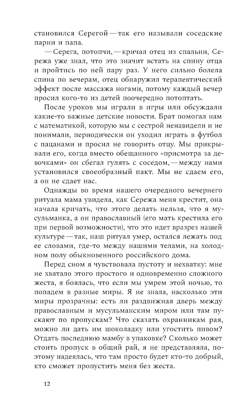 «Этот текст похож на российскую дорогу: он неровный, с кочками и ямами, с ремонтом посреди трассы. У меня нет навигатора по жизни Сереги, поэтому все, что мне остается, - ехать на ощупь». В книге Егана Джаббарова предпринимает попытку реконструировать короткую биографию сводного брата Сергея, родившегося от внебрачной связи ее отца. Следуя за братом по маршруту, который привел его к ранней и трагической смерти, автор обнаруживает, что сквозь историю Сергея проступает история страны конца 1990 х - начала 2000 х: межэтническое напряжение, нищета, борьба за выживание, эпидемия зависимостей и кризис идентичности. В то же время обращение к судьбе погибшего брата становится актом любви и памяти, единственным способом связать дискретные события его и своей жизни и преодолеть разрыв - культурный, религиозный, бытийный. Егана Джаббарова - писательница, поэтесса, эссеистка, автор книг «Руки женщин моей семьи были не для письма», «Красная кнопка тревоги», «Босфор» и «Поза Ромберга».