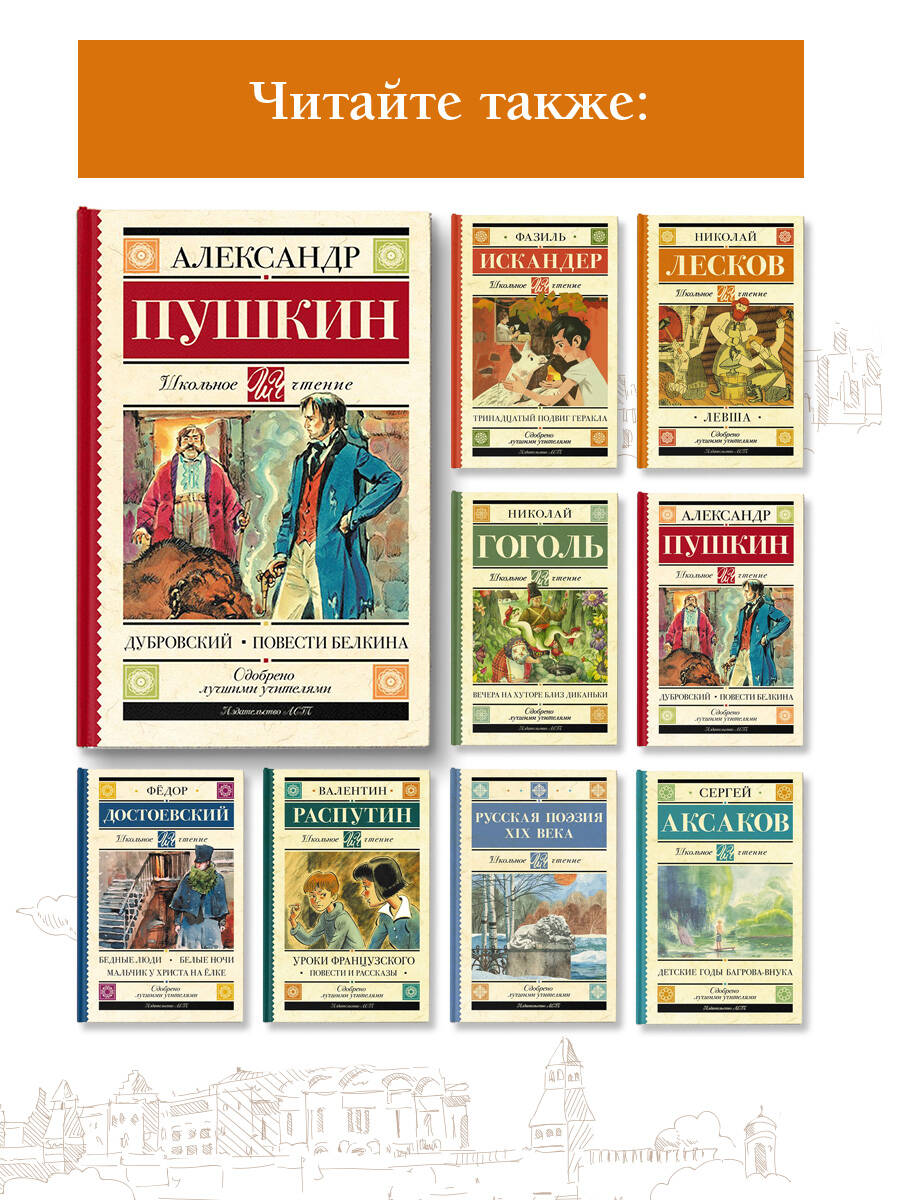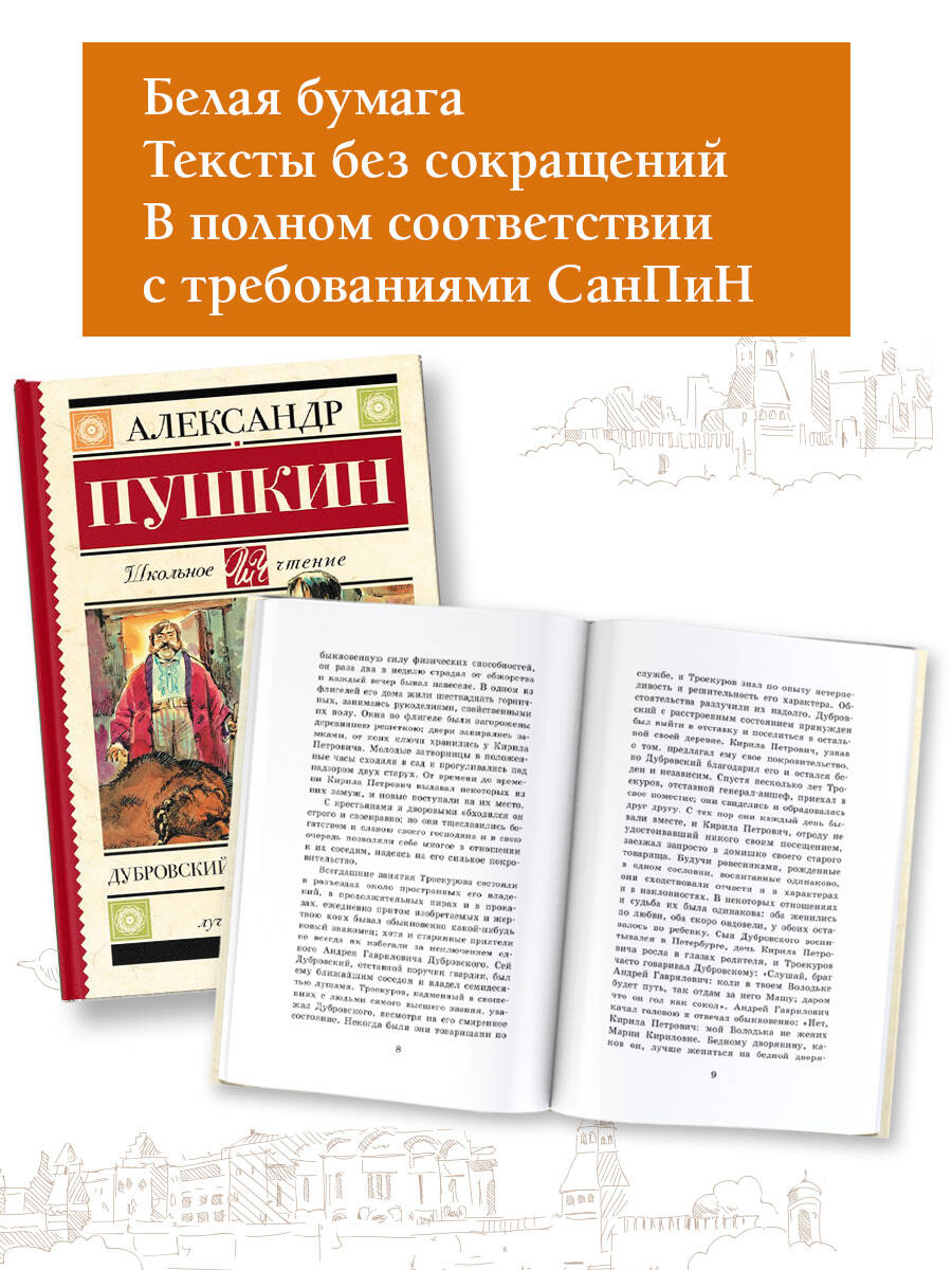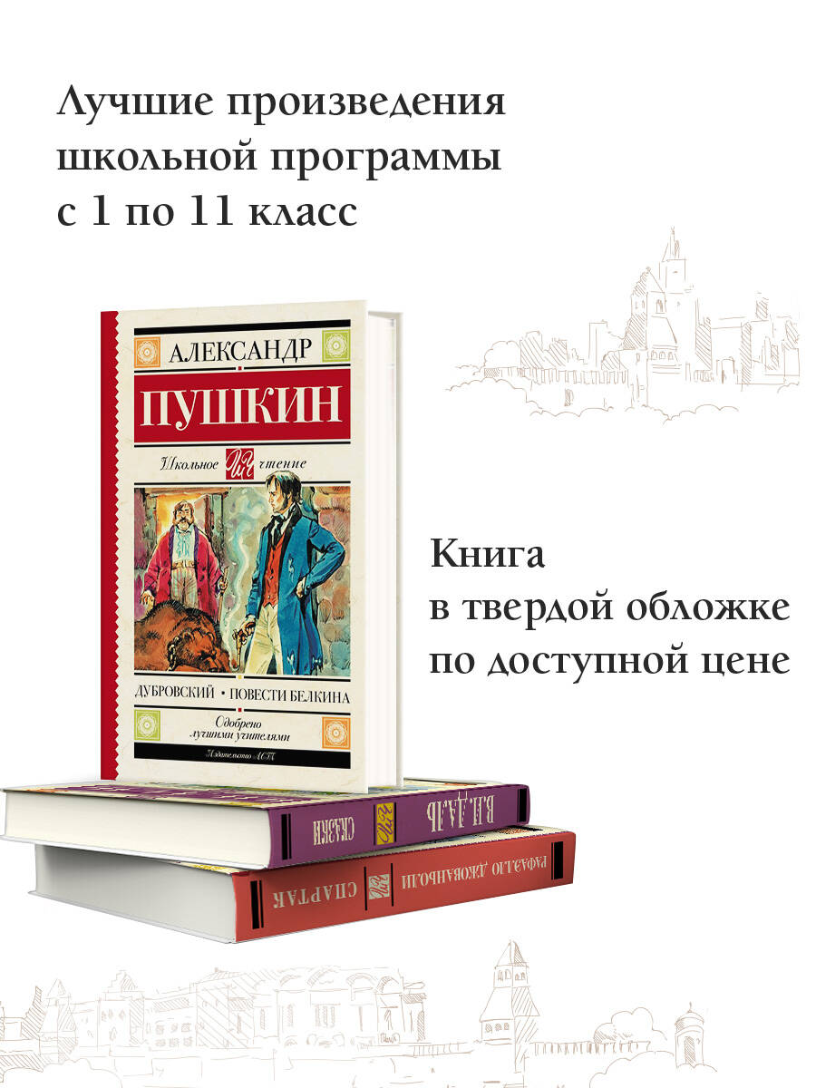 В книгу вошли два выдающихся произведения Александра Сергеевича Пушкина (1799 - 1837): роман «Дубровский» и «Повести Белкина». Главный герой романа «Дубровский» (1841), Владимир Дубровский, - благородный разбойник. Судьба заставила его встать на преступный путь: он был несправедливо осуждён властями за поджог и убийство. Дубровский жаждет отомстить своему врагу - сумасбродному помещику Кириллу Троекурову, который довёл его отца до смерти и дал ложные показания против Дубровского в суде. Владимир нанимается в дом Троекурова под видом гувернёра. Однако его планам не суждено сбыться: неожиданно он влюбляется в дочь Троекурова - Машу… «Повести покойного Ивана Петровича Белкина» (1831) состоят из 5 повестей: «Выстрел», «Метель», «Гробовщик», «Станционный смотритель» и «Барышня-крестьянка». Все они являются образцами различных литературных стилей: это и реализм, и сентиментализм, и готическая повесть, и даже водевиль. «Повести Белкина» - уникальное произведение русской литературы XIX века, открывшее новые горизонты творческого развития для многих известных писателей. Книга входит в программу для обязательного чтения.| Издательство | ИЗДАТЕЛЬСТВО "АСТ" |