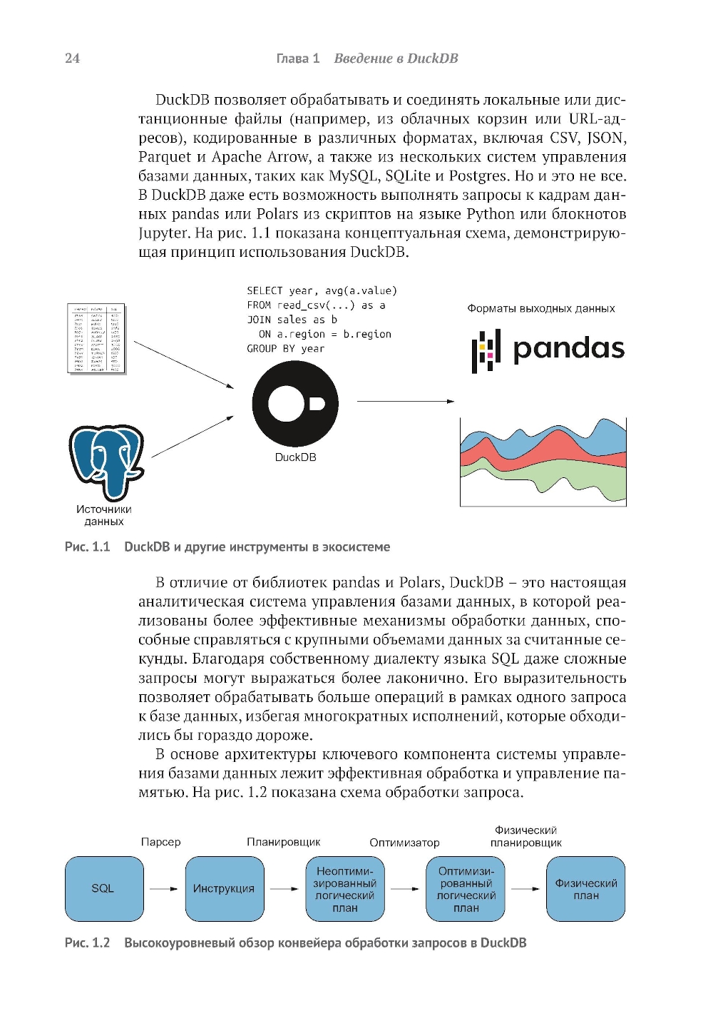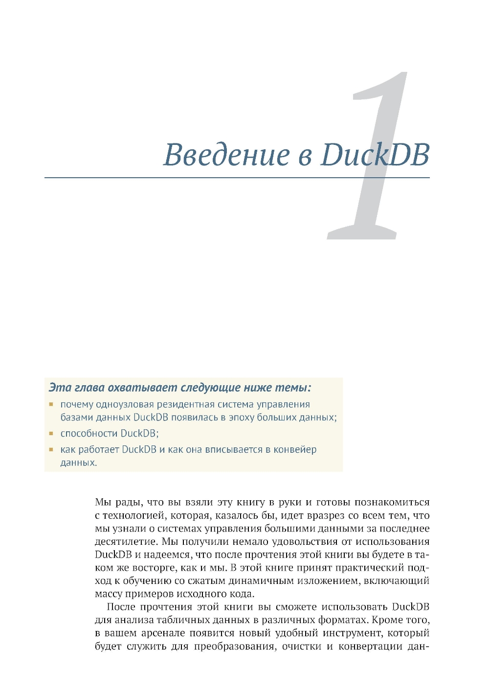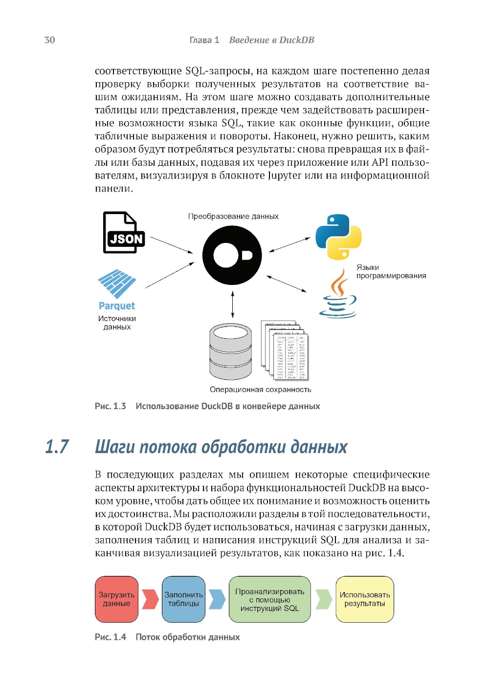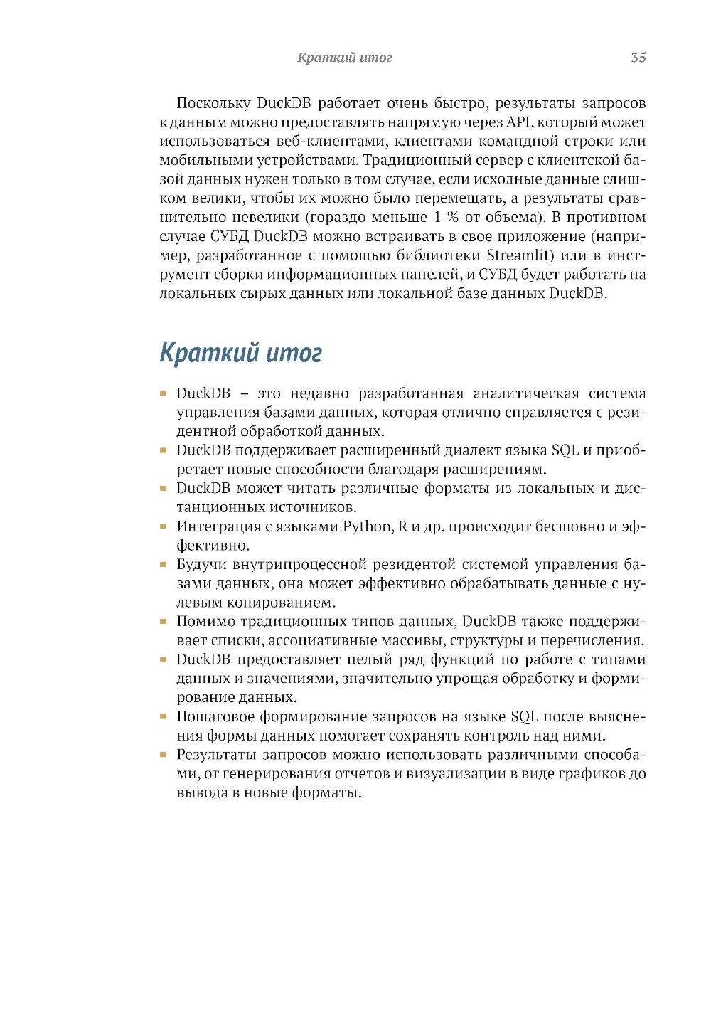 Книга рассказывает о приемах эффективной работы со столбцово-ориентированной системой управления базами данных DuckDB, которая легко встраивается в аналитические приложения, работает на ноутбуке и оперирует данными практически из любого источника, включая JSON, CSV, Parquet, SQLite и Postgres. Автор проведет вас по многочисленным примерам, начиная с настройки системы, формирования первого запроса на языке SQL и заканчивая сборкой конвейеров данных и встраиванием DuckDB в качестве локального хранилища данных для веб-приложений. Каждая новая тема сопровождается практическим проектом, благодаря чему вы сможете увидеть работу DuckDB в действии.| Издательство | ДМК Пресс |