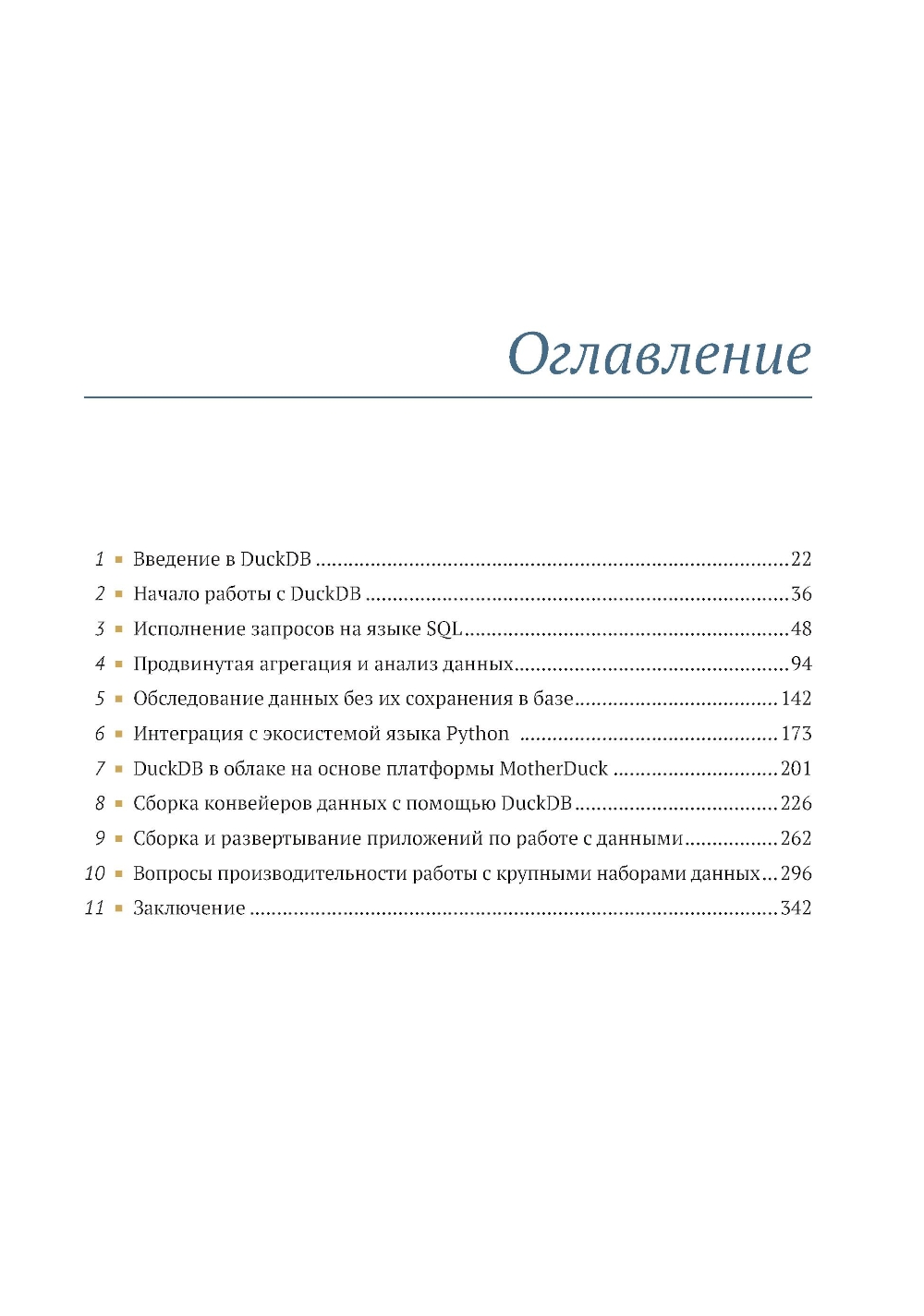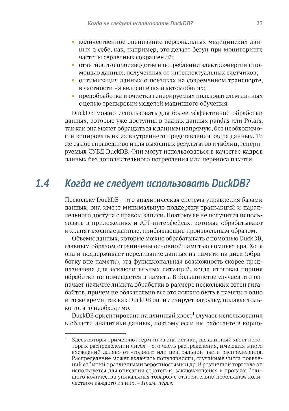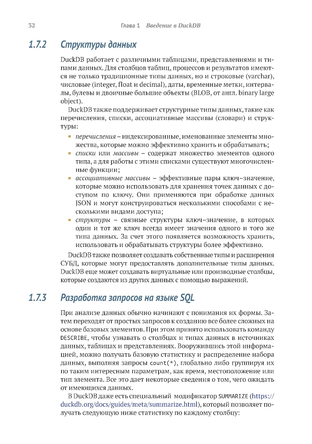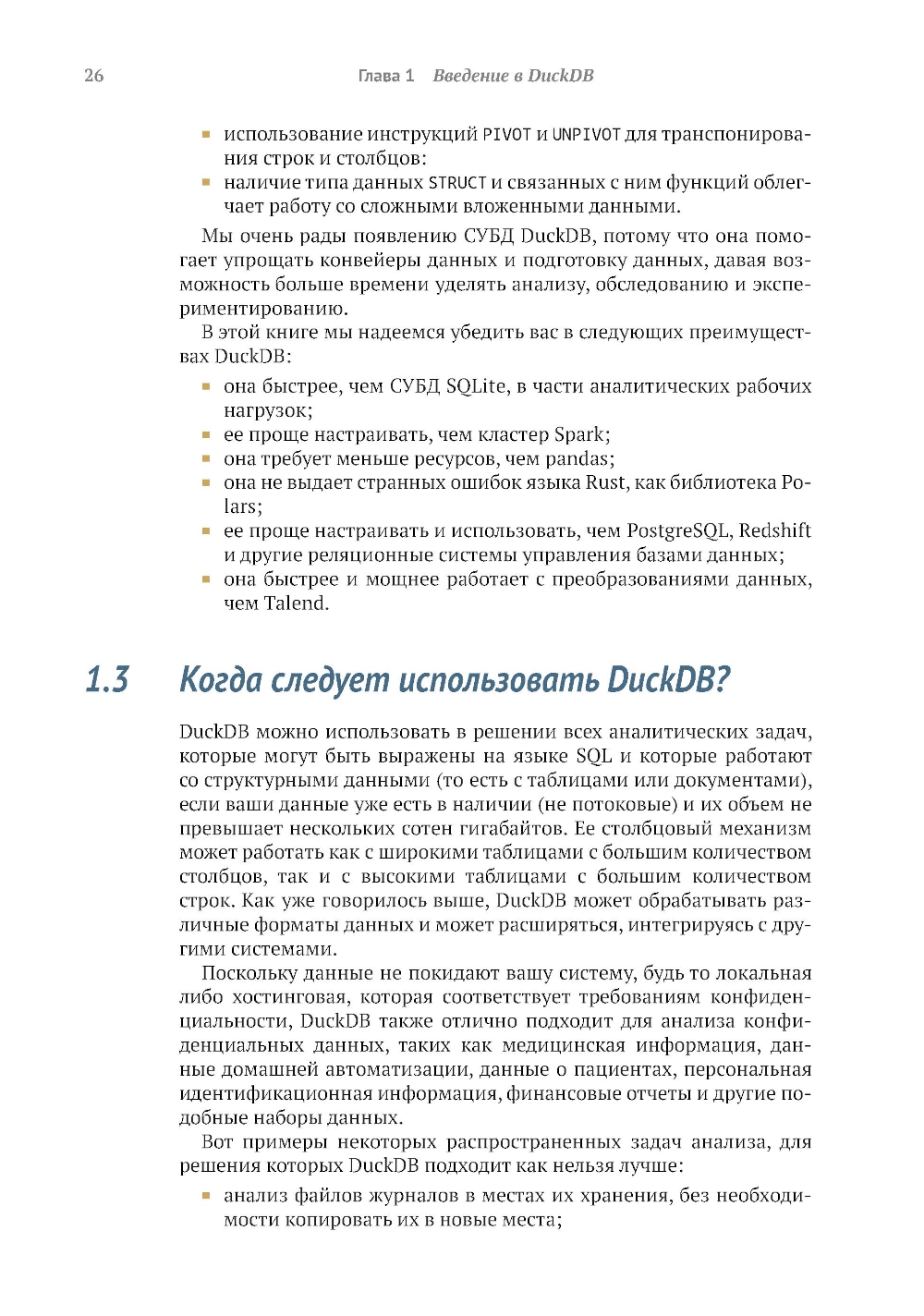Книга рассказывает о приемах эффективной работы со столбцово-ориентированной системой управления базами данных DuckDB, которая легко встраивается в аналитические приложения, работает на ноутбуке и оперирует данными практически из любого источника, включая JSON, CSV, Parquet, SQLite и Postgres. Автор проведет вас по многочисленным примерам, начиная с настройки системы, формирования первого запроса на языке SQL и заканчивая сборкой конвейеров данных и встраиванием DuckDB в качестве локального хранилища данных для веб-приложений. Каждая новая тема сопровождается практическим проектом, благодаря чему вы сможете увидеть работу DuckDB в действии.| Издательство | ДМК Пресс |