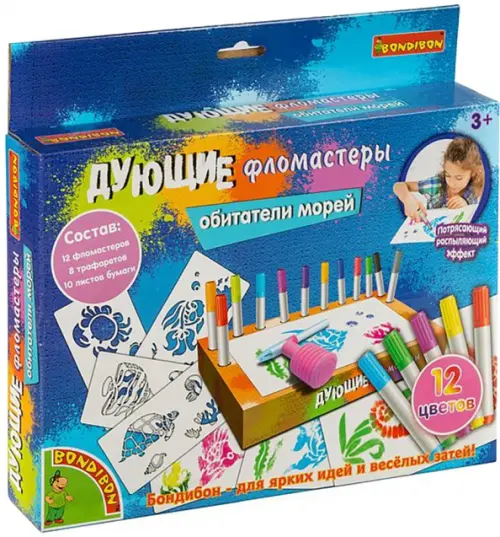 В наборе: 12 фломастеров, 8 трафаретов, 10 листов бумаги.