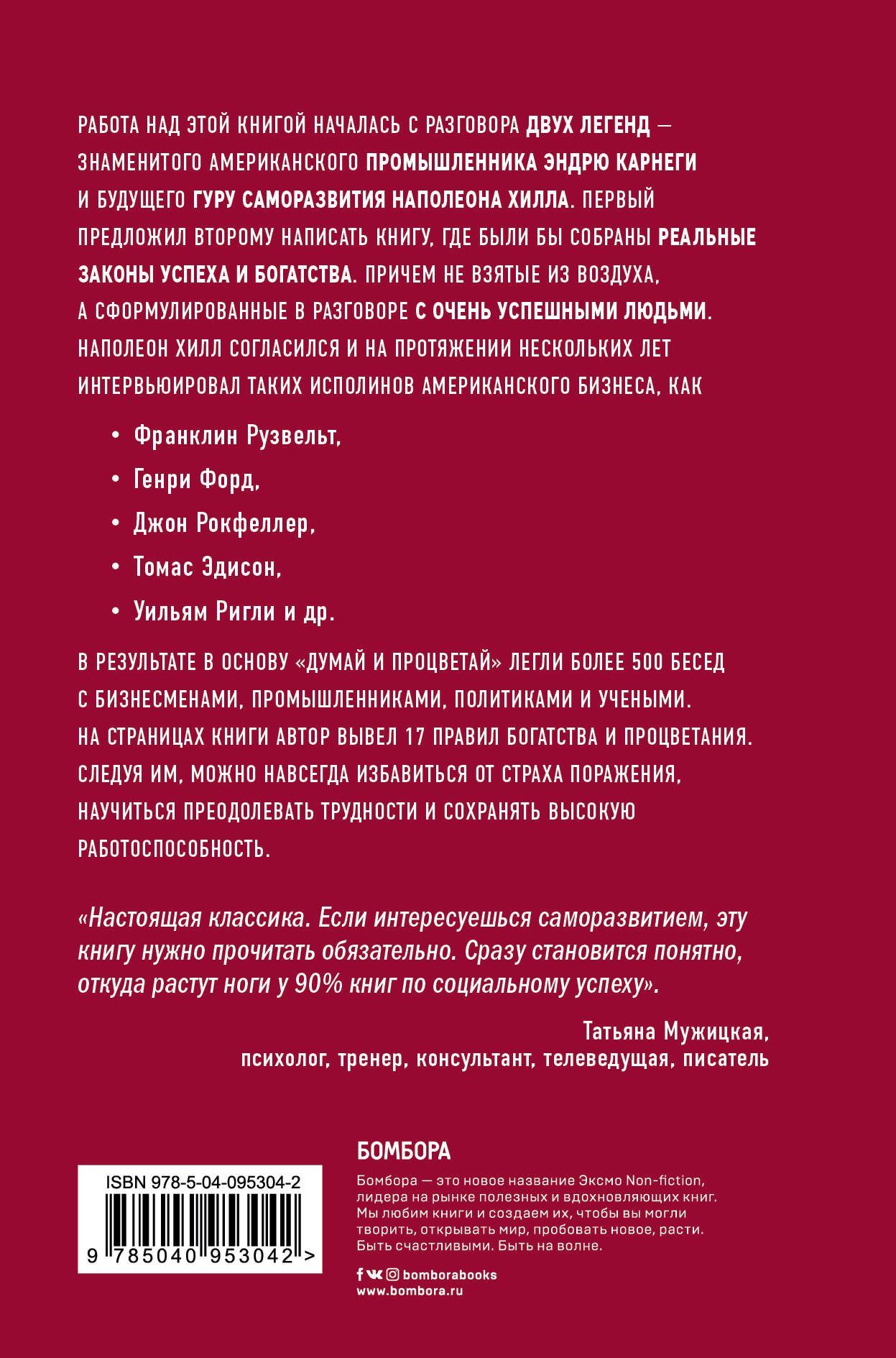 Благодаря идеям, которые легли в основу этой книги, были построены тысячи гиперуспешных бизнесов и заработаны миллионные состояния. Чтобы написать ее, Наполеон Хилл по договоренности с легендарным американским промышленником Эндрю Карнеги провел около 500 интервью с очень успешными людьми. Среди них: • Франклин Рузвельт, • Генри Форд, • Джон Рокфеллер, • Томас Эдисон, • Уильям Ригли и др. В беседах с этими исполинами американского бизнеса автор сформулировал 17 законов богатства и процветания. Следуя им, можно навсегда избавиться от страха поражения, научиться преодолевать трудности и сохранять высочайшую работоспособность.| Издательство | ООО "Издательство "Эксмо" |