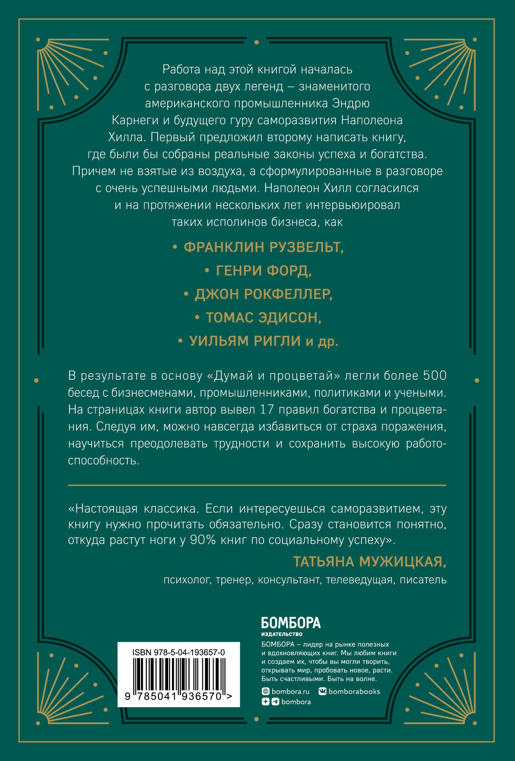 Эта книга была опубликована семью годами раньше «Думай и богатей». Несмотря на то что она мало чем уступала главному бестселлеру Наполеона Хилла, «Думай и процветай!» оказалась несколько менее популярной. Многие исследователи работ автора связывают это с неудачным временем ее издания - началом Великой депрессии, когда покупательская способность жителей США упала до минимума. Однако это не делает книгу менее ценной. Идеи, содержащиеся в ней, не только создали основу для будущего бестселлера, но и помогли миллионам читателей проложить свой путь к процветанию. В «Думай и процветай!» Хилл впервые опробовал свои знаменитые семнадцать правил успеха и убедился в том, что они способны творить чудеса. Наполеон Хилл представляет нам жизненные принципы, подходы и установки, почерпнутые непосредственно у величайших исторических фигур американского бизнеса, - результат пяти сотен бесед с гигантами делового мира его эпохи. Из этой книги вы узнаете: - Как превратить жгучее желание в реальные достижения. - Что отличает успешных людей от неудачников. - Какие страхи стоят на вашем пути к успеху. - Почему так важно заниматься накоплениями. - Как развить в себе навыки инициативы и лидерские качества. - Как развить воображение, чтобы оно начало подсказывать вам удачные идеи. - Как получать от людей то, что вы от них хотите.| Издательство | ООО "Издательство "Эксмо" |