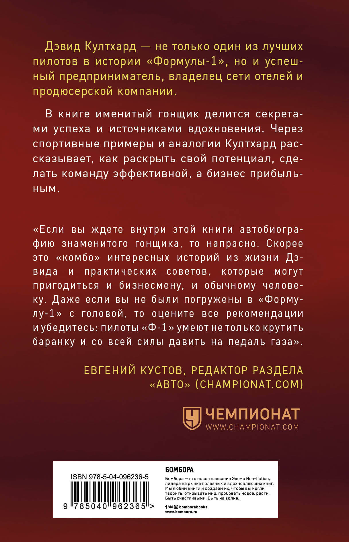 Лишь немногие некогда известные спортсмены смогли превратиться в медийных персон с огромным количеством навыков, шармом и ореолом успешности. Один из них - Дэвид Култхард. Это не только победитель тридцати Гран-при и знаток "Формулы‑1", но также владелец отельного бизнеса и кинопродюсерской компании. В книге Култхард просто и интересно рассказывает, как он смог овладеть всеми вышеперечисленными ремеслами, отточив мастерство за карьеру в самых требовательных автогонках мира. Это не только сборник увлекательных историй с участием Михаэля Шумахера, Себастьяна Феттеля и других именитых пилотов. Книга Култхарда - гид по бизнесу в спорте и спорту в бизнесе.| Издательство | ООО "Издательство "Эксмо" |