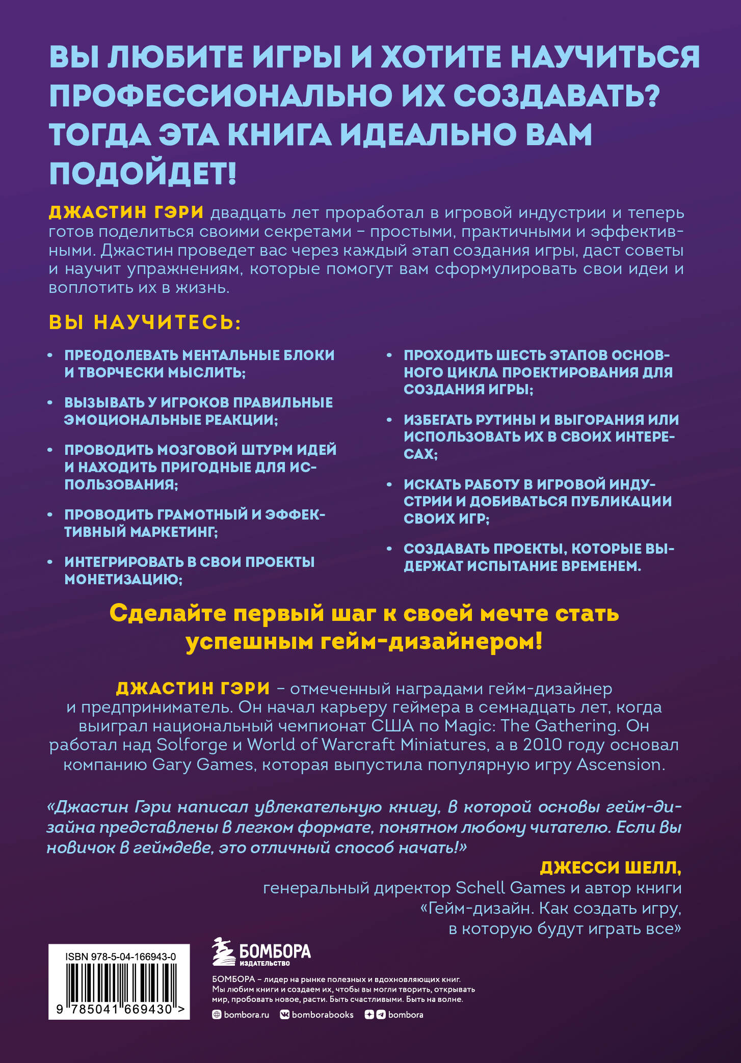 Вы любите игры и хотите научиться профессионально их создавать? Тогда эта книга идеально вам подойдет! Джастин Гэри двадцать лет проработал в игровой индустрии и теперь готов поделиться своими секретами - простыми, практичными и эффективными. Джастин проведет вас через каждый этап создания игры, даст советы и научит упражнениям, которые помогут вам сформулировать свои идеи и воплотить их в жизнь. Вы научитесь: • преодолевать ментальные блоки и творчески мыслить; • вызывать у игроков правильные эмоциональные реакции; • проводить мозговой штурм идей и находить пригодные для использования; • проходить шести этапов основного цикла проектирования для создания игры; • интегрировать в свои проекты монетизацию; • избегать рутины и выгорания или использовать их в своих интересах; • искать работу в игровой индустрии и добиваться публикации своих игр; • проводить грамотный и эффективный маркетинг; • создавать проекты, которые выдержат испытание временем. Сделайте первый шаг к своей мечте стать успешным гейм-дизайнером! Джастин Гэри - отмеченный наградами гейм-дизайнер и предприниматель. Он начал карьеру геймера в семнадцать лет, когда выиграл национальный чемпионат США по Magic: The Gathering. Он работал над Solforge и World of Warcraft Miniatures, а в 2010 году основал компанию Gary Games, которая выпустила популярную игру Ascension. «Джастин Гэри написал увлекательную книгу, в которой основы гейм-дизайна представлены в легком формате, понятном любому читателю. Если вы новичок в геймдеве, это отличный способ начать!» - Джесси Шелл, генеральный директор Schell Games и автор книги «Геймдизайн. Как создать игру, в которую будут играть все»