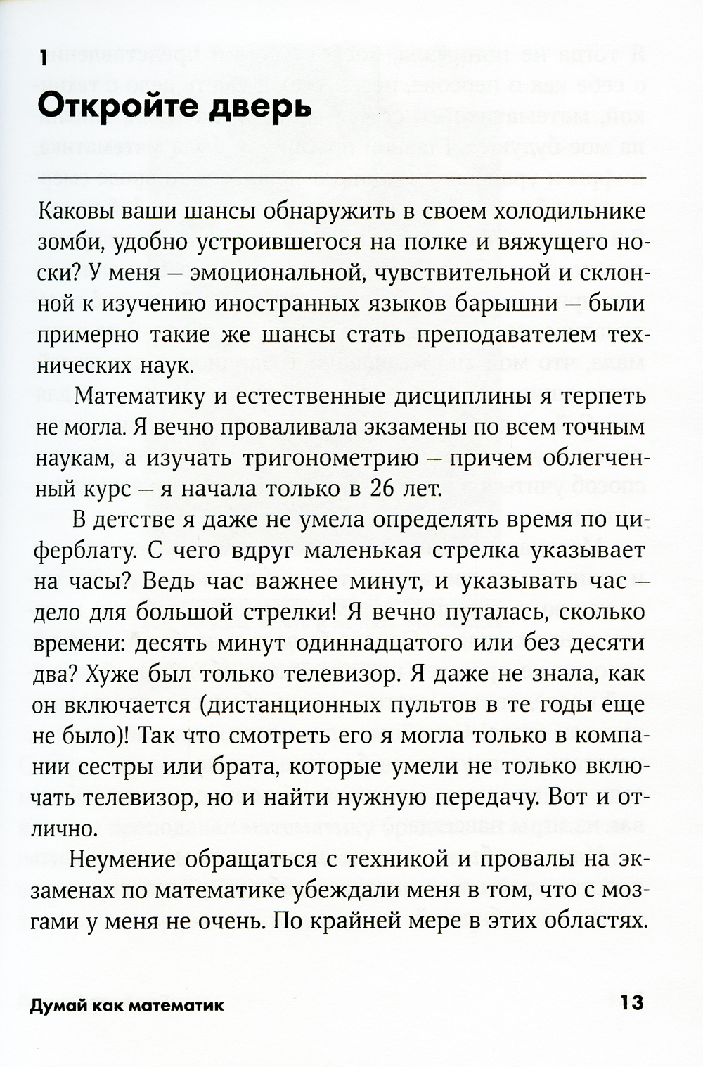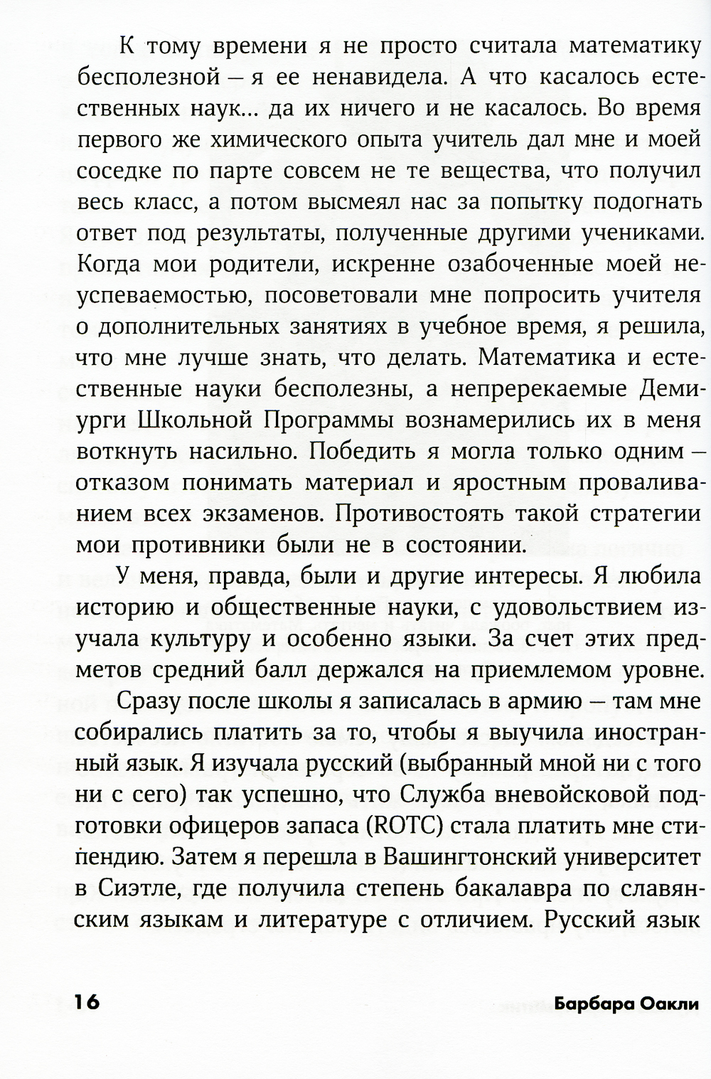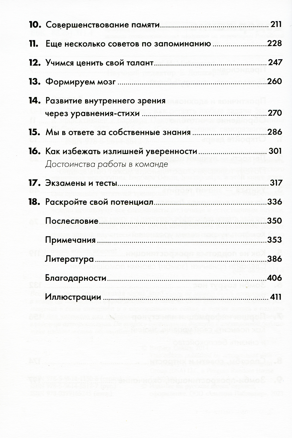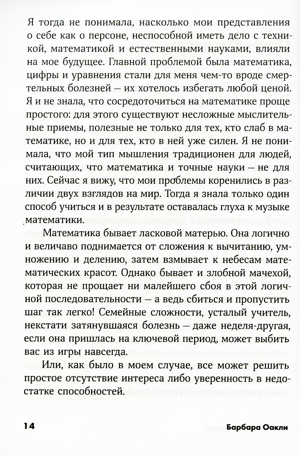 Принято считать, что математики - это люди, наделенные недюжинными интеллектуальными способностями, которые необходимо развивать с самого детства. И большинству точность и логичность математического мышления недоступны. Барбара Оакли, доктор наук, в этой книге доказывает, что изменить способ своего мышления можно, а порой и нужно. Она призывает читателей тренировать мозг и подтверждает конкретными примерами, что каждый может овладеть приемами, которые явно или неявно используют все специалисты по точным и естественным наукам. Прочитав эту книгу, вы научитесь эффективно решать задачи из любой области знаний; освоите метод интерливинга (чередование разных типов задач); научитесь «сжимать» ключевые идеи так, чтобы их было удобнее удержать в памяти, и узнаете о возможностях своего мозга очень много нового!