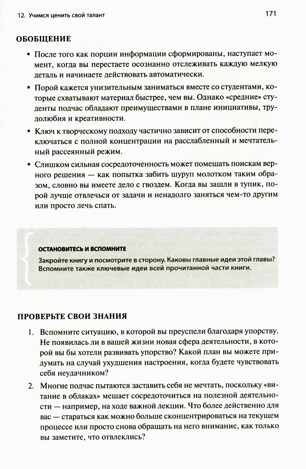 Принято считать, что математики - это люди, наделенные недюжинными интеллектуальными способностями, которые необходимо развивать с самого детства. И большинству точность и логичность математического мышления недоступна. Барбара Оакли, доктор наук, в этой книге доказывает, что изменить способ своего мышления можно, а порой и нужно. Она призывает читателей тренировать мозг и подтверждает конкретными примерами, что каждый может овладеть приемами, которые явно или неявно используют все специалисты по точным и естественным наукам. Прочитав эту книгу, вы научитесь эффективно решать задачи из любой области знаний; освоите метод интерливинга (чередование разных типов задач); научитесь «сжимать» ключевые идеи так, чтобы их было удобнее удержать в памяти, и узнаете о возможностях своего мозга очень много нового!| Издательство | Альпина Паблишер |
