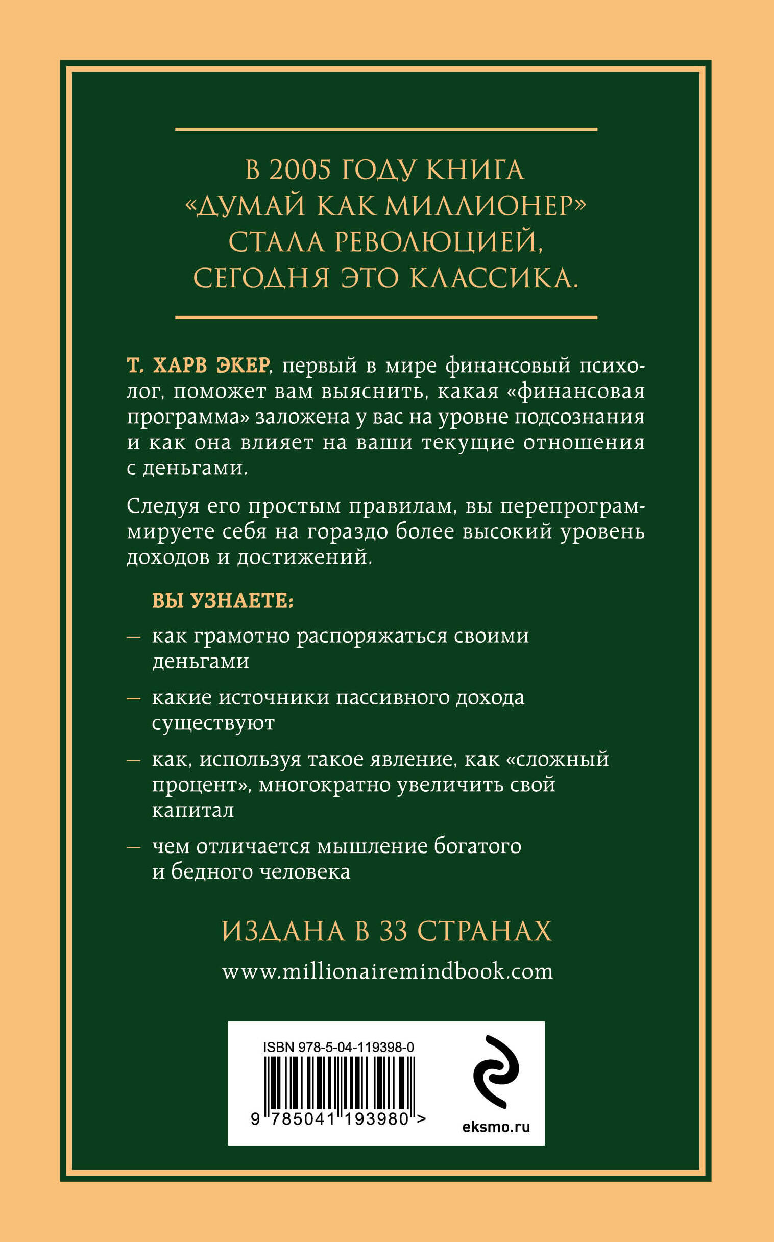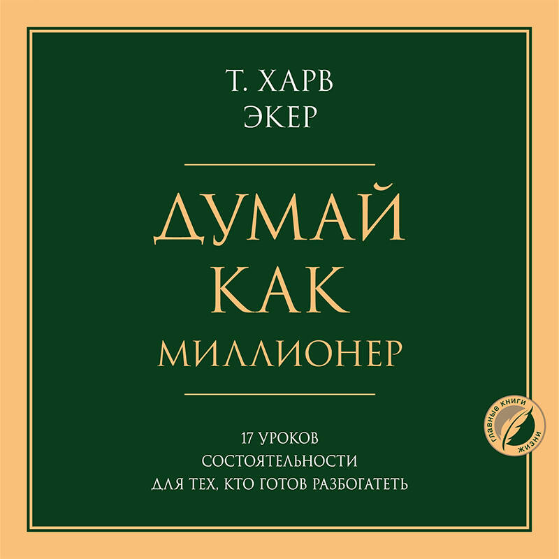 «Главные книги жизни» - это лучшие книги по психологии и саморазвитию, которые признал весь мир и успели оценить десятки и сотни тысяч читателей в России. Вдохновляйтесь, меняйтесь, действуйте - вы на верном пути! Ведь книги, как и люди, приходят в нашу жизнь не случайно! ПОЧЕМУ МЫ РЕШИЛИ ИЗДАТЬ ЭТУ КНИГУ Есть много замечательных американских систем «как разбогатеть», которые базируются на принципе «взял ипотеку - купил недвижимость - сдал в аренду - плата за аренду превышает ваши ежемесячные выплаты по кредиту - вы не только выплачиваете ипотеку чужими руками, но и получаете прибыль». К сожалению, российские ипотечные условия сильно отличаются от американских, и разбогатеть, набрав в кредиты объекты недвижимости, смогут лишь самые смелые и ушлые инвесторы. Книга «Думай как миллионер» не предлагает никаких авантюрных схем с чужими деньгами. Харв Экер, ваш финансовый психолог и консультант, работает с тем, что вы имеете на данный момент: вашими укоренившимися убеждениями относительно денег и вашим текущим доходом, которым вы научитесь распоряжаться так, чтобы жить в достатке сегодня и стать финансово свободным и независимым человеком в скором будущем. Результаты ошеломят вас. «КТО ТАКОЙ, ЧЕРТ ВОЗЬМИ, ЭТОТ ХАРВ ЭКЕР И ПОЧЕМУ Я ДОЛЖЕН ЧИТАТЬ ЕГО КНИГУ?» (отрывок из книги) Неважно, где я выступаю - на радио или ТВ; узнают меня обычно по фразе: «Дайте мне пять минут, и я предскажу ваше финансовое будущее!» Когда-то я был неудачником и не раз начинал с нуля, а сегодня я весьма состоятельный человек и президент Peak Potentials Training, одной из самых быстро растущих и успешных тренинговых компаний в Северной Америке. Люди со всего мира приезжают на мой интенсивный курс «Думай как миллионер», и уже более 1 000 000 учеников увеличили свой уровень дохода благодаря новому мышлению. Возможно, я не объективен, но сейчас в ваших руках, пожалуй, самая выдающаяся книга о деньгах, которую вам приходилось читать. И я отдаю себе отчет в том, что это довольно смелое заявление. На самом деле, речь в книге идет о том, чего обычно не хватает людям, чтобы воплотить в реальность свои мечты об успехе. А мечты и реальность, как вы уже, наверное, знаете, - это совершенно разные вещи. Вы, конечно, читали другие книги, покупали аудиозаписи, ходили на специальные курсы и узнали много методик обогащения, например в сфере недвижимости, рынка ценных бумаг или ведения бизнеса. К чему это привело? Да ни к чему! Во всяком случае большинство из вас! Вы получили временный заряд энергии - и вернулись на прежние позиции. Выход, наконец, найден. Он прост, закономерен и очевиден. И сводится к одной простой идее: если заложенная в вашем подсознании «финансовая программа» не «настроена» на успех, что бы вы ни учили, какими бы знаниями ни обладали и что бы ни делали - вы обречены на неудачу. Изучайте эту книгу так, словно от этого зависит ваша судьба. Из нее вы узнаете, почему одним суждено быть богатыми, а другим - бороться за существование. Вы поймете истинные причины успеха, среднего достатка и финансовых неудач и начнете менять свое финансовое будущее к лучшему. Узнаете, как детские впечатления влияют на нашу финансовую программу, как они приводят к пораженческим настроениям и привычкам. Вы познакомитесь с «волшебными» декларациями, и благодаря им на смену пессимистическому образу мыслей придет «бога