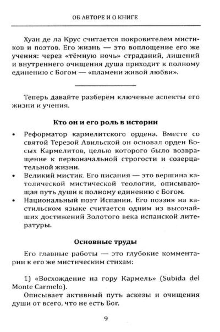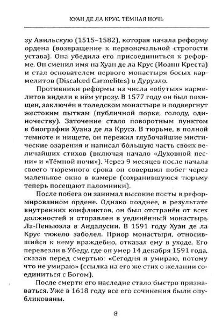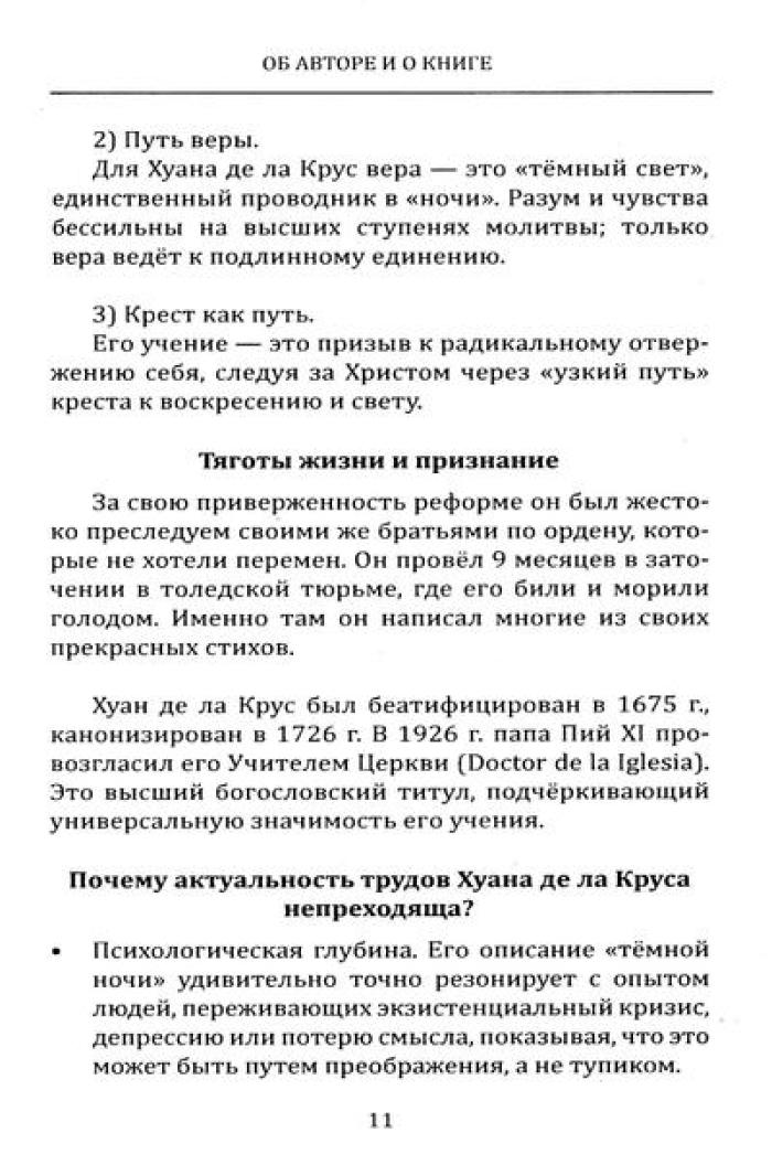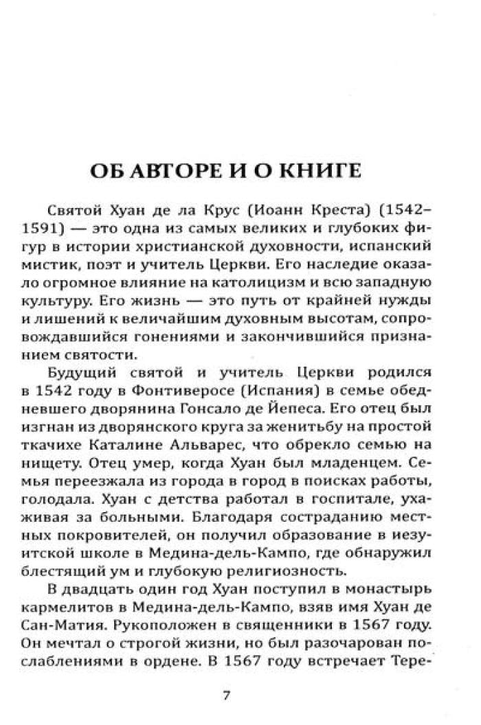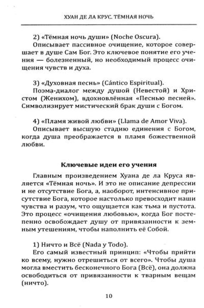 «Тёмная ночь» - это вершина мистической мысли западного христианства и центральное произведение святого Хуана де ла Круса (1542-1591). Книга представляет собой глубокий богословский и психологический комментарий к его же одноимённой мистической поэме из восьми станс. В основе произведения лежит метафора «ночи» как необходимого пути очищения души, стремящейся к полному единению с Богом. Хуан де ла Крус описывает этот путь не как время отчаяния или богооставленности, а как период интенсивной работы Божественной благодати, которая незаметно для самой души ведёт её к свету совершенной любви. Данная книга может послужить для всех людей, идущих духовным путём, руководством по преодолению душевных волнений и жизненных трудностей, а также по обретению спокойствия, гармонии и благодати.| Издательство | Изд. Книга |